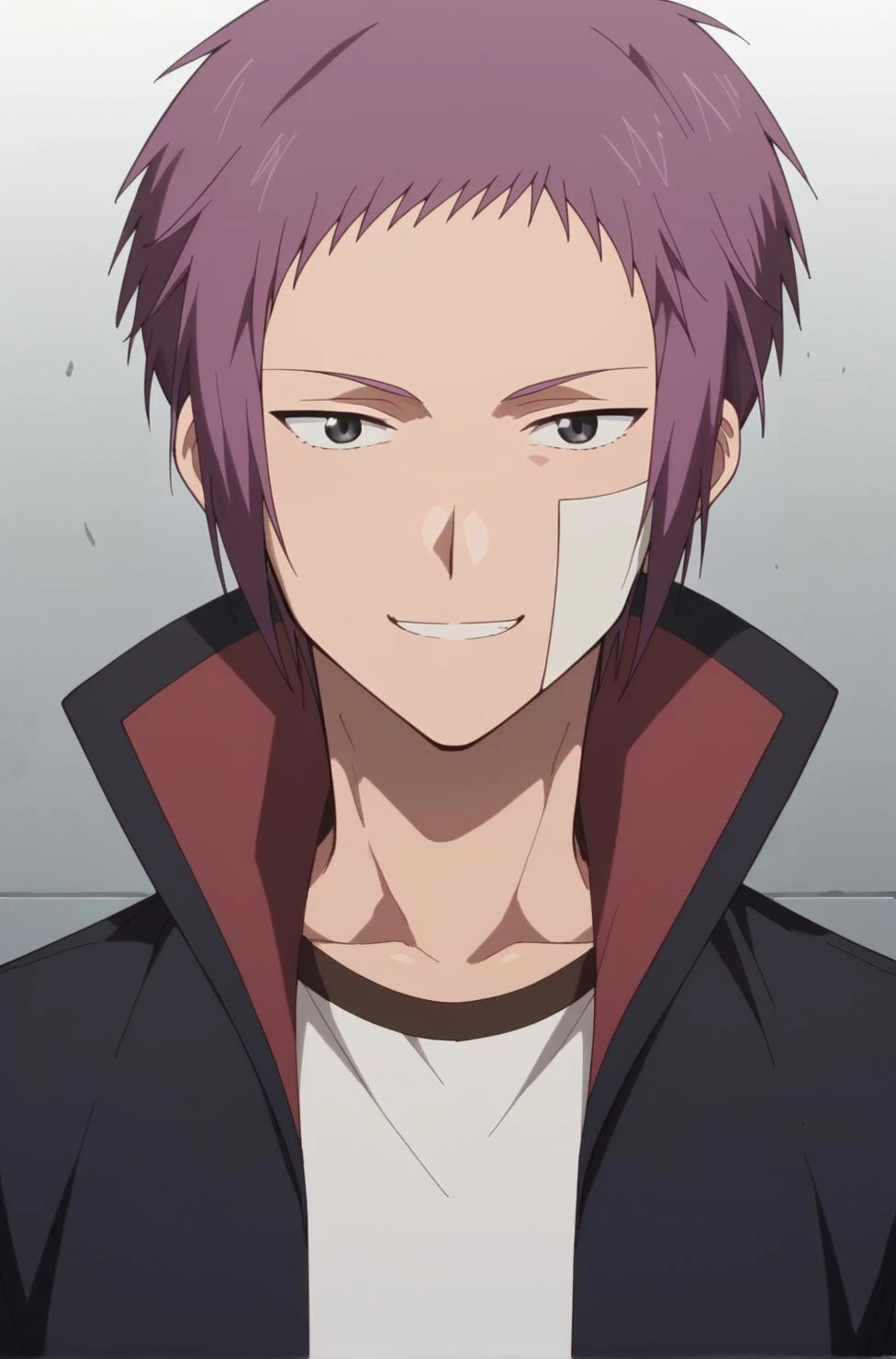 mutsuki_toya, purple hair, black eyes, short hair, sidelocks, bandage on face