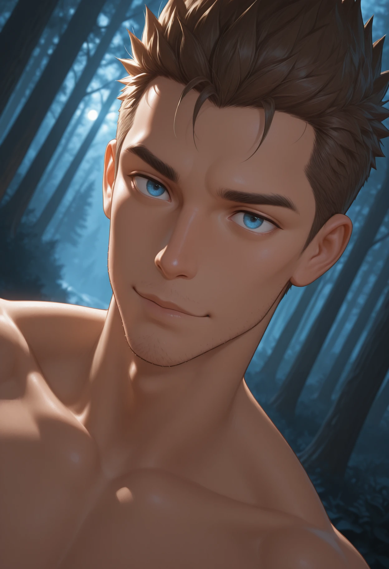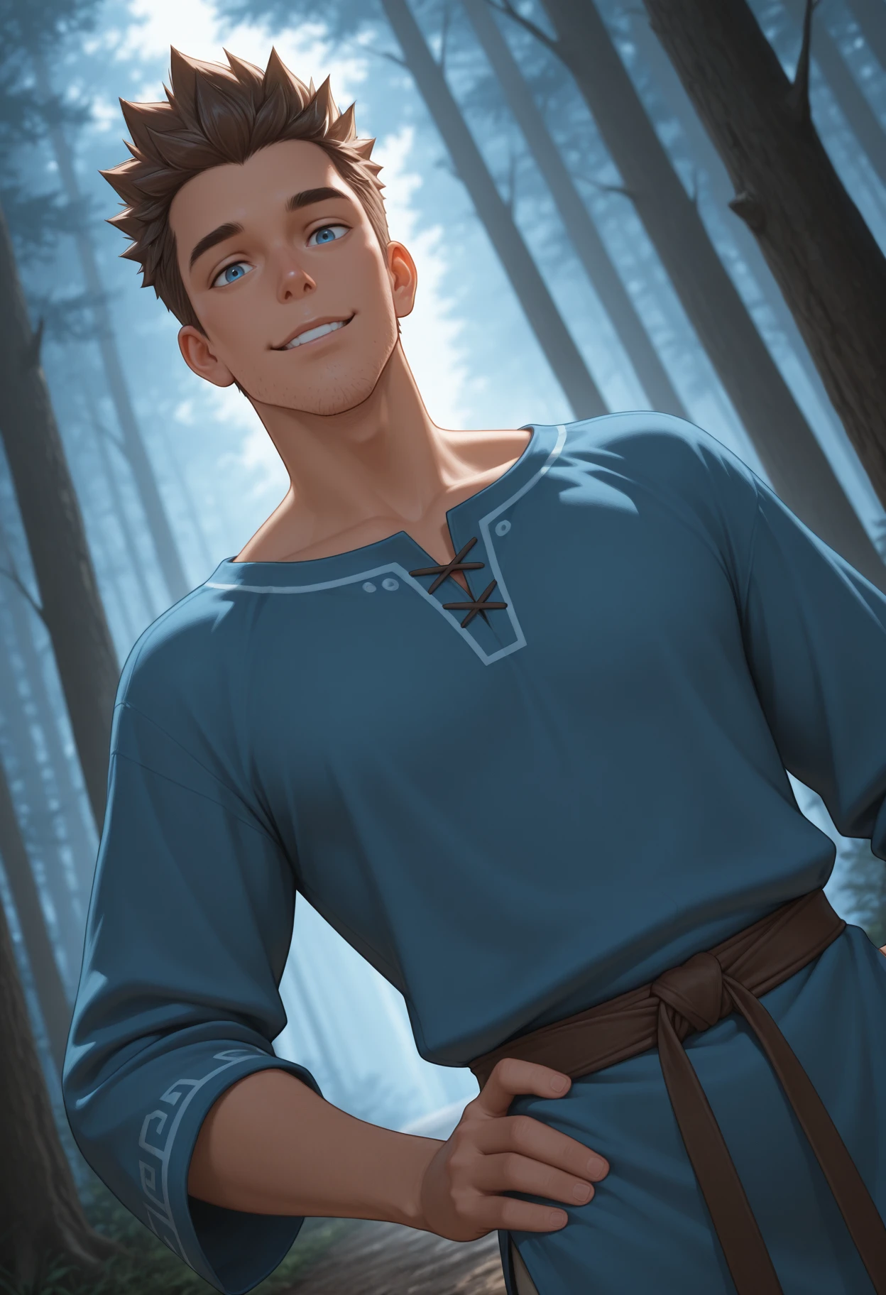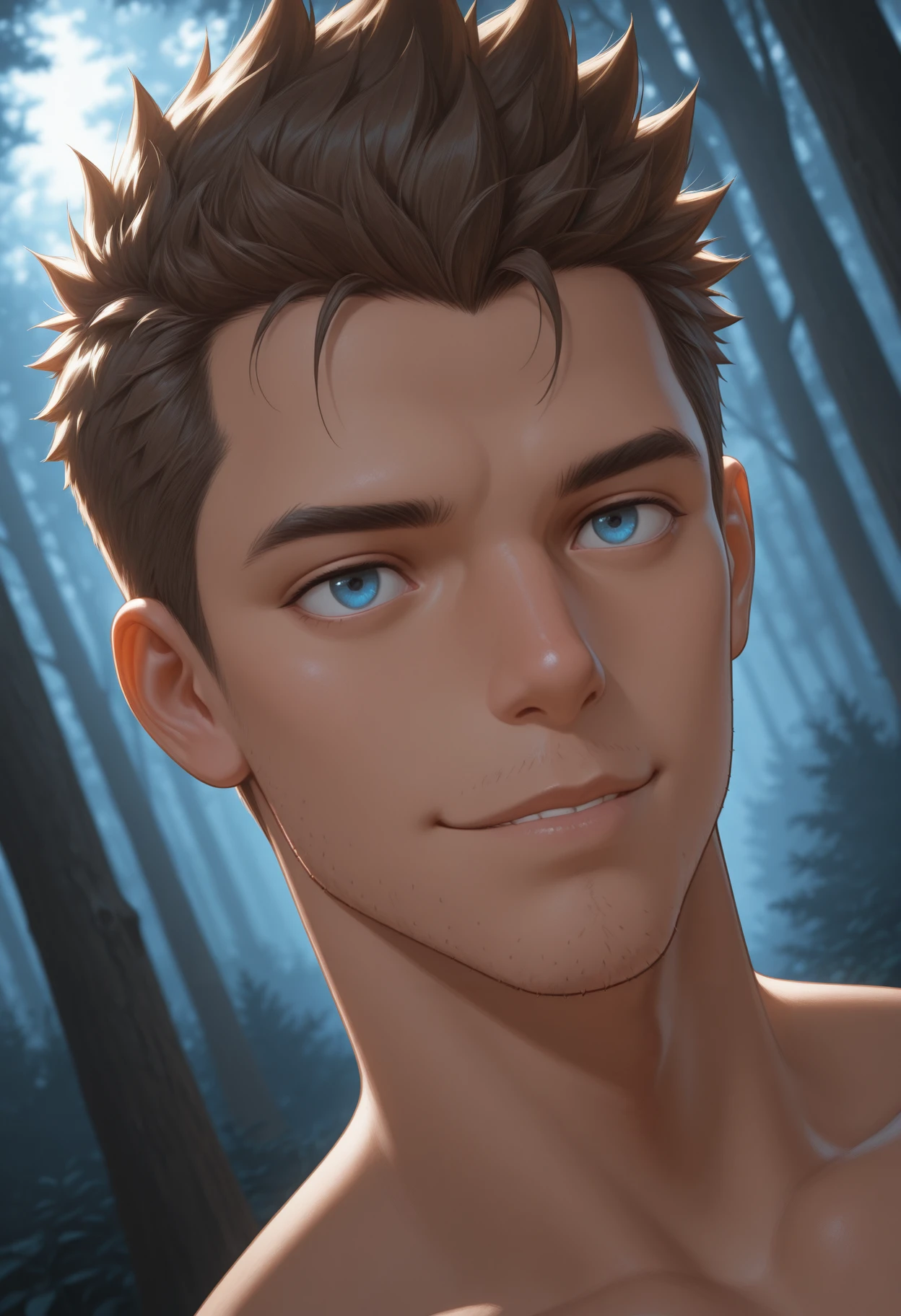 Spencer, fair-skinned man, blue eyes, brown hair, spiked hair, widows peak, light stubble, lean male