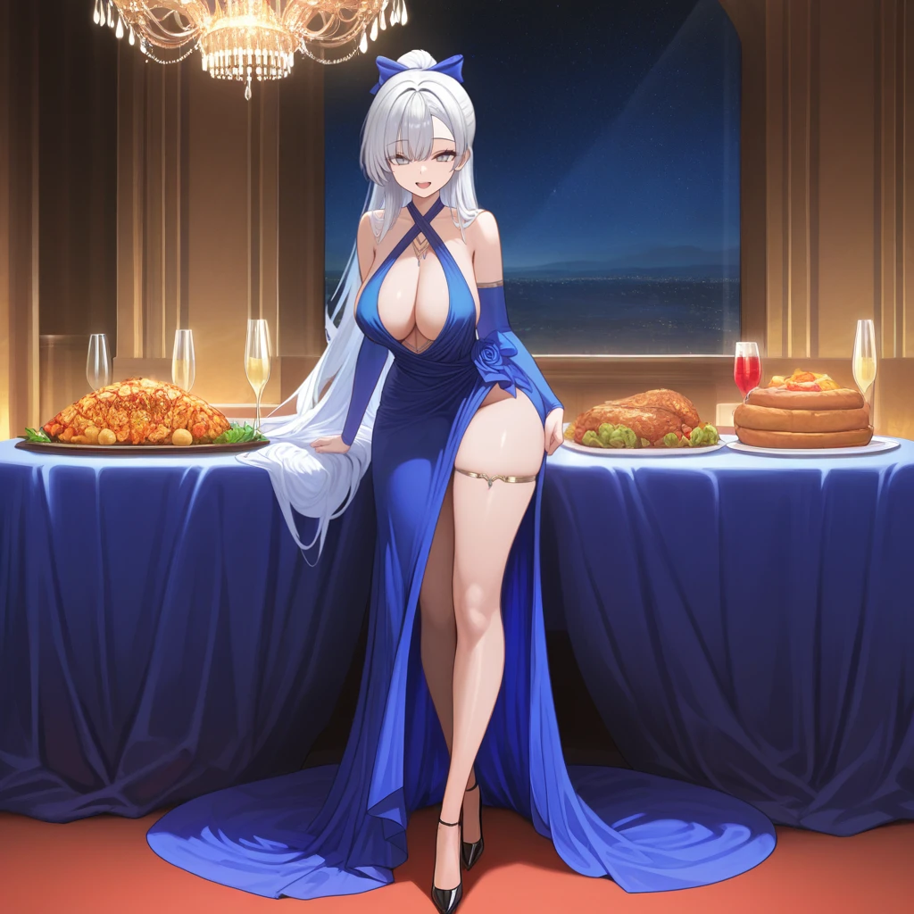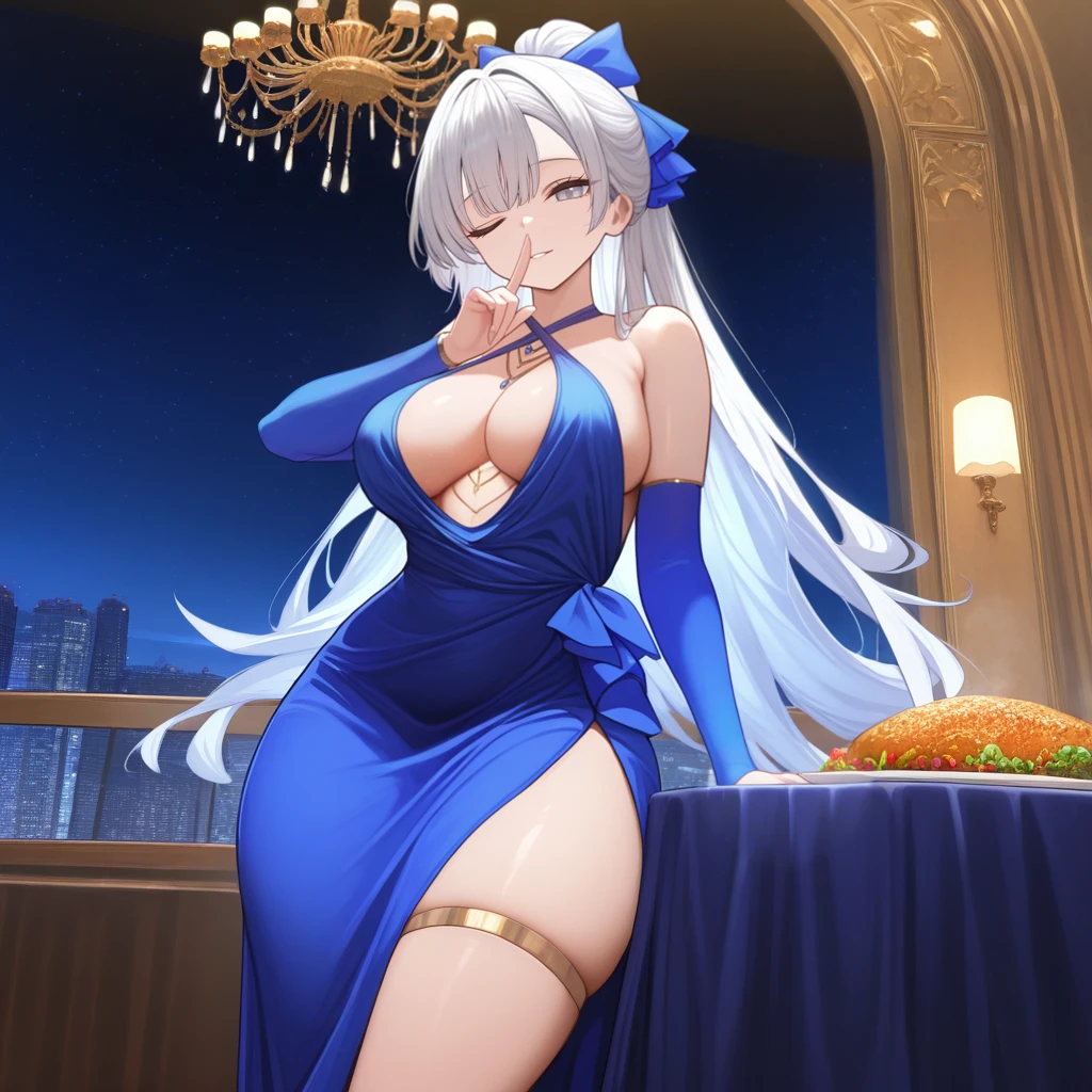 ArgusAzur, Arg_Drs, silver hair, grey eyes, long hair, blue dress, plunging neckline, halter dress, criss-cross halter, jewelry, cleavage, sideboob, center cutout, blue bow, long dress, side slit, detached sleeves, blue sleeves, thighlet, ponytail, hair bow,P.S: I gotta admit her Default outfit is the first Azur Lane Outfit, which impressed me. It looks great and it has proper complexity, but not complex enough where you would have no idea what's going on. Just Spot on basically.