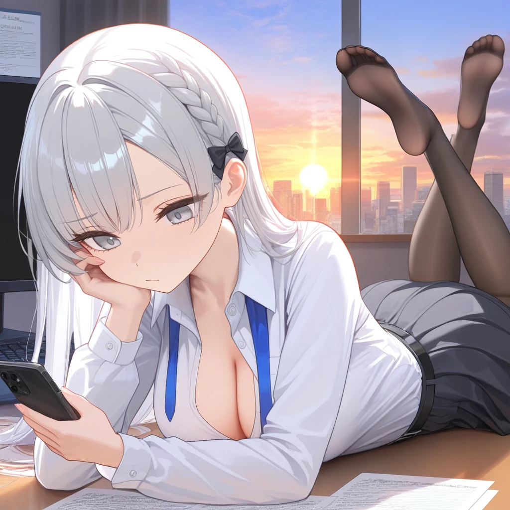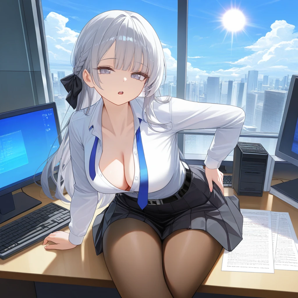 ArgusAzur, Arg_Slp, silver hair, grey eyes, long hair, partially unbuttoned, collared shirt, dress shirt, white shirt, cleavage peek, undone tie, blue tie, black skirt, pleated skirt, black belt, long sleeves, white sleeves, white wrist cuffs, black bow, hair bow, braid, collarbone, brown pantyhose,Cerulean Enthrallment Outfit: