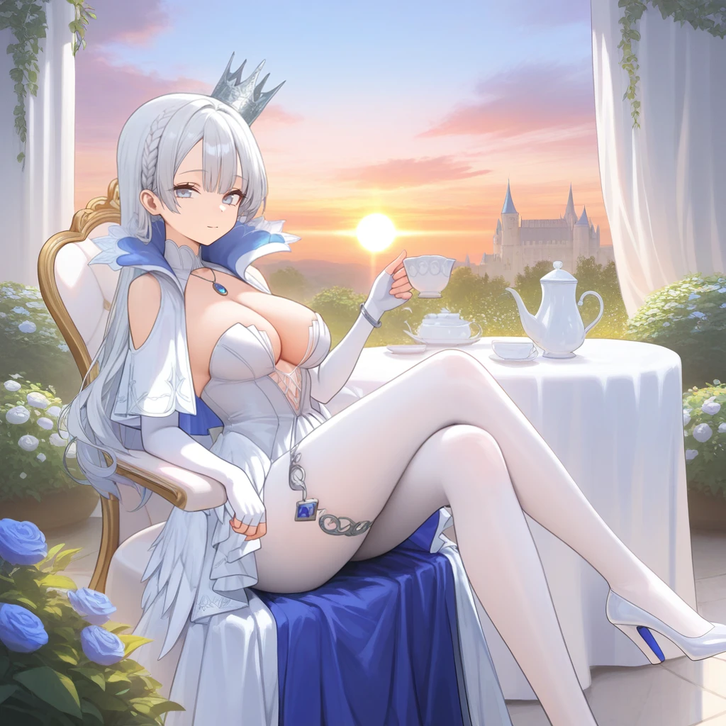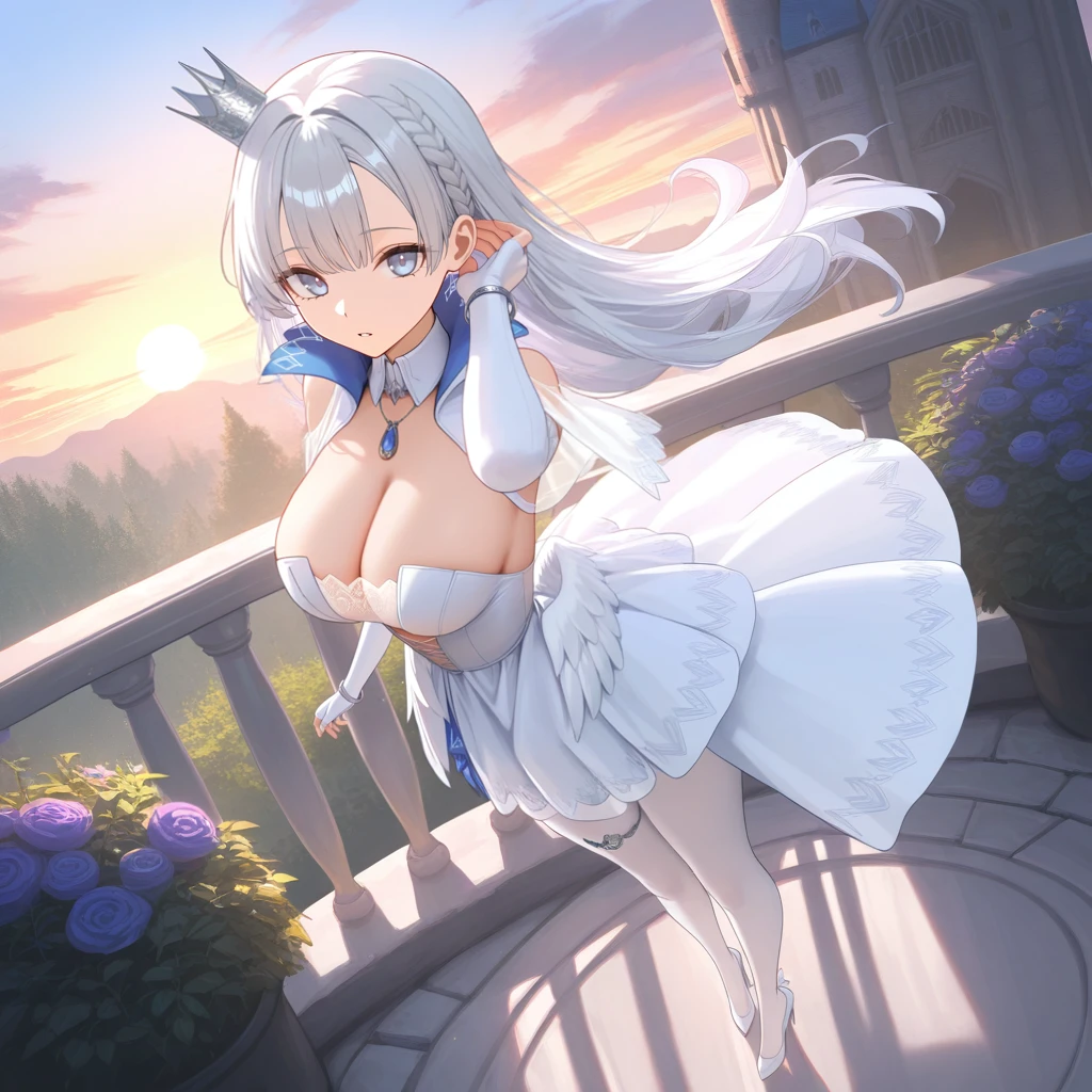 ArgusAzur, Arg_Def, silver hair, grey eyes, long hair, strapless dress, white dress, white corset, cross-laced corset, open corset, white bodystocking, bodystocking under clothes, cleavage, shrug (clothing), white shrug, sleeveless shrug, see-through capelet, white capelet, collared capelet, blue high collar, shoulder cutout, elbow gloves, white gloves, fingerless gloves, layered skirt, white skirt, white wings, thigh ornament, white pantyhose, bare shoulders, mini crown, silver jewelry, blue gemstone, necklace, braid, silver crown, bracelet, A Hundred Sleepless Eyes Outfit: