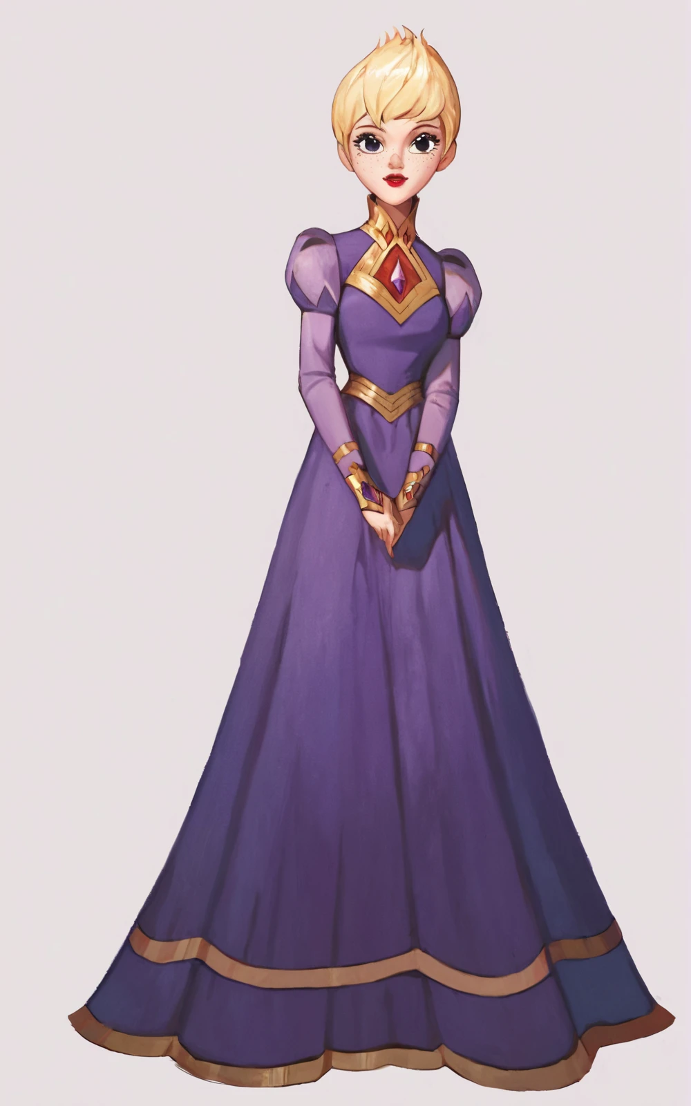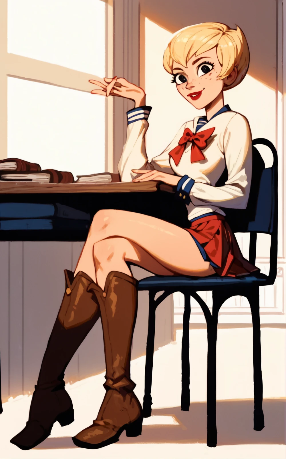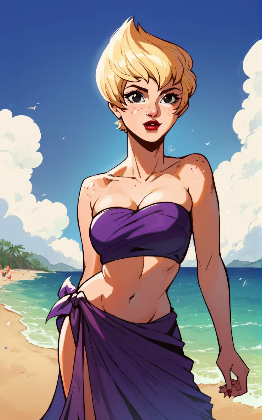 Reinforcement Tags: blonde hair, short hair, red lips, black eyes, lipstick, freckles