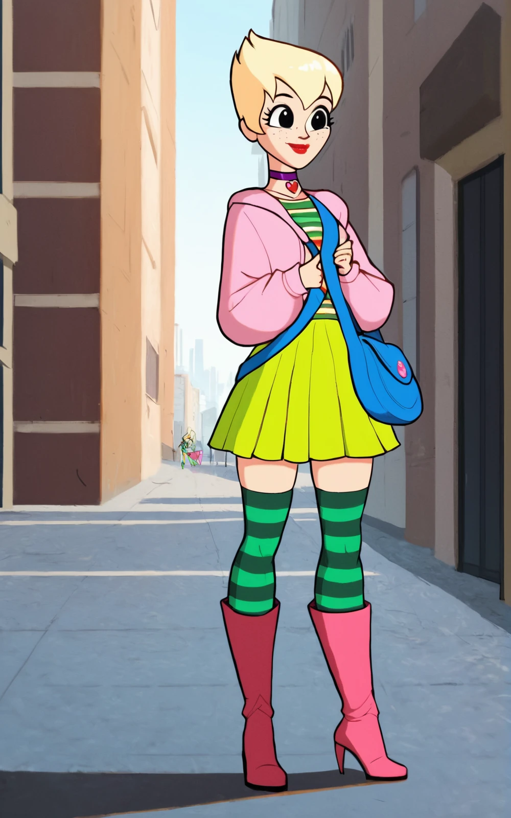 For her Outfit 2: boots, thighhighs, skirt,green skirt, choker, striped,high heels, multicolored clothes, knee boots,shirt,shoulder bag, jacket,pink jacket