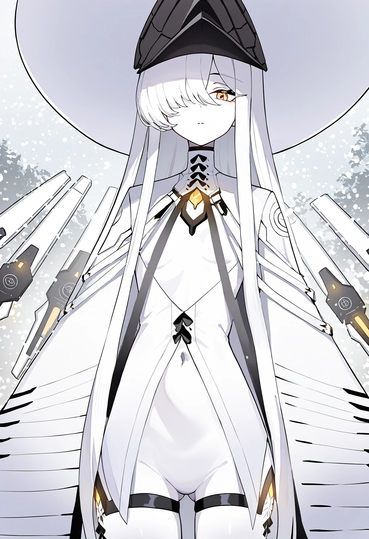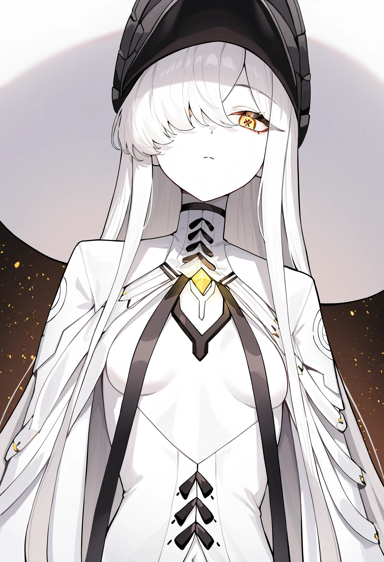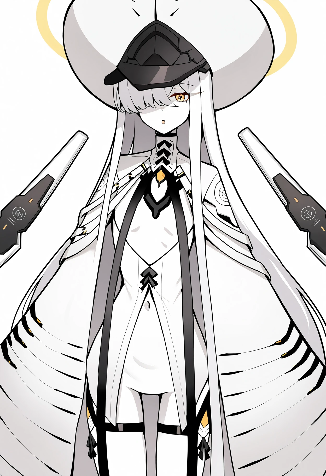Character: 1girl, malkuth \(blue archive\), yellow eyes, x-shaped pupils, symbol-shaped pupils, colored skin, white skin, white hair, hair over one eye, very long hair, sidelocks, hair between eyes, yellow halo, small breasts
