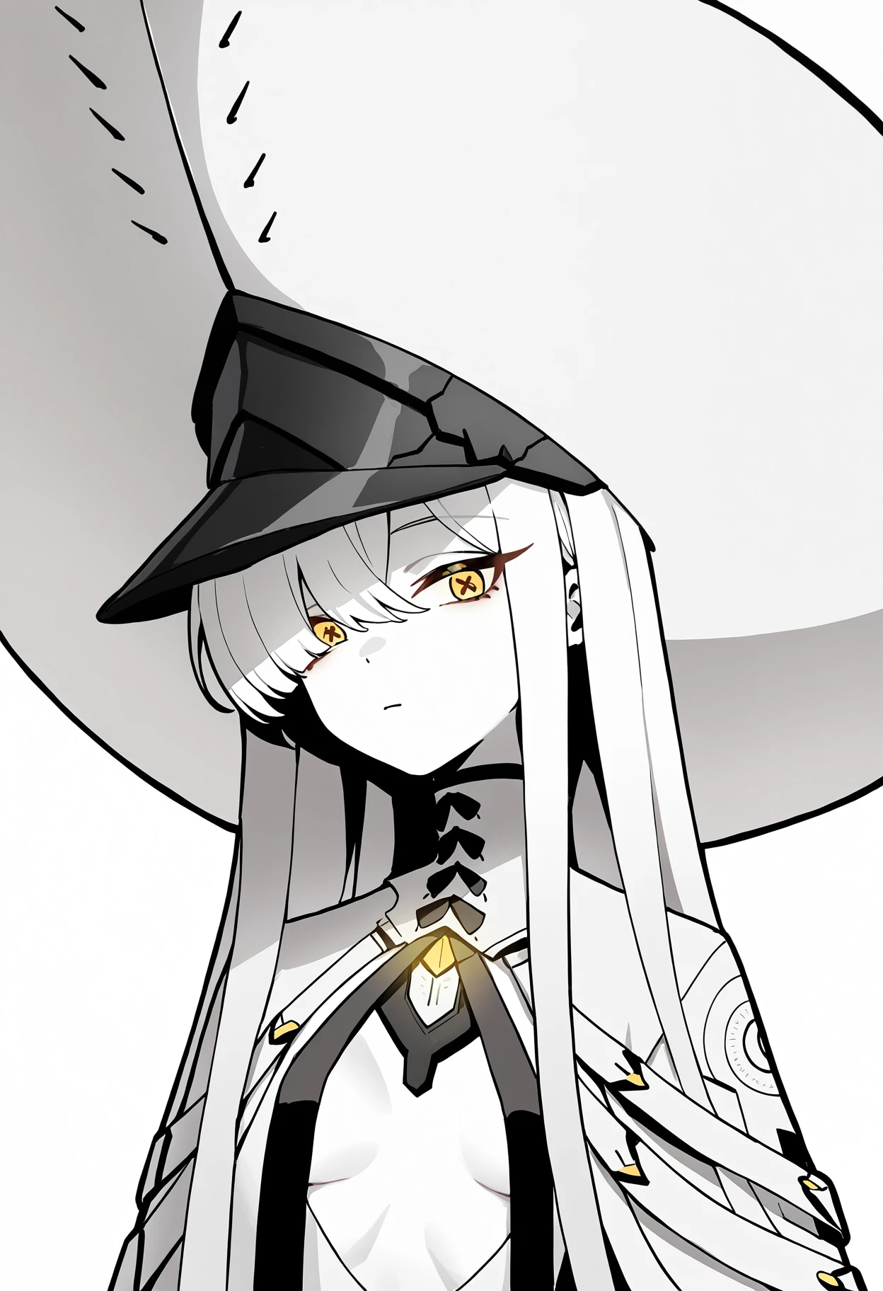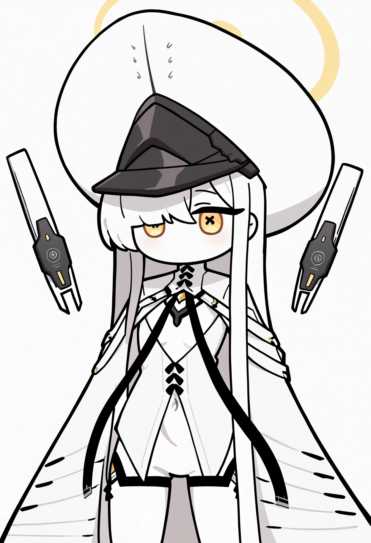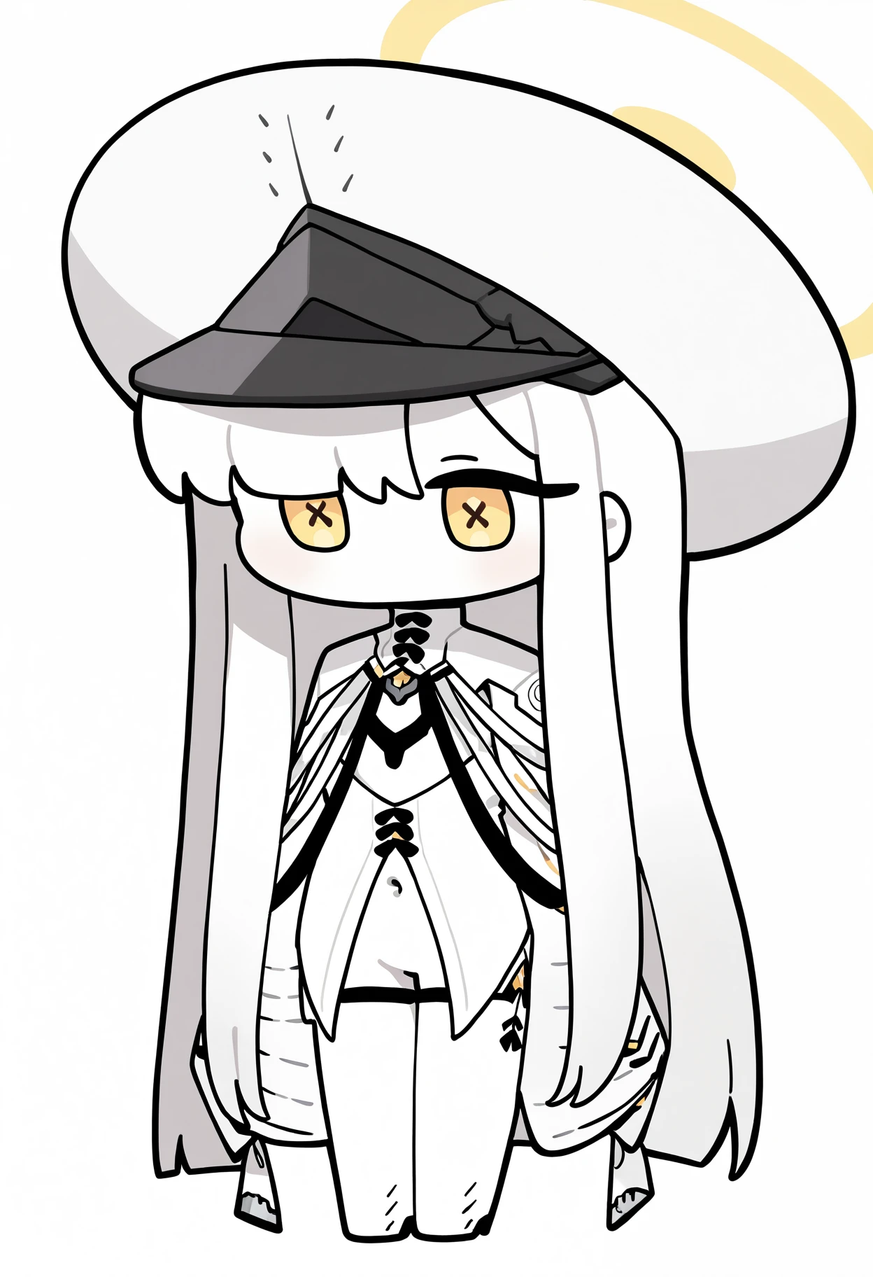 Character: 1girl, malkuth \(blue archive\), yellow eyes, x-shaped pupils, symbol-shaped pupils, colored skin, white skin, white hair, hair over one eye, very long hair, sidelocks, hair between eyes, yellow halo, small breasts