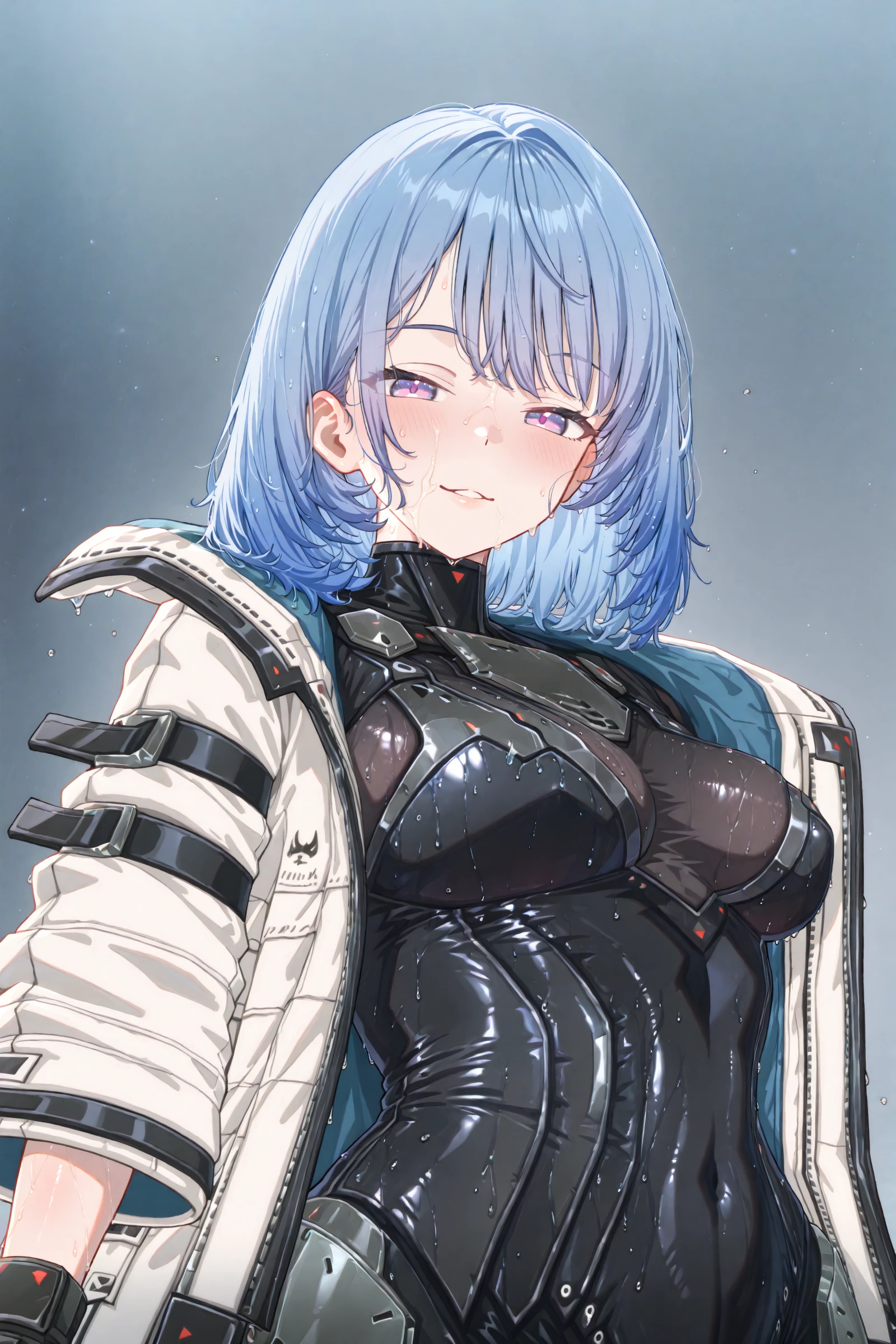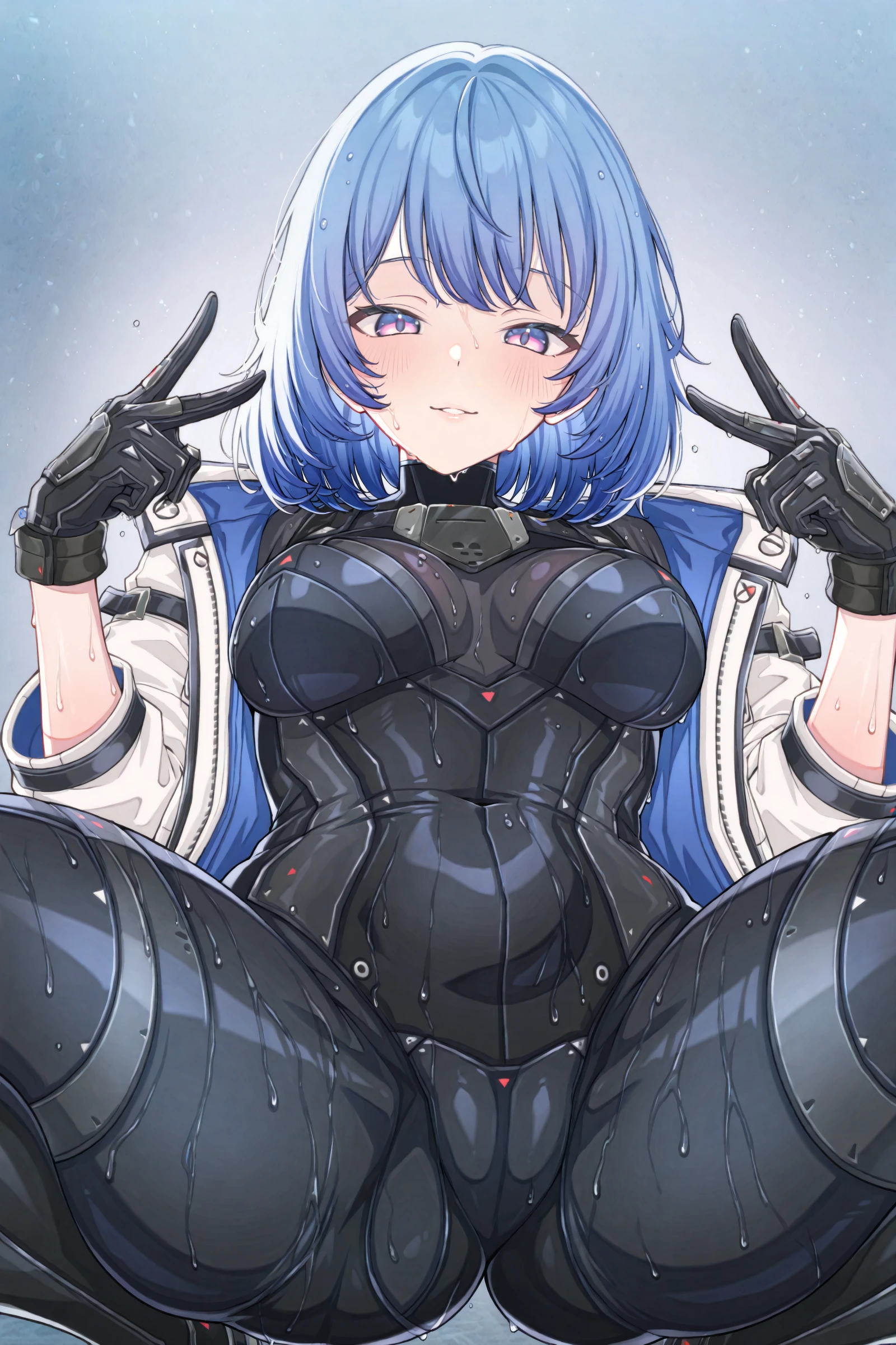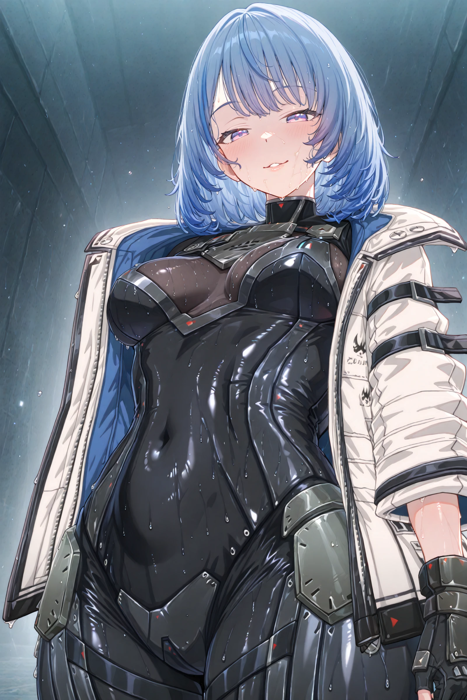 dariastarseed, 1girl, solo, purple eyes, jacket, white jacket, bodysuit, looking at viewer, blue hair, black bodysuit, open clothes, breasts, open jacket, closed mouth, gloves, short hair, bangs, black gloves, medium hair, medium breasts