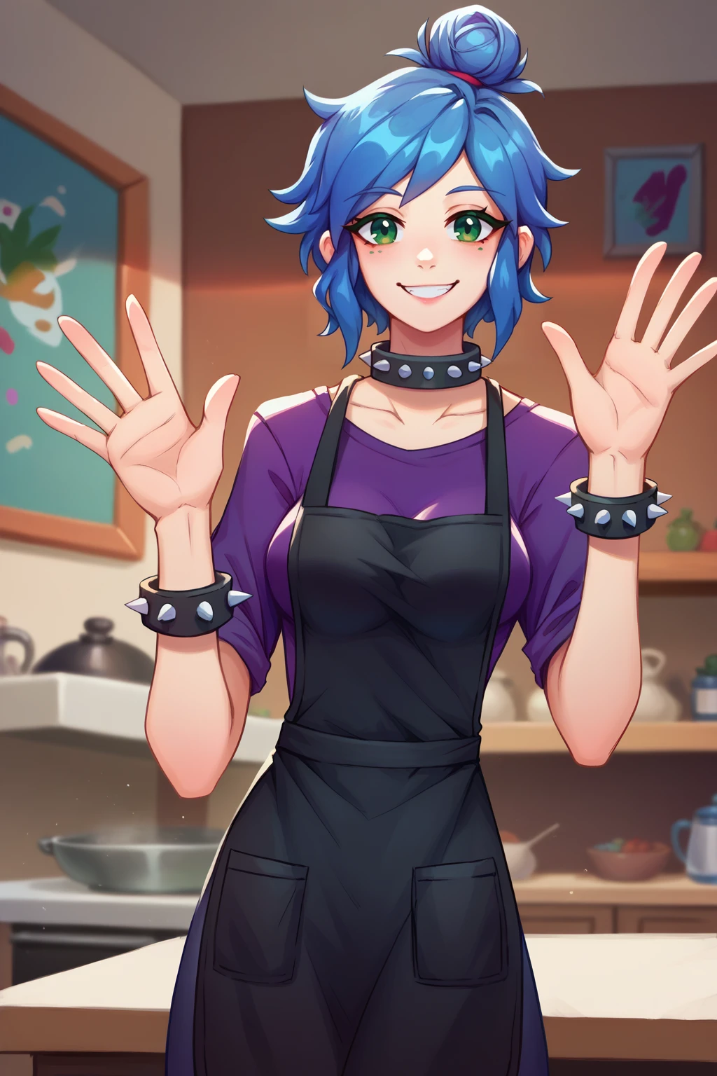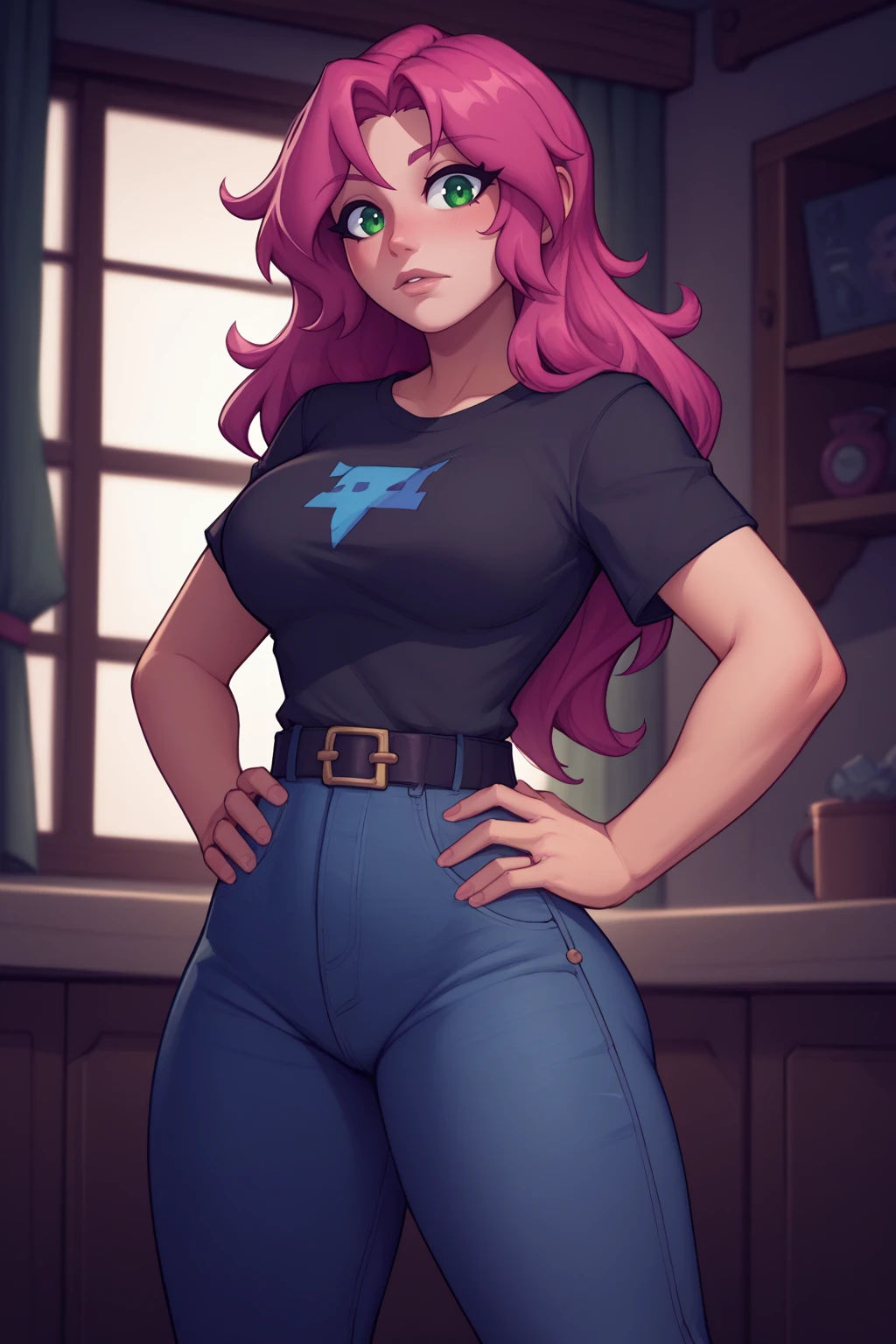 NSStylistTerraria, pink hair, long hair, green eyes, blue shirt, purple apron, jeans, spiked collar, spiked wristband, hairband, hair bow