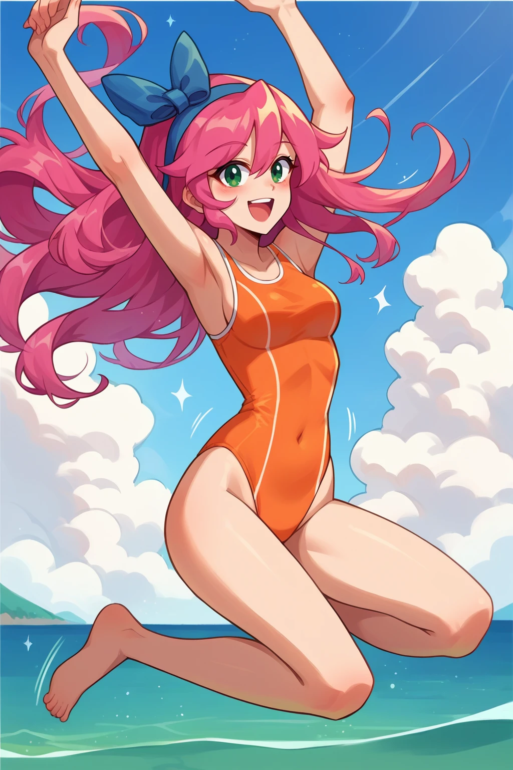 Main Prompt: NSStylistTerraria, pink hair, long hair, green eyes, hairband, hair bow