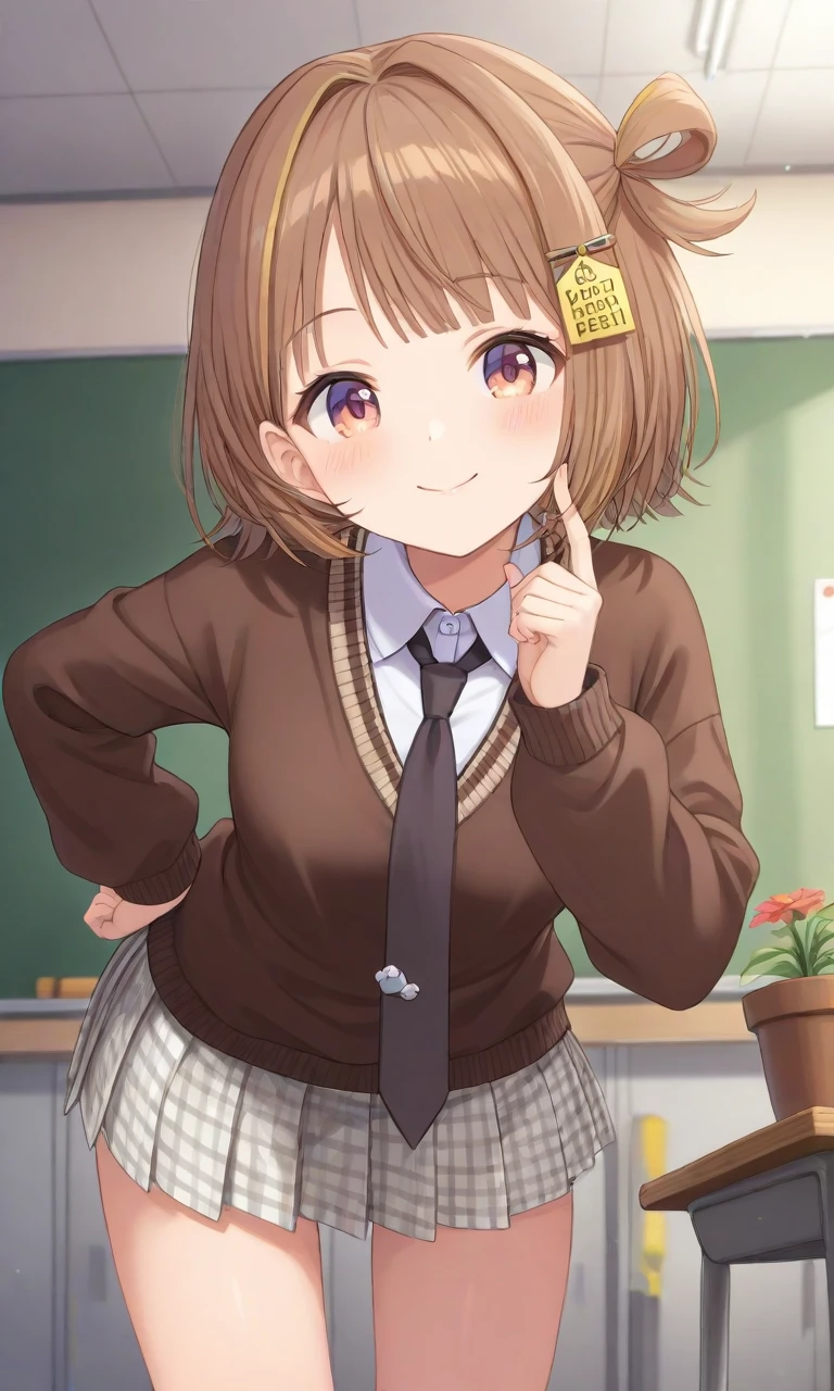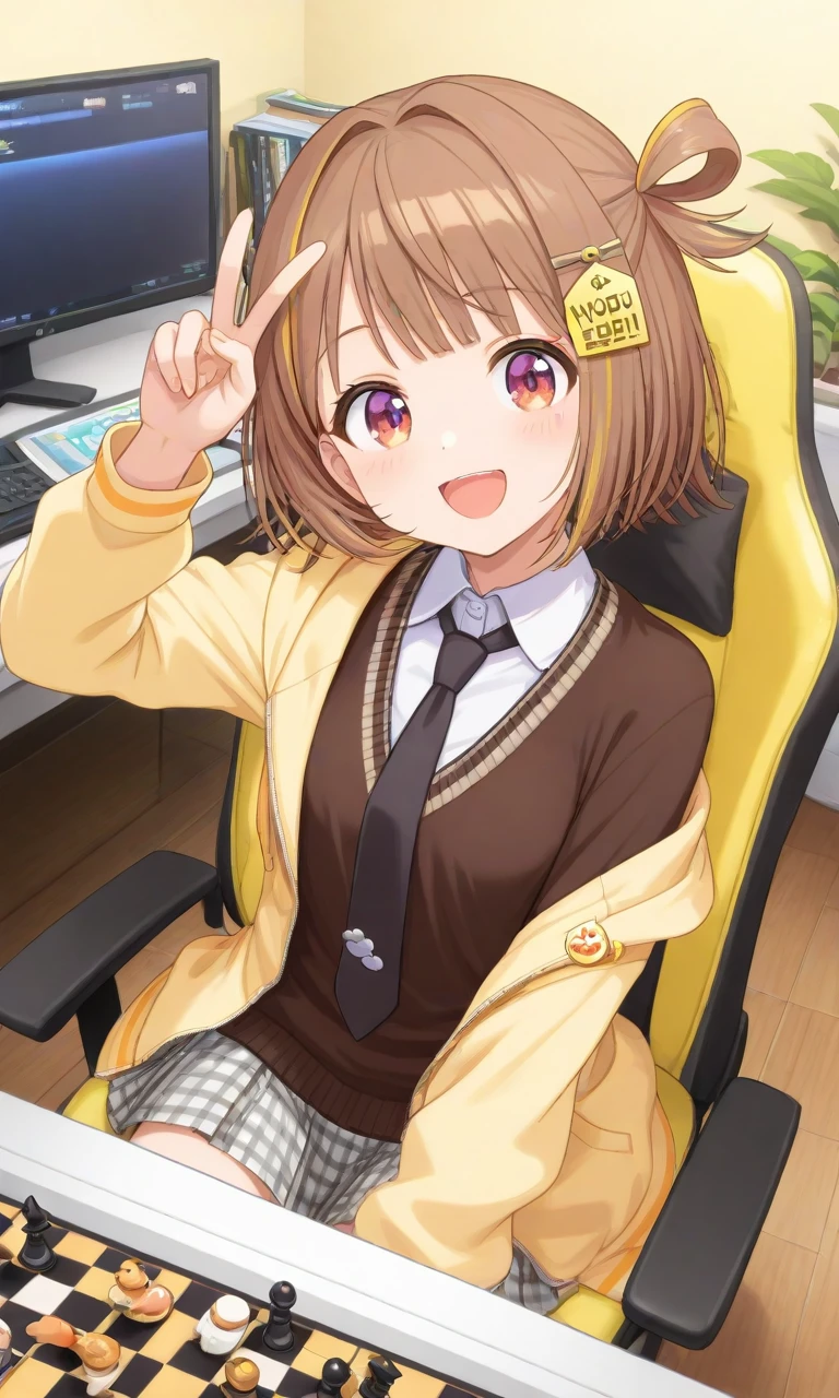 sendo yuuhi, short hair, hair rings, hair ornament, yellow jacket, brown sweater, collared shirt, black necktie, plaid skirt, loose socks, loafersYou can remove