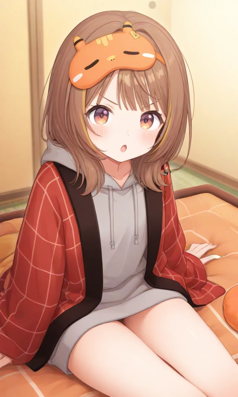 yuuhi second, medium hair, mask on head, sleep mask, hanten \(clothes\), grey hoodie, white shortsYou can remove