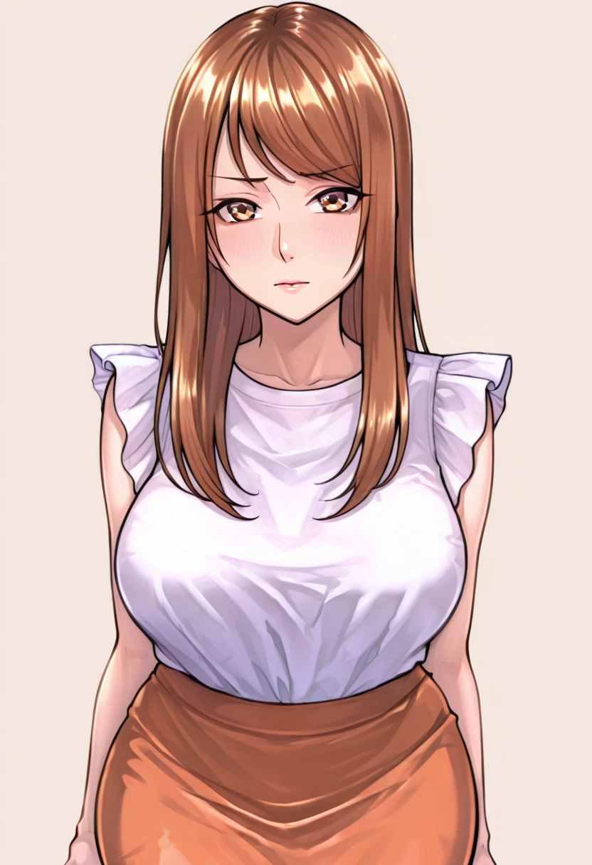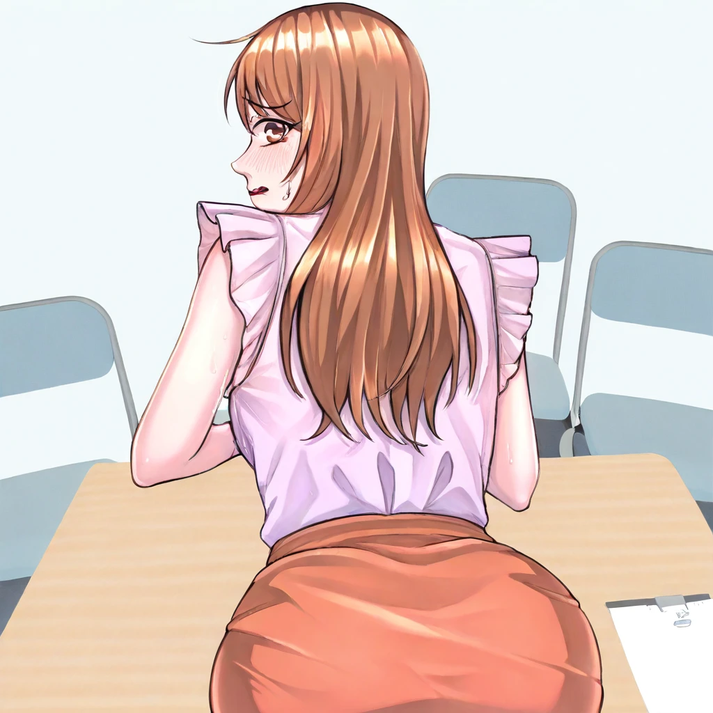 sleeveless shirt, light pink shirt, ruffled sleeves, orange skirt, pencil skirt, scalloped hem, purple footwear, high heels,