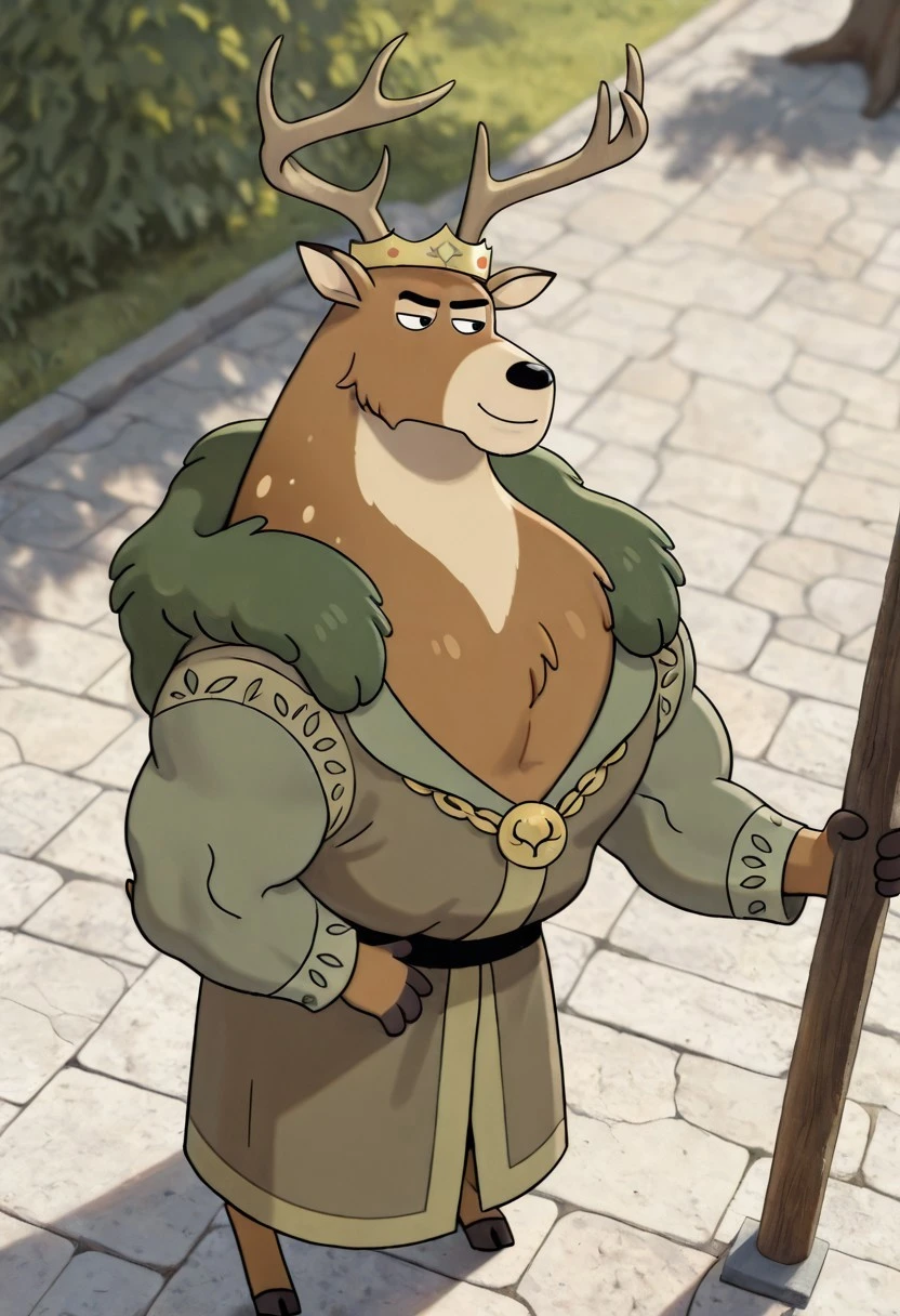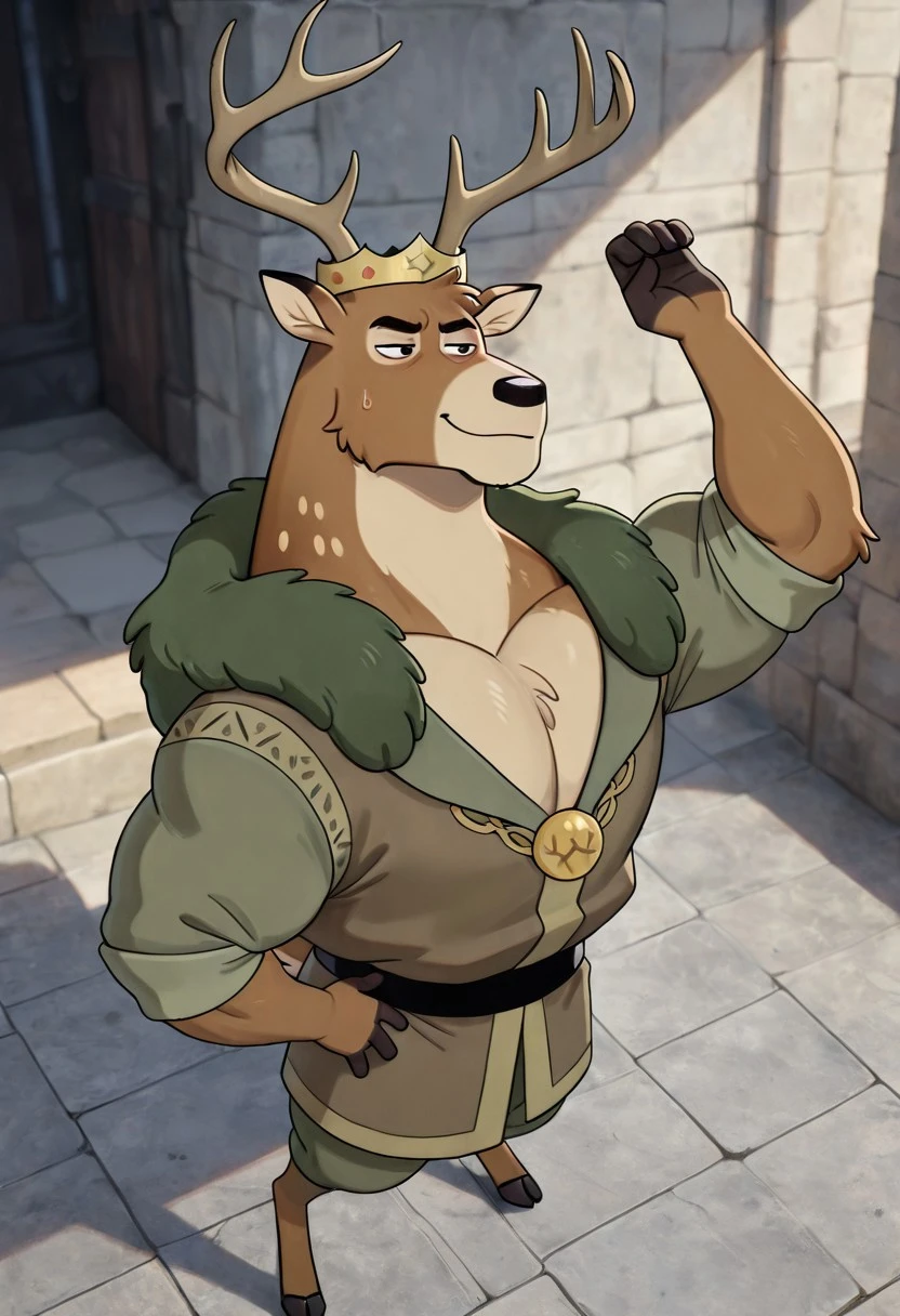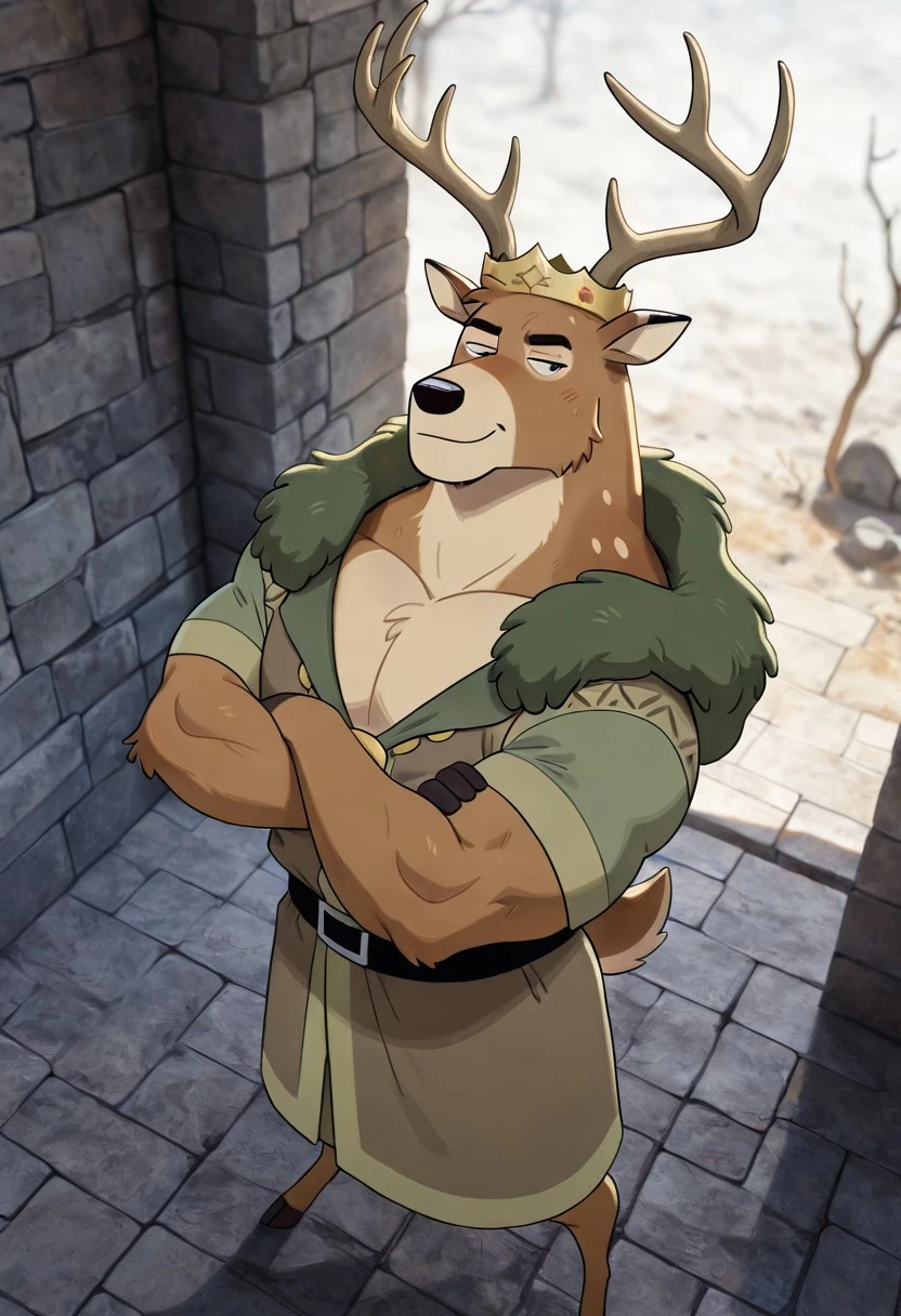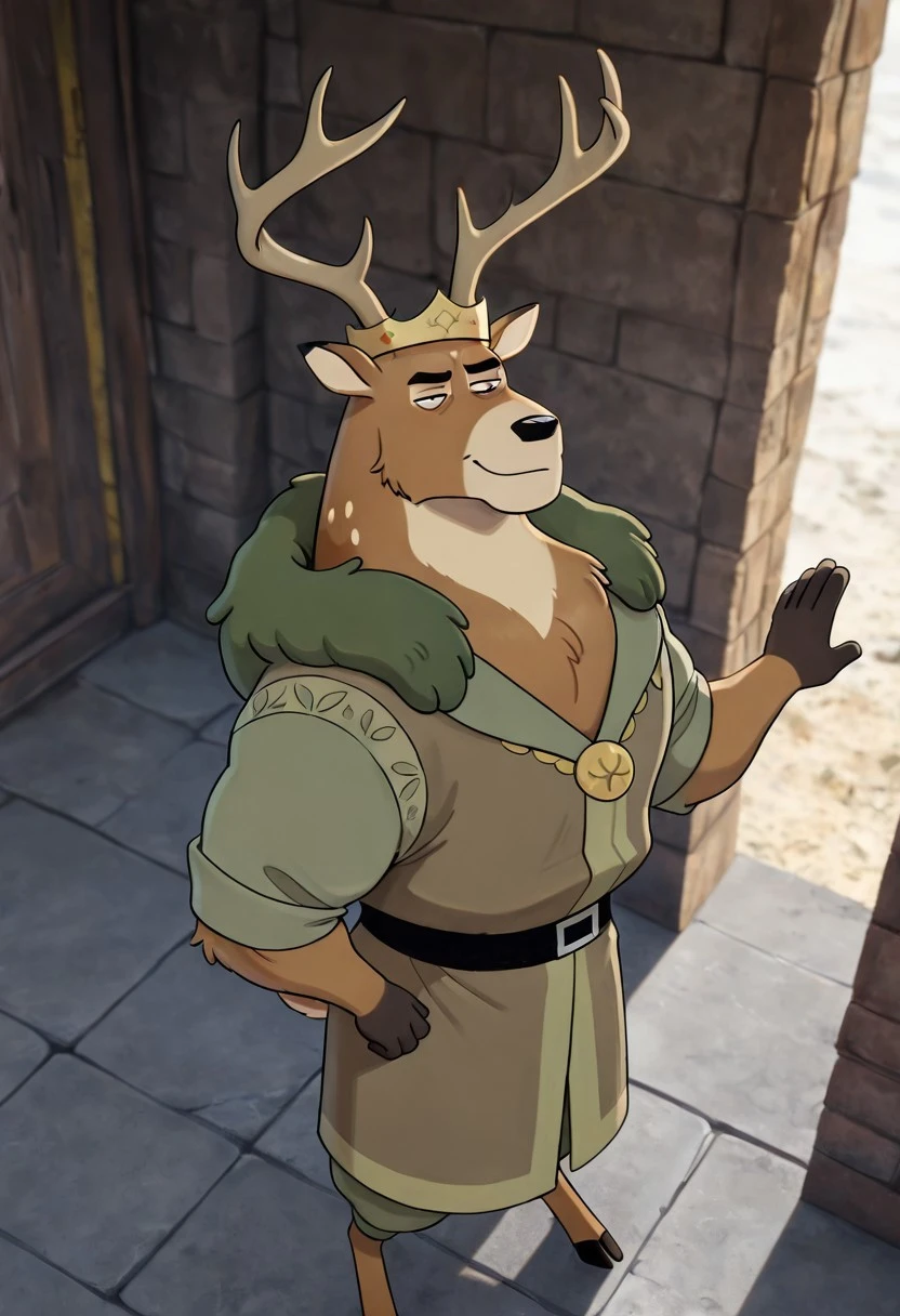 Knut(Ivandoe), Deer, furry, furry male, two-tone fur, brown fur, deer antlers, crown, fur-trimmed coat, green tunic, deer ears, head turf, deer tail, black belt