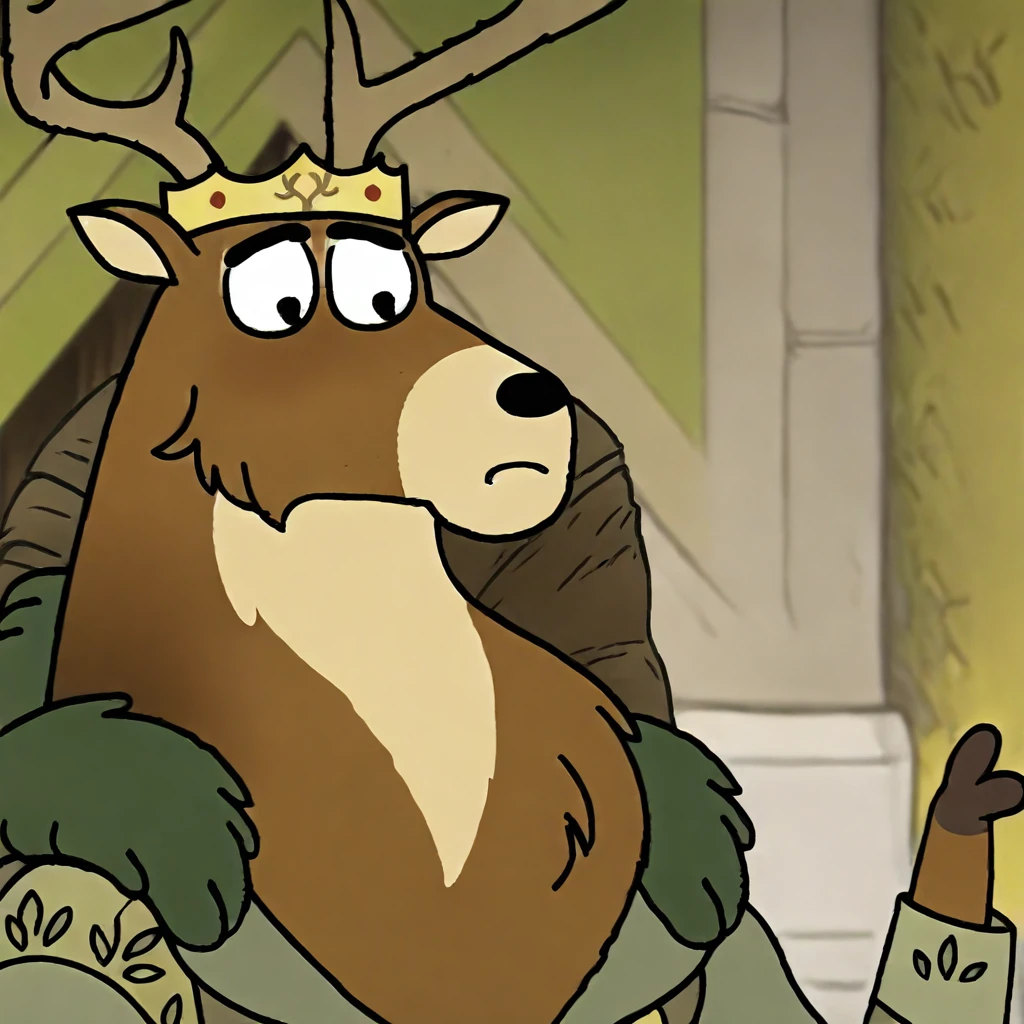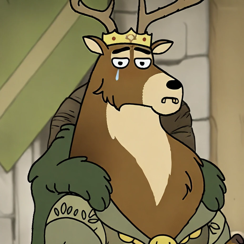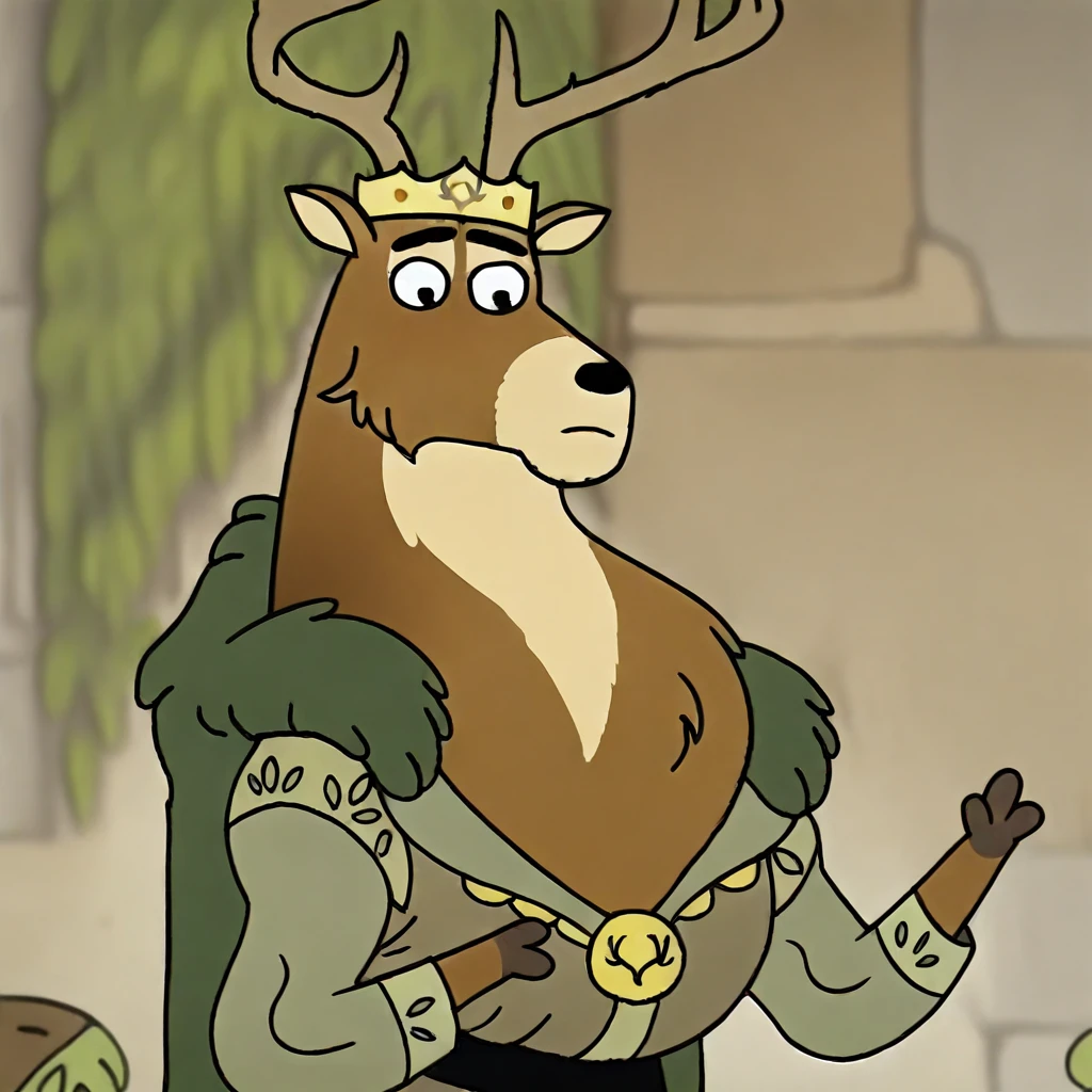 Knut(Ivandoe), Deer, furry, furry male, two-tone fur, brown fur, deer antlers, crown, fur-trimmed coat, green tunic, deer ears, head turf, deer tail, black belt