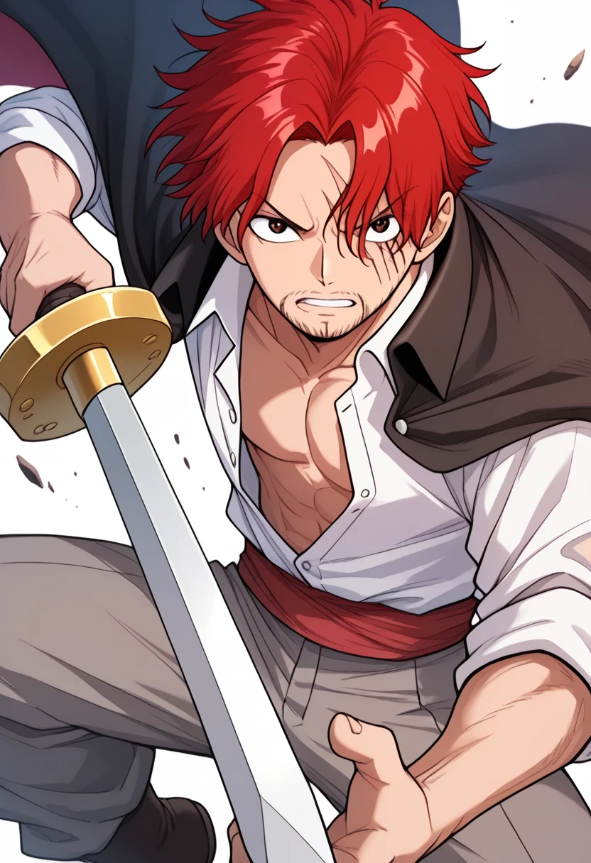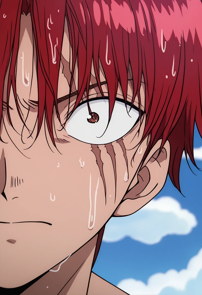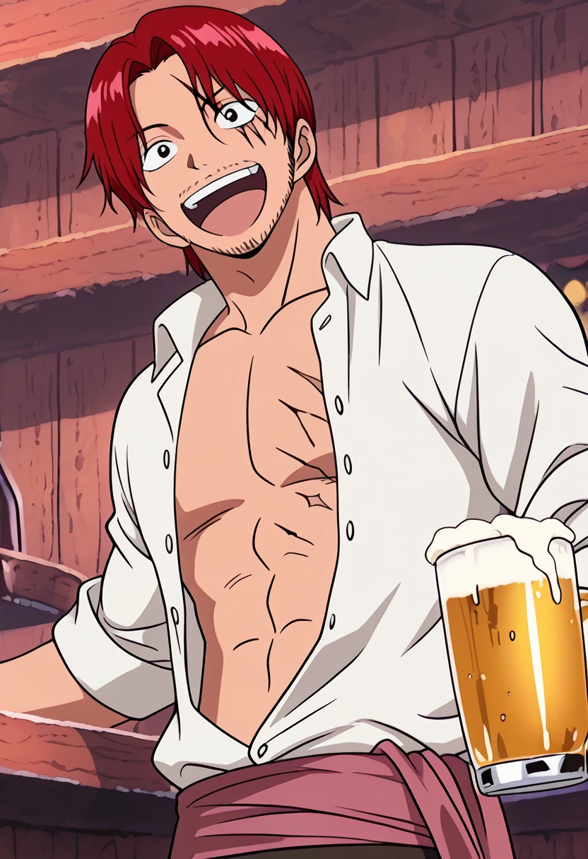 shankseastblue, 1boy, red hair, short hair, facial hair, stubble, scar across eye