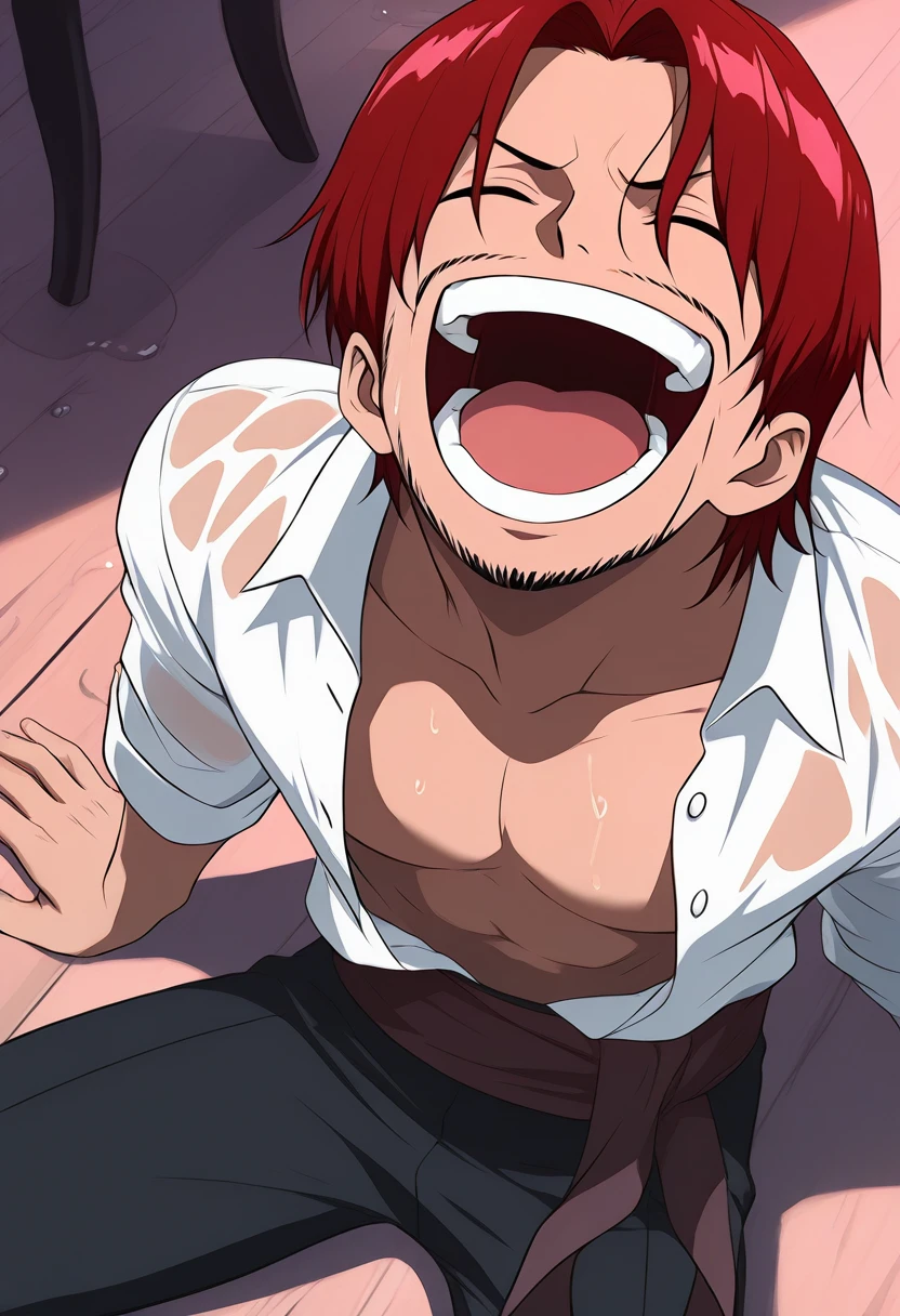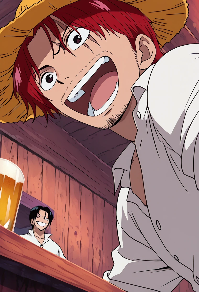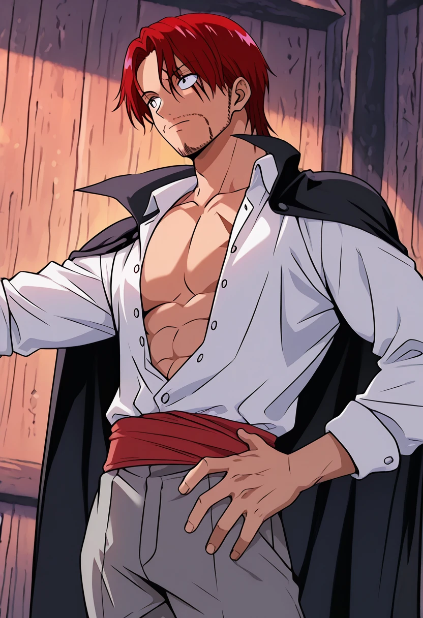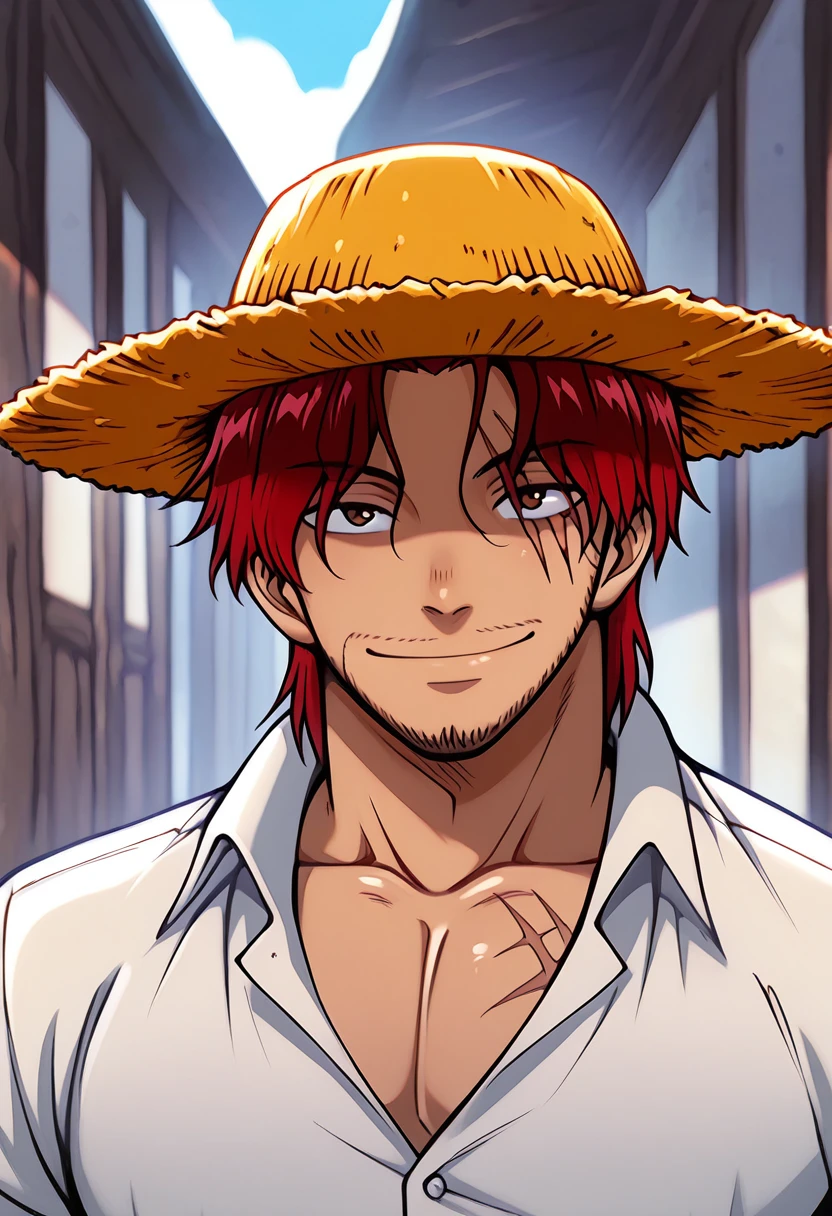 shankseastblue, 1boy, red hair, short hair, facial hair, stubble, scar across eye