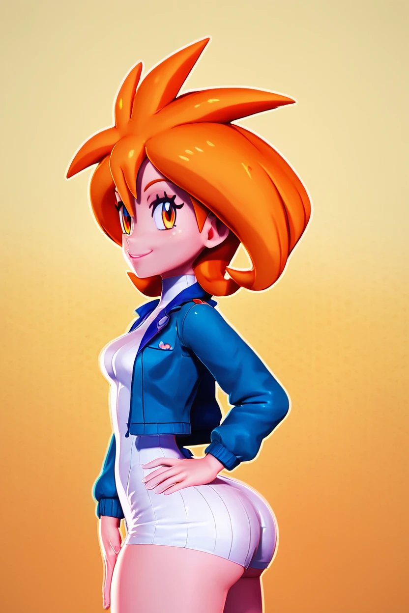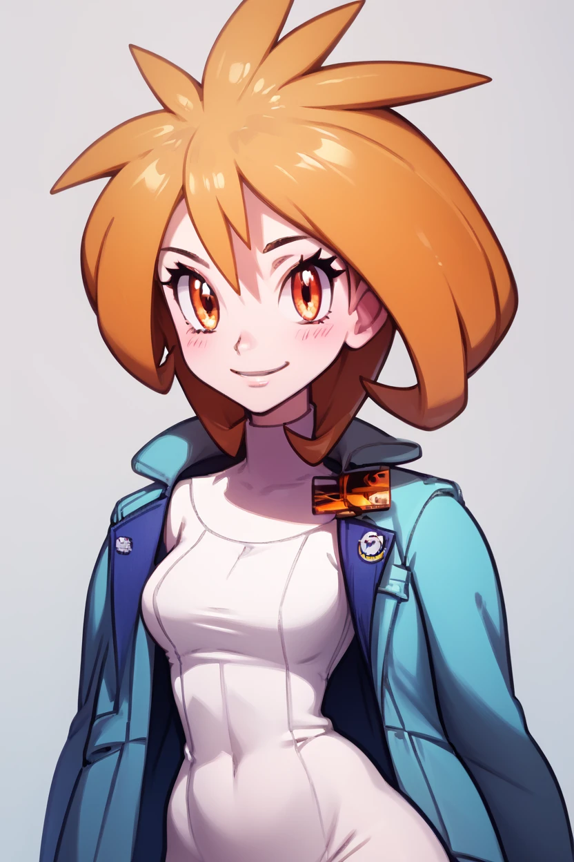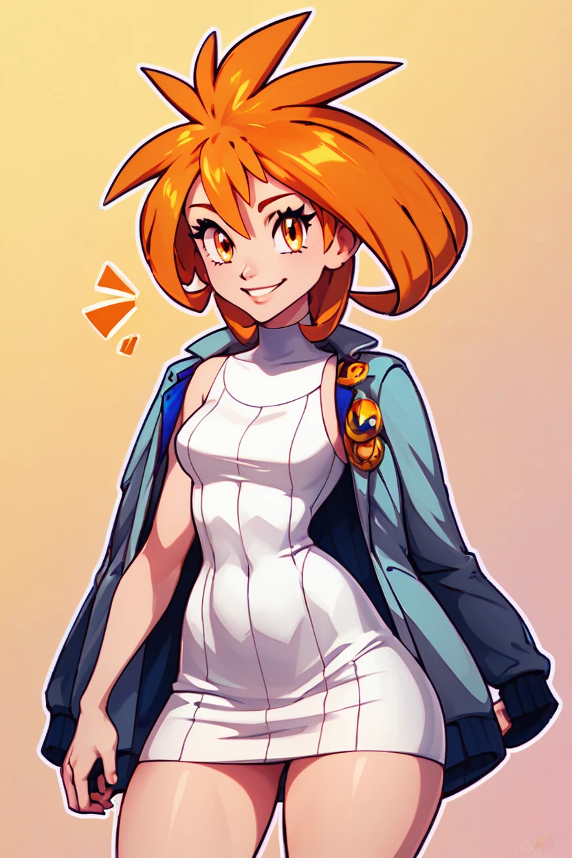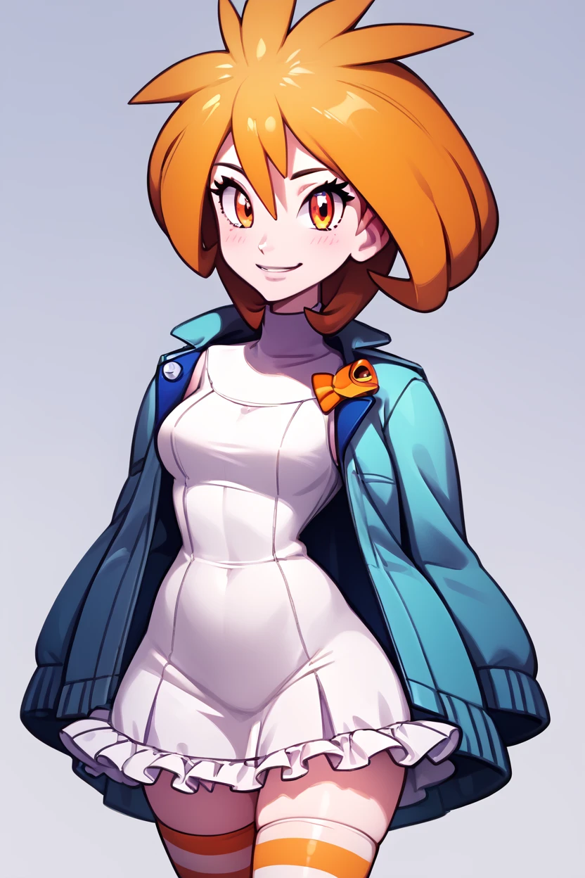 zzBrigette, short hair, orange hair, orange eyes, white sweater dress, turtleneck, blue jacket,