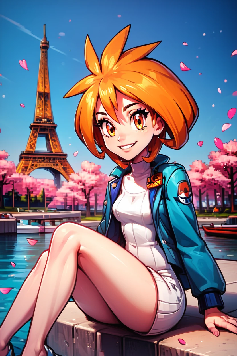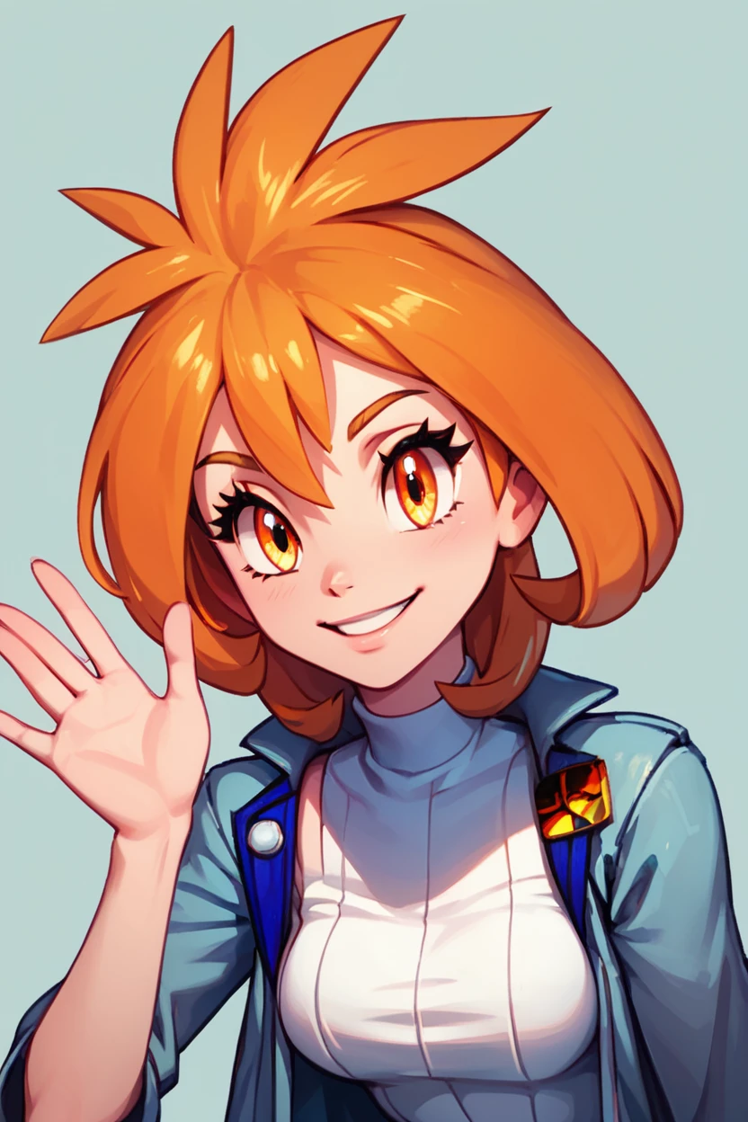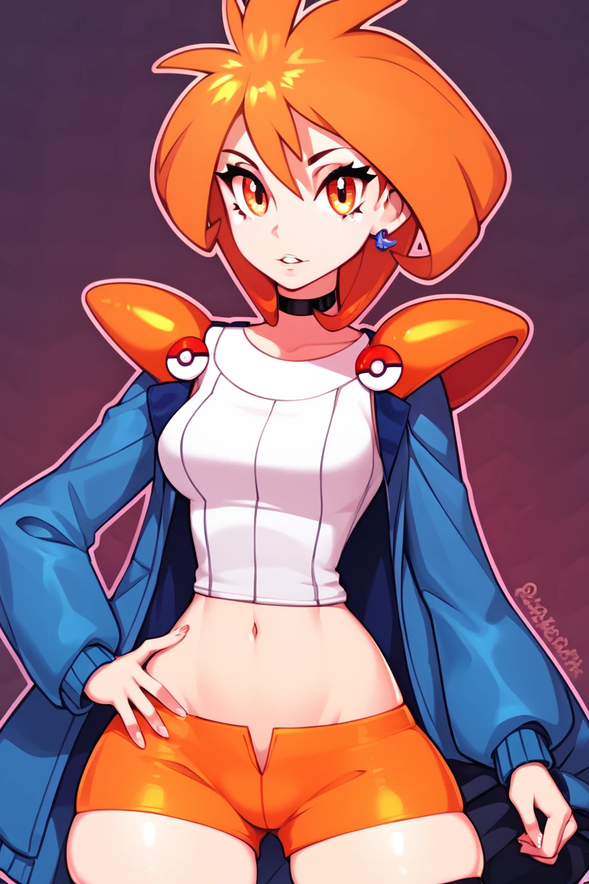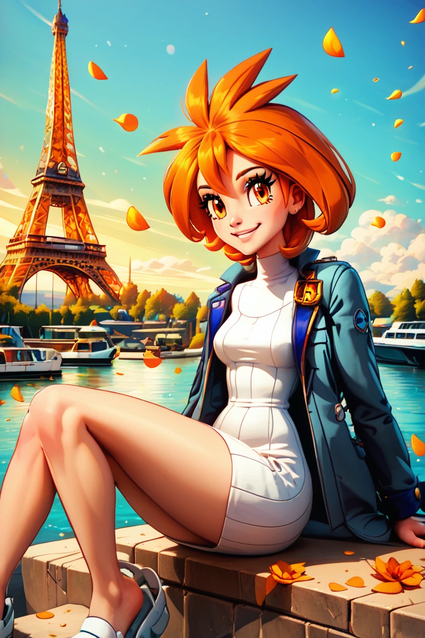 zzBrigette, short hair, orange hair, orange eyes, white sweater dress, turtleneck, blue jacket,
