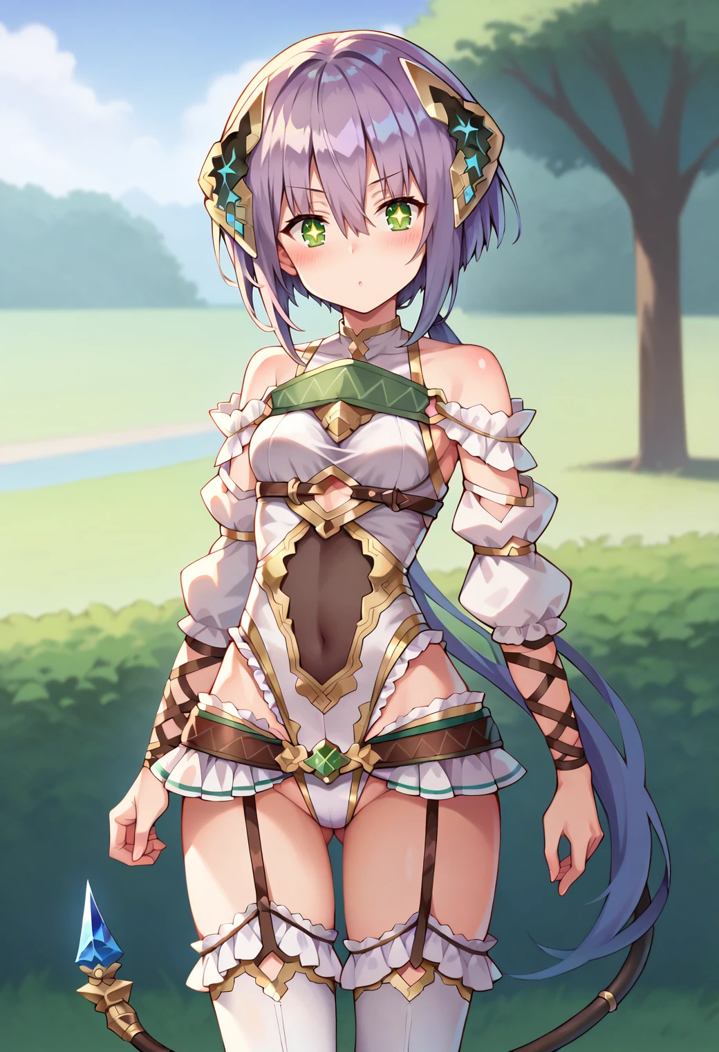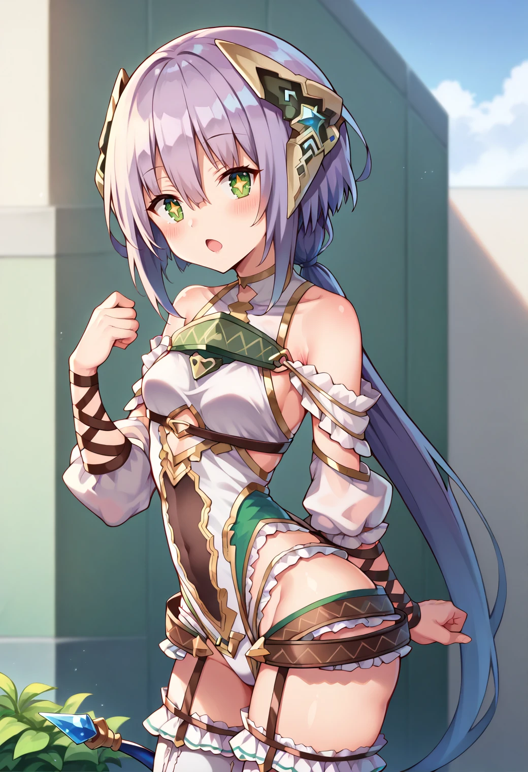 low ponytail, frilled highleg leotard, bare shoulders, clothing cutout, belt, detached sleeves, frills, frilled white thighhighs, garter straps, tail, white footwear, boots,