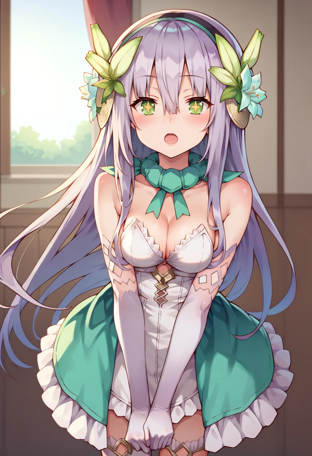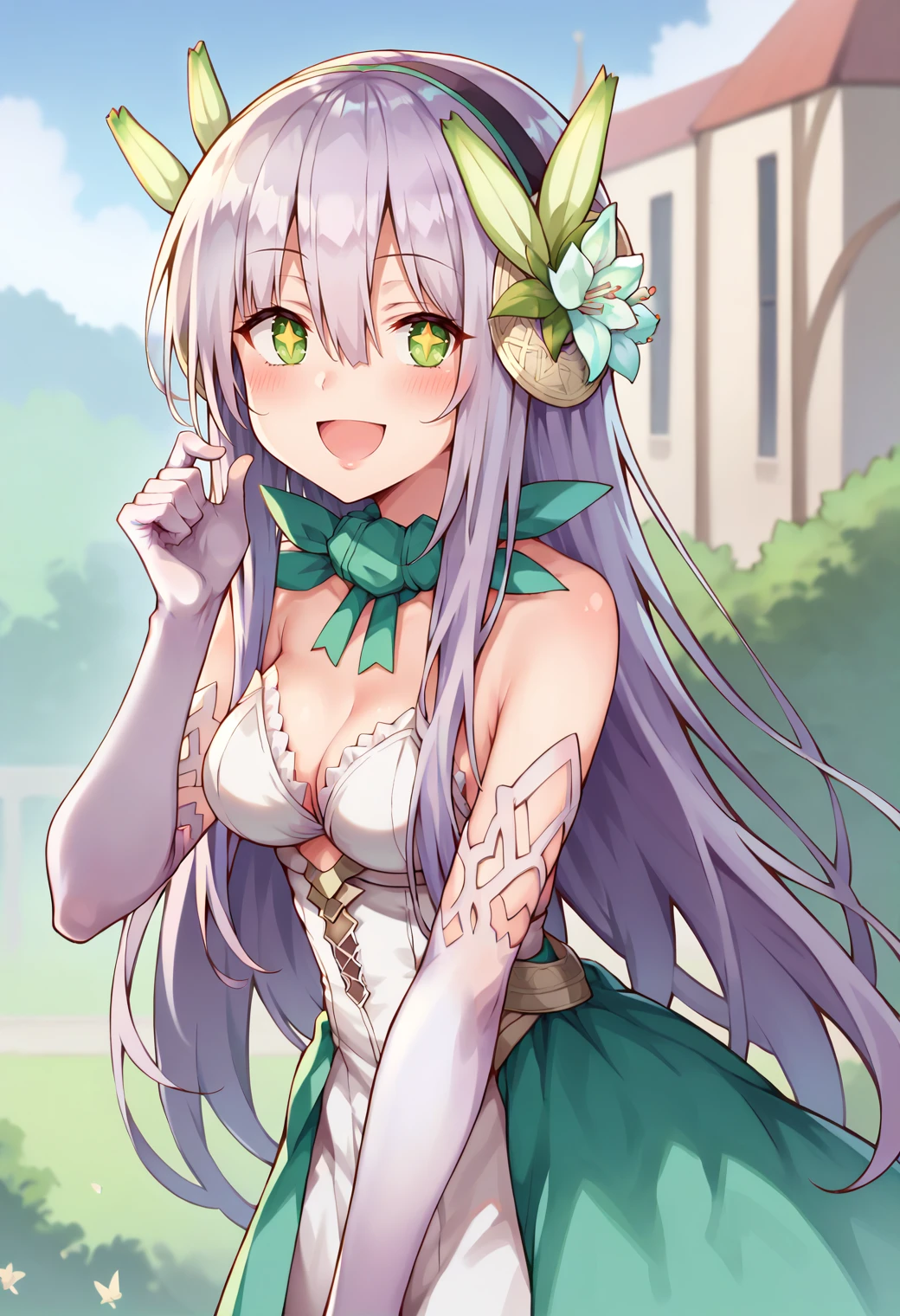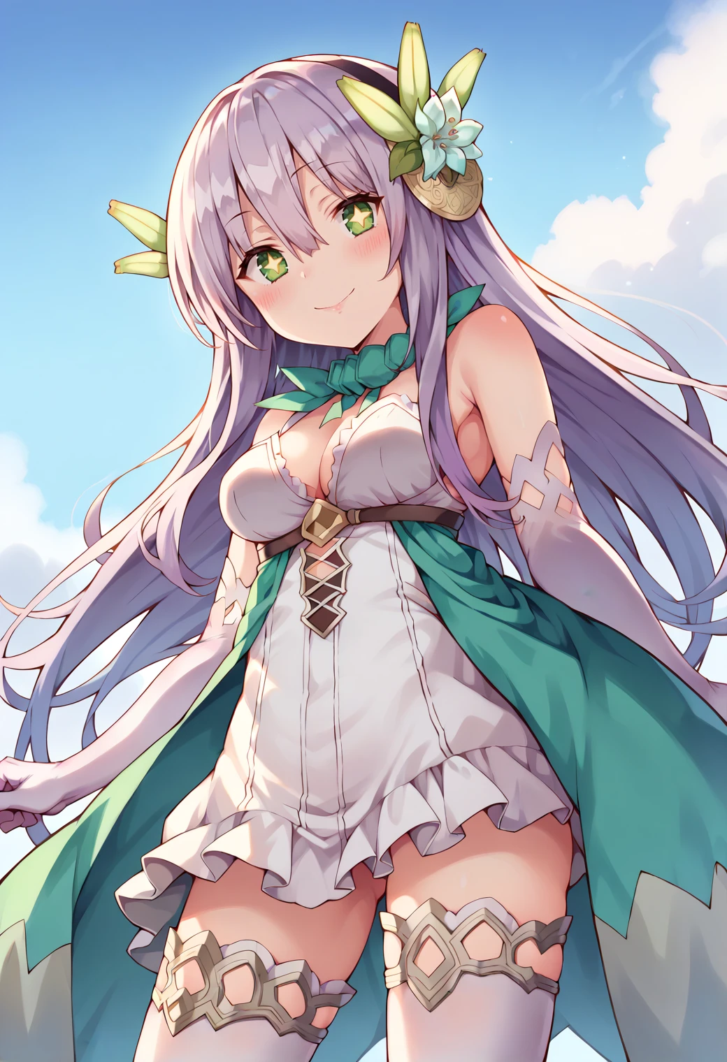hair flower, headband, very long hair, plachtahdress, cleavage, bare shoulders, white elbow gloves, white thighhighs,