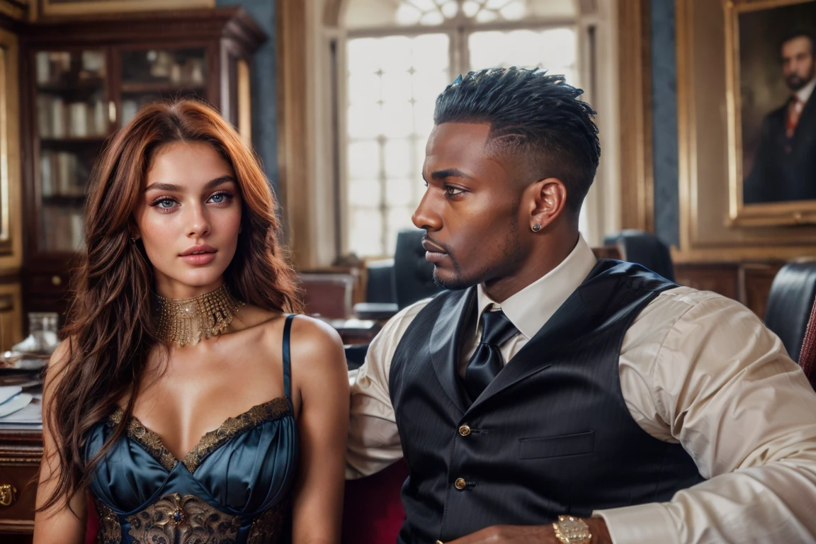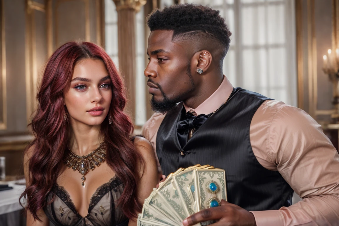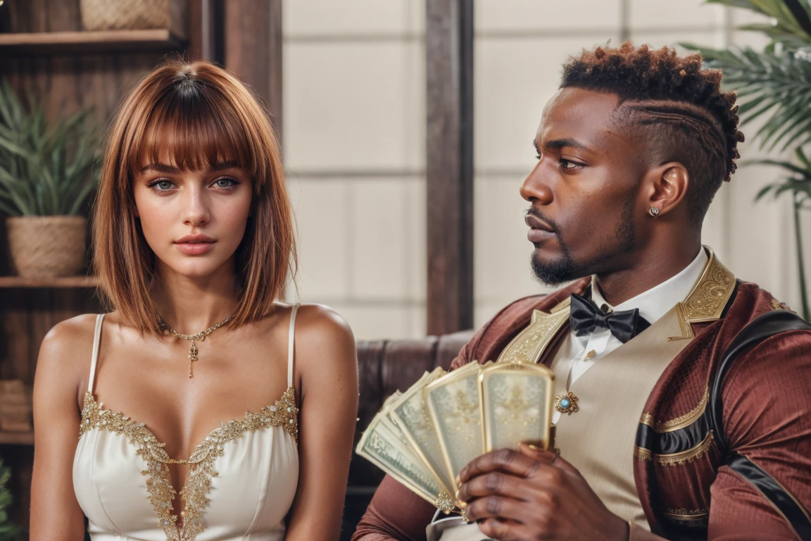 <lora:cshsgimFT15-000100:0.6>, {cshsgim, }{1girl, }{1boy, }{realistic, }{facial hair, }{shirt, |||||}{money, }{vest, ||||}{holding, }{holding money, }{white shirt, |||||}{upper body, }{banknote, |}{looking at another, |}{collared shirt, |||||}{jacket, |||||}{jewelry, |}{black vest, |||||||}{photorealistic, ||}{looking at viewer, ||}{long sleeves, ||||||}{blurry, ||}{necktie, ||||||}{beard, ||}{makeup, ||}{formal, ||}{sitting, ||}, fair-skinned female,