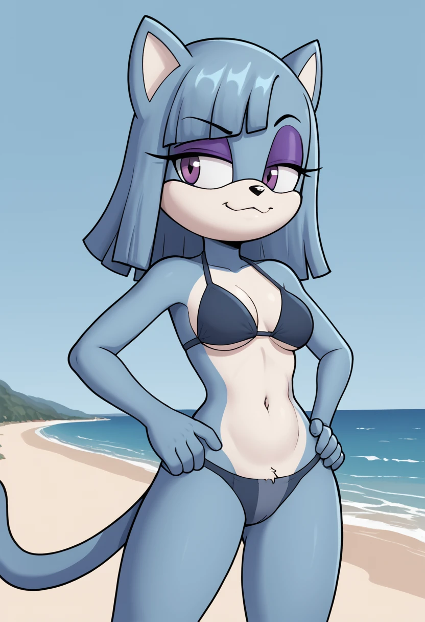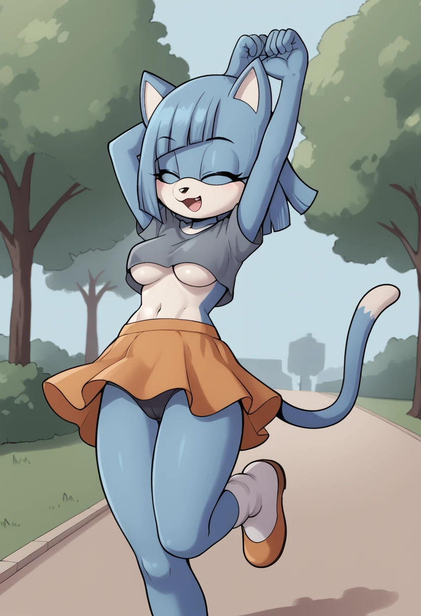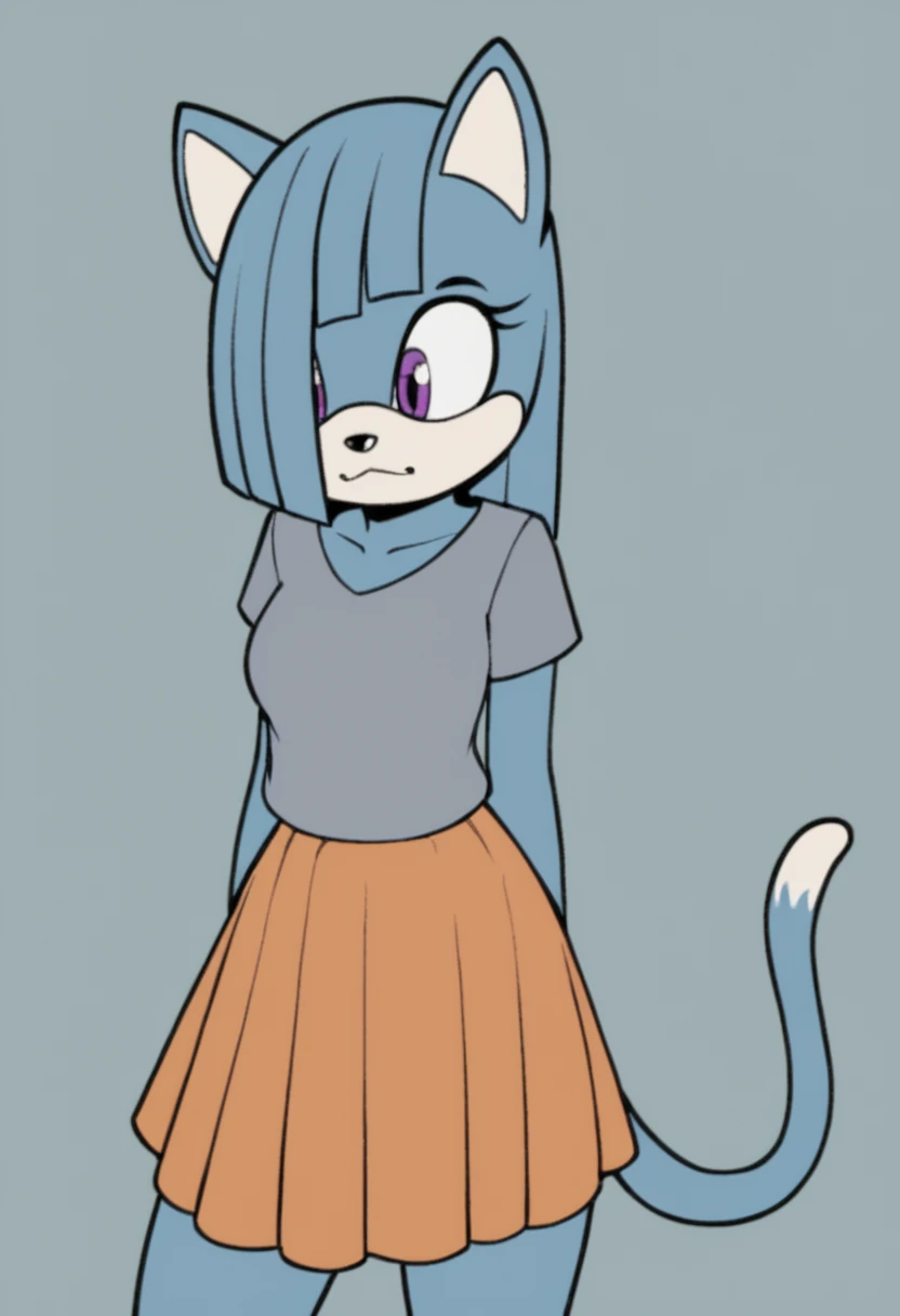 anthro cat, blue fur, blue hair, side-swept bangs, beige fur, two-toned fur, purple iris, black nose, tail || gray shirt, orange skirt