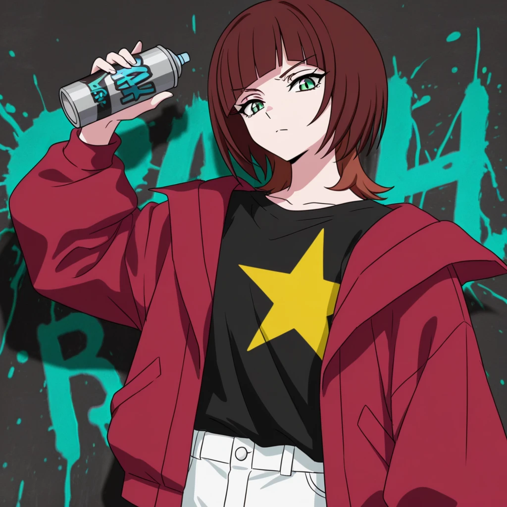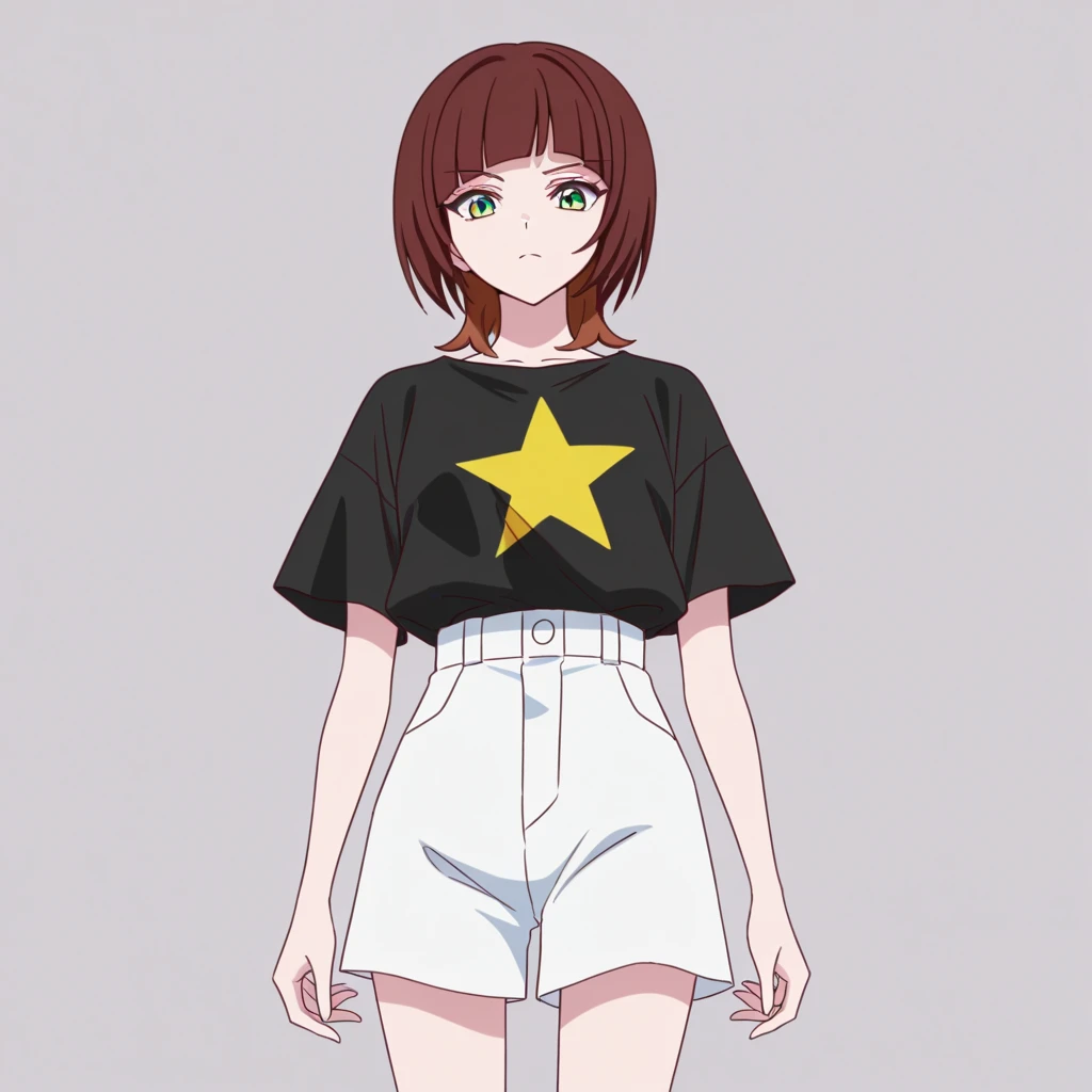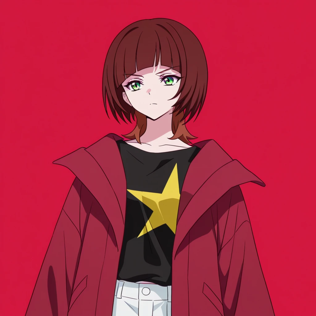 short hair, brown hair, two-tone hair, green eyes, blunt bangs