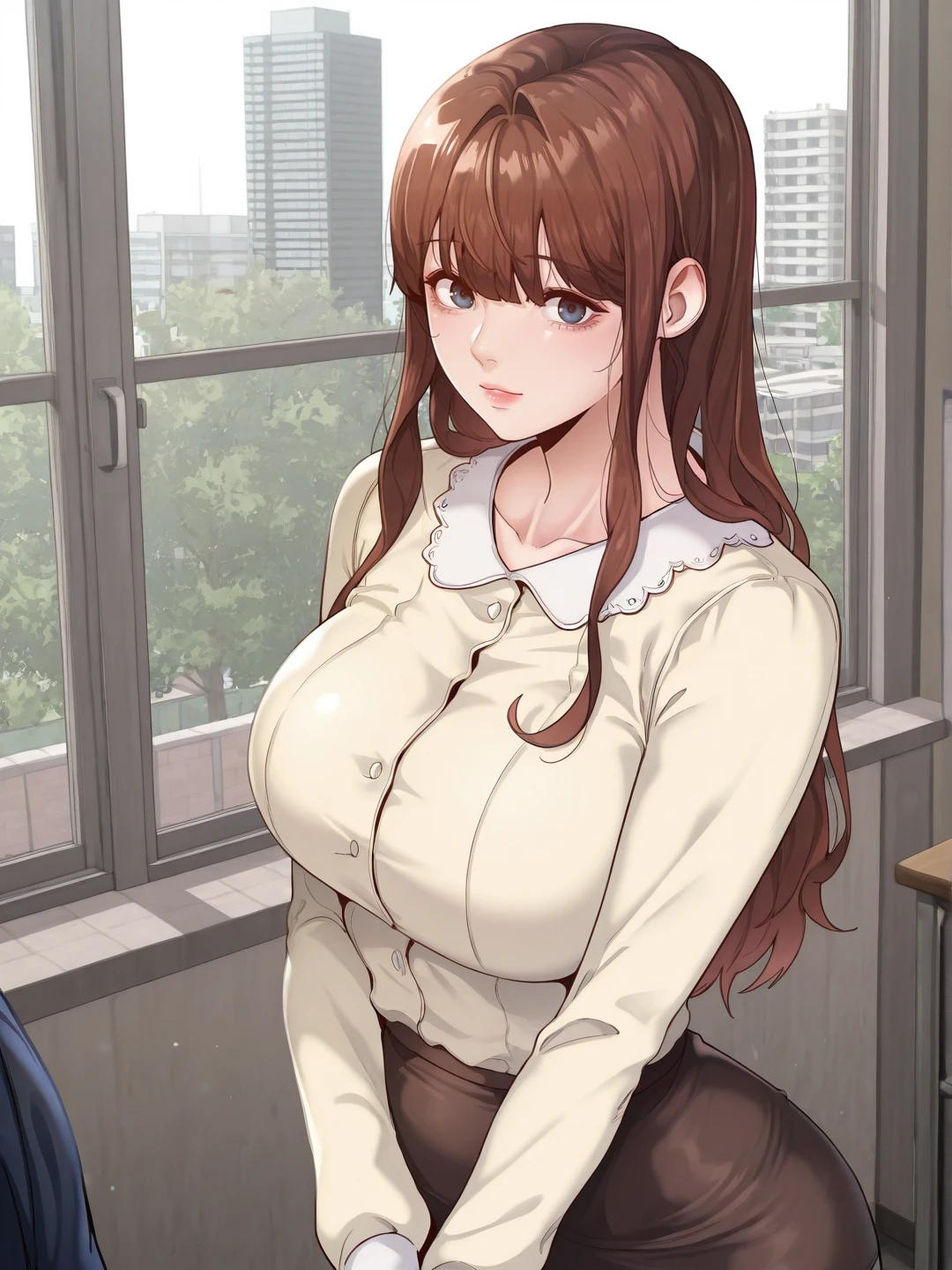 skirt, yellow shirt,teacher,