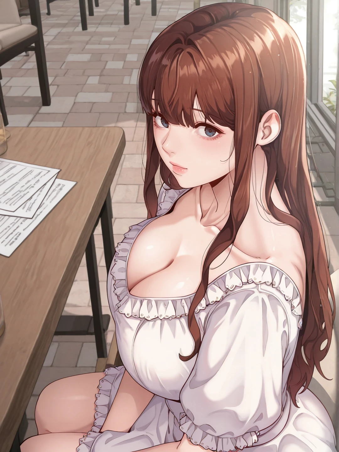 white dress, frills, bangs,collarbone,