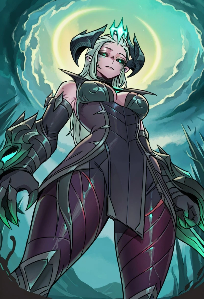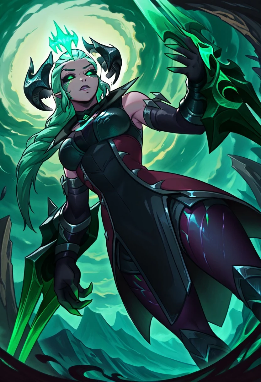 league of legends, shyvana, ruined shyvana, ruined (league of legends), mind control, mind brake, glowing eyes, black sclera, crown, , 1girl, green eyes, , navel, long hair, blush, horns, shiny, , shoulders, smile, , grabbing own , tongue, bangs, shiny skin, green background, grey hair,