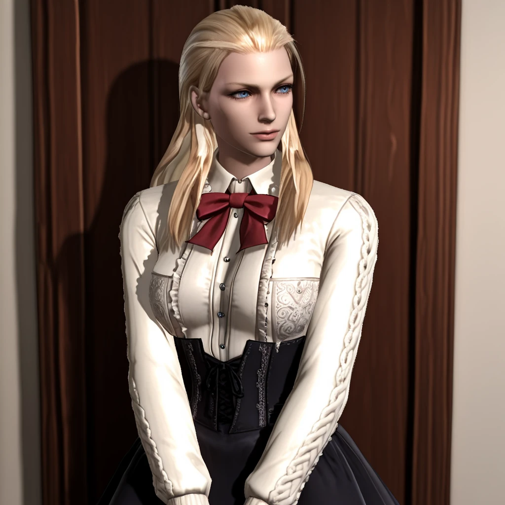 Trigger : TrishDMC4, 1girl, blonde hair, long hair, corset, choker, midriff, blue eyes, navel, bare shoulders, belt, bustier, leather pants, cowboy shot