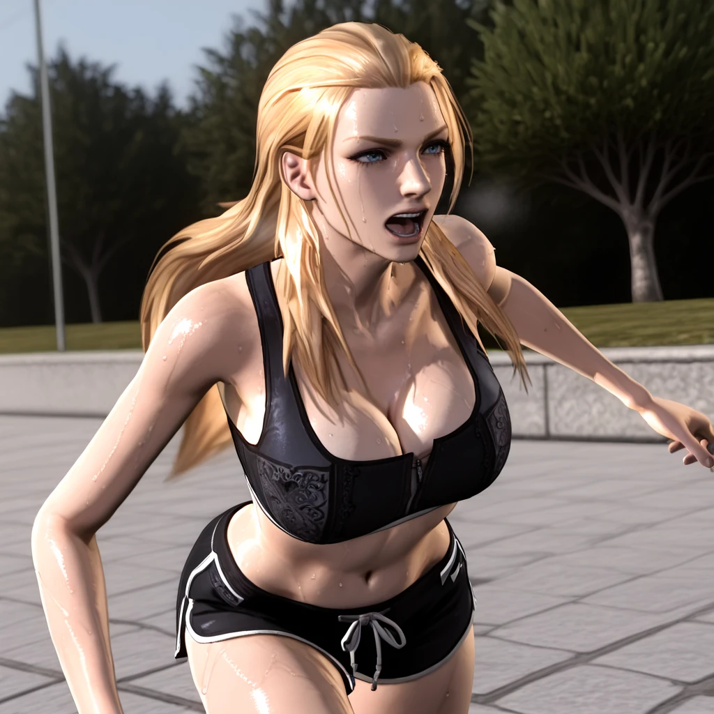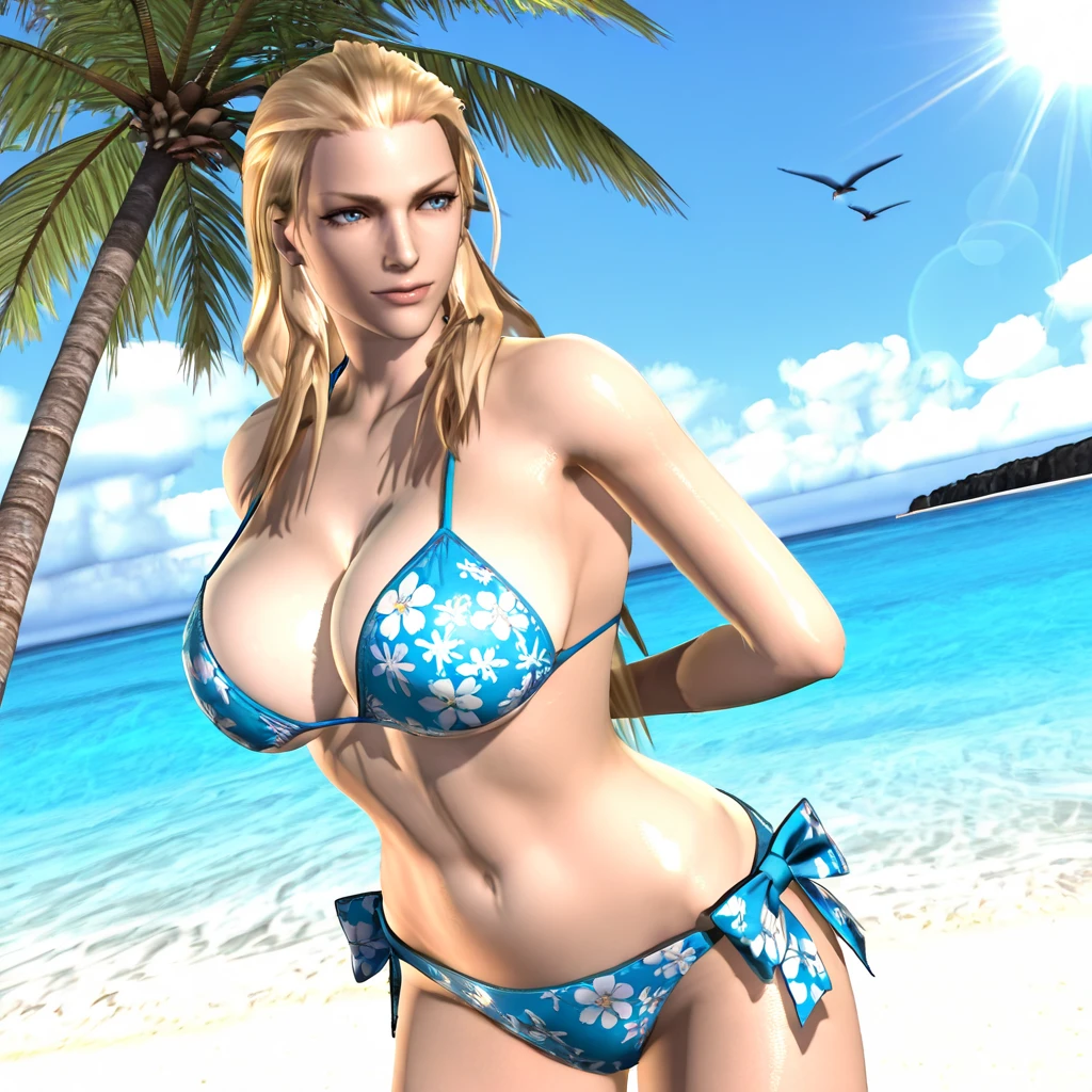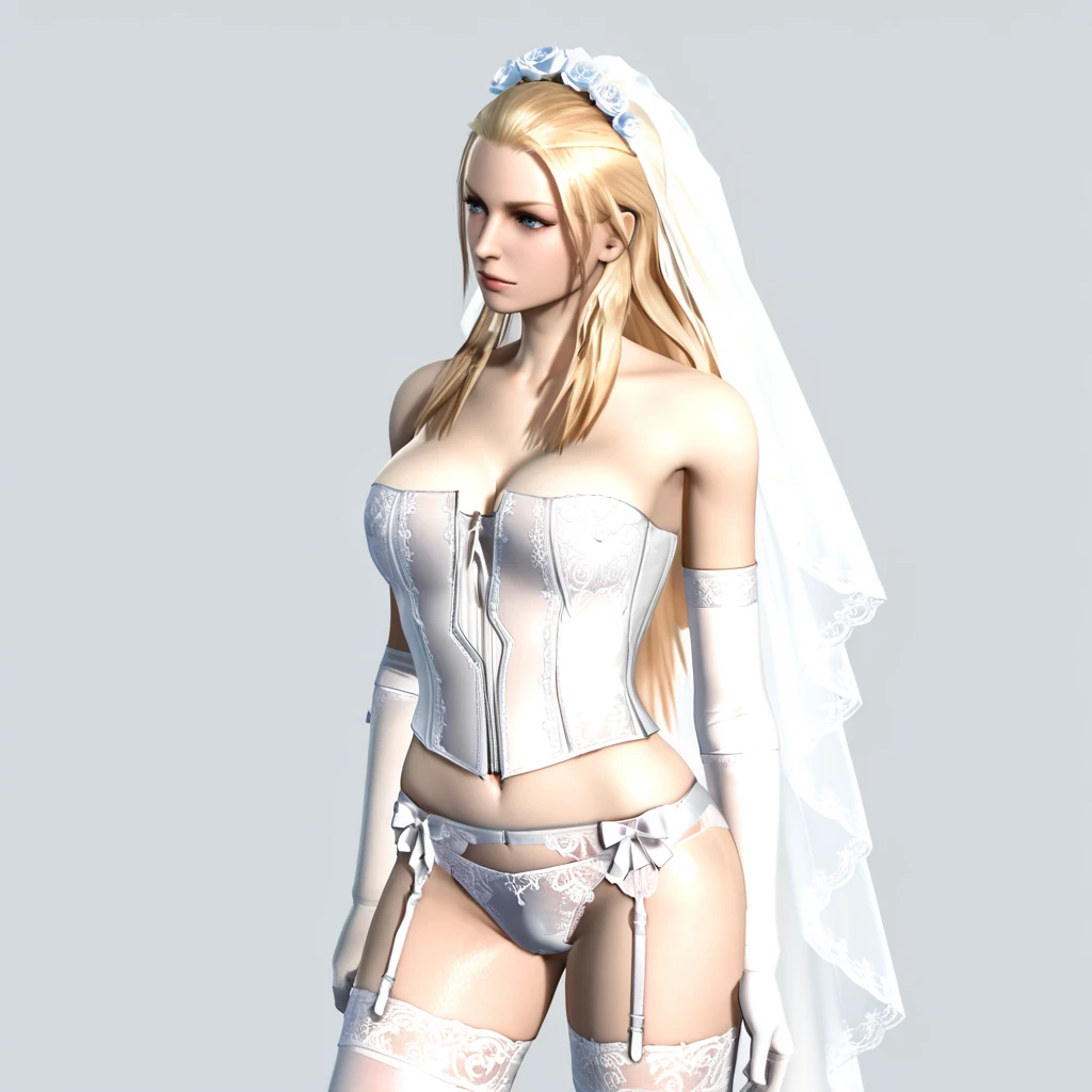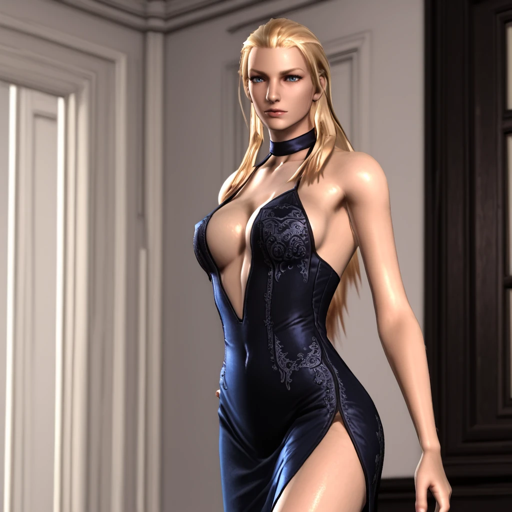 TrishDMC4, 1girl, blonde hair, long hair, corset, choker, midriff, blue eyes, navel, bare shoulders, belt, bustier, leather pants, cowboy shot