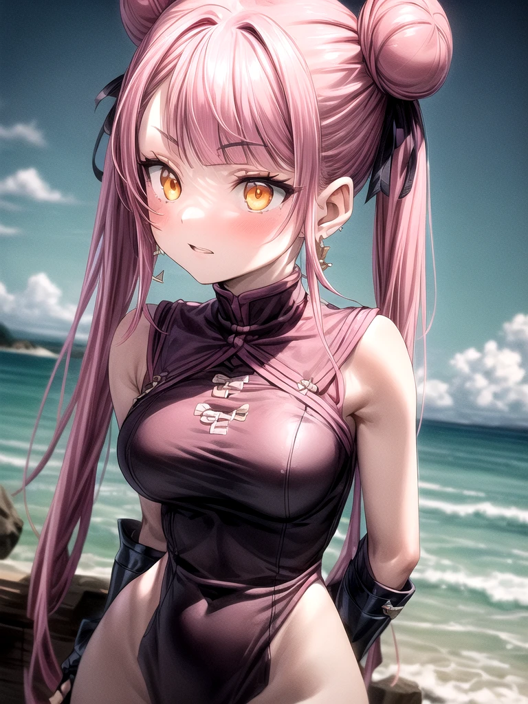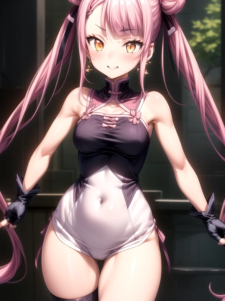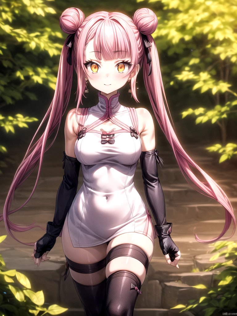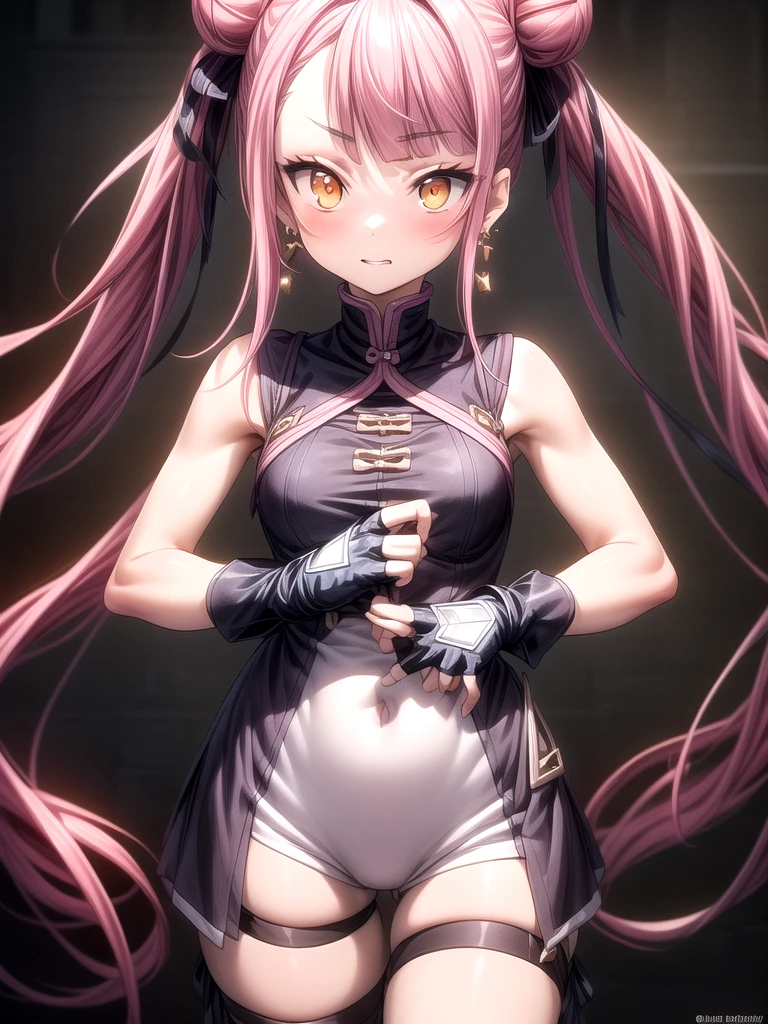 Prompt: masterpiece, best quality, high quality, 1girl, solo, teen, orange-gold eyes, pink hair, double buns hairstyle, twintails, blunt bangs, (hip-length hair tendrils), unique cut style, unique hairstyle, pale skin, slim body, two hair ribbons, bow dangle earrings, fingerless gloves, full-size, <lora:Tao Yuifa:0.8>