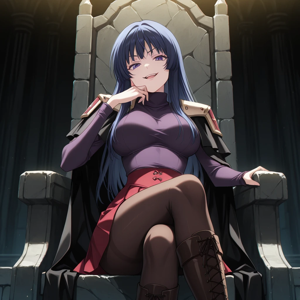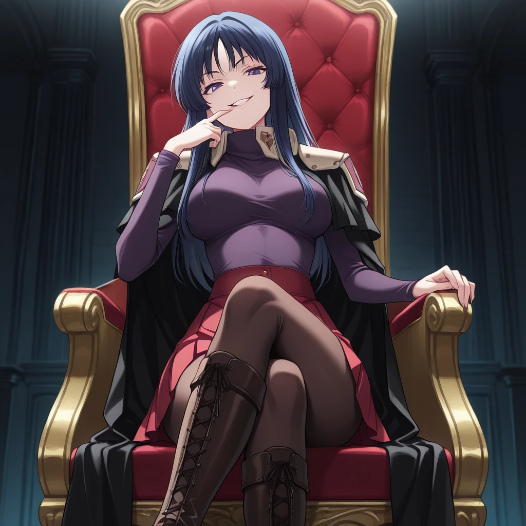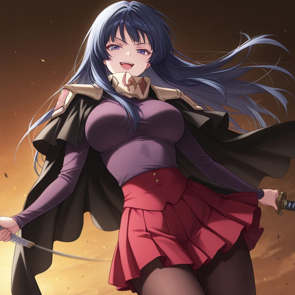 purple sweater, long sleeves, red skirt, pantyhose, black cape, beige shoulder pads, brown knee boots,
