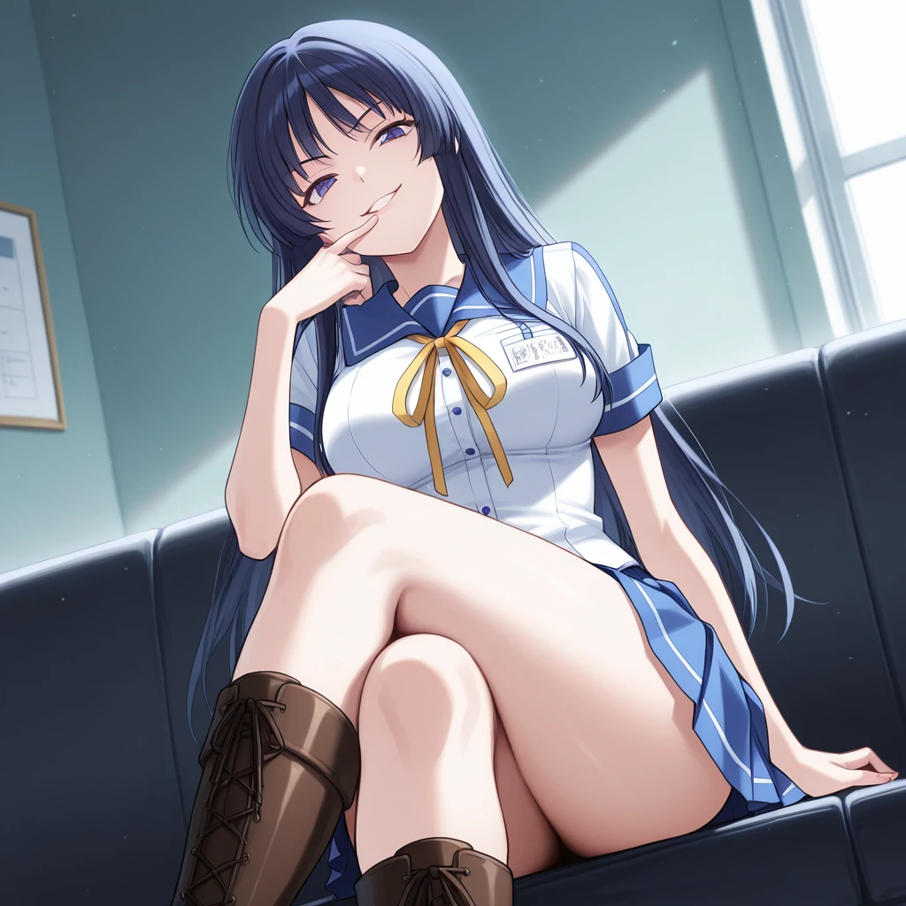white shirt, short sleeves, blue collar, blue cuffs, yellow robbon tie, blue skirt, pleated skirt, brown knee boots,
