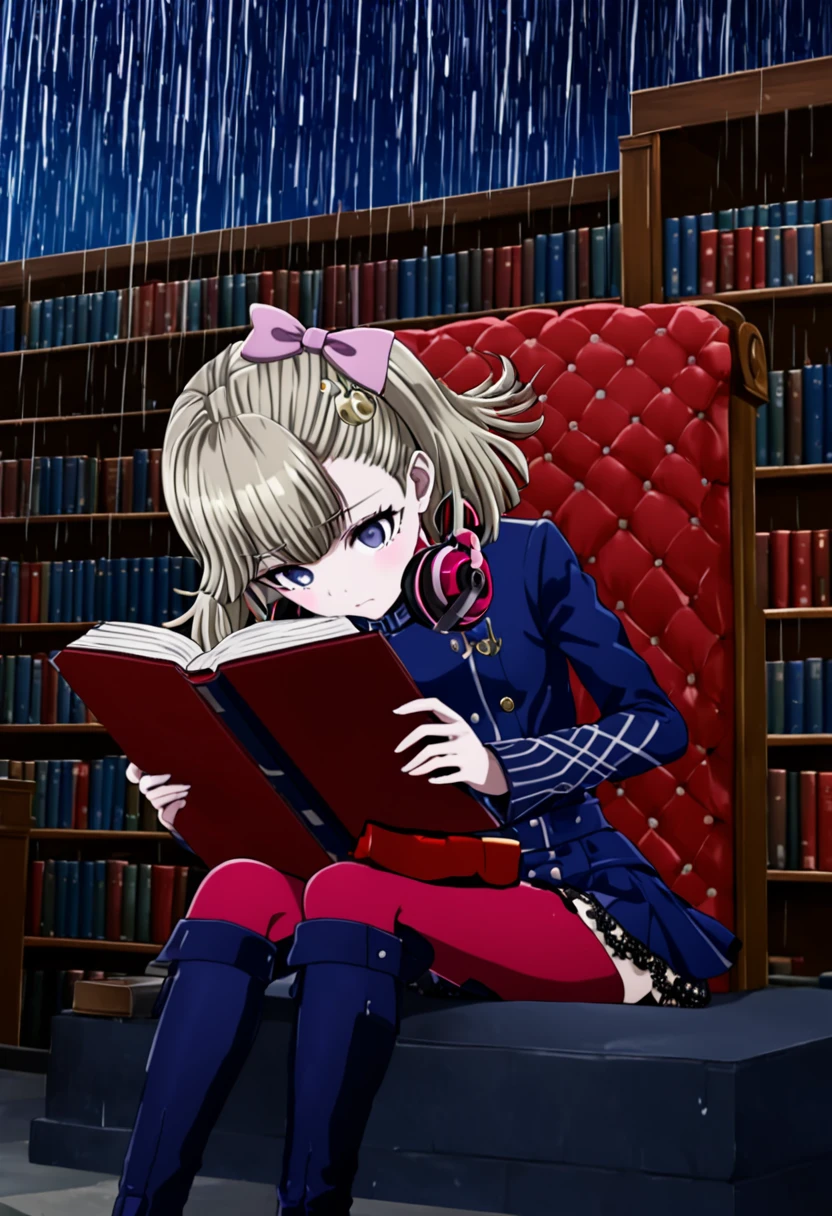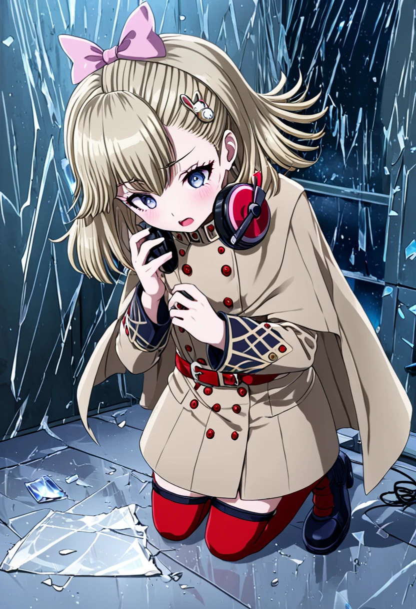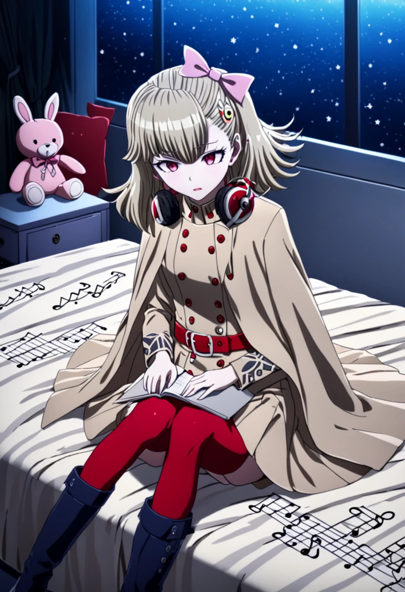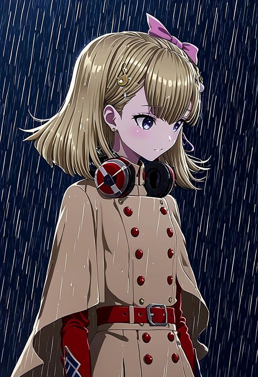 Raincoat: "Pucci Lavmin wearing a beige double breasted cape coat with red buttons and a red belt, red thigh high socks, and black boots. She has short, layered blond hair tied back with a pink bow and a bunny ear hair clip on the left side of her head. She has red headphones."