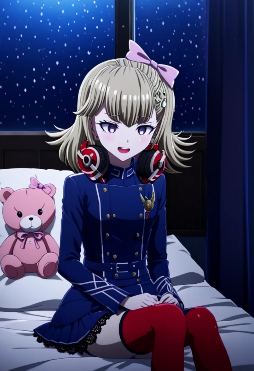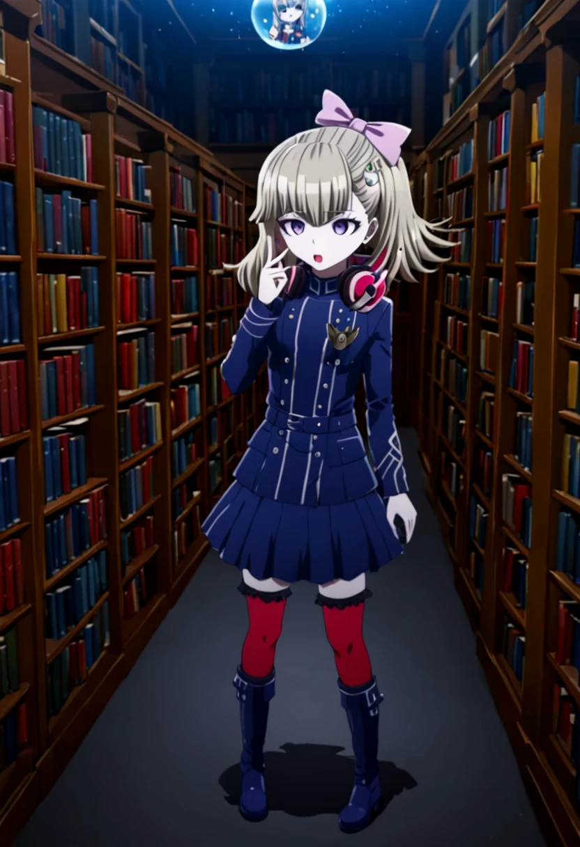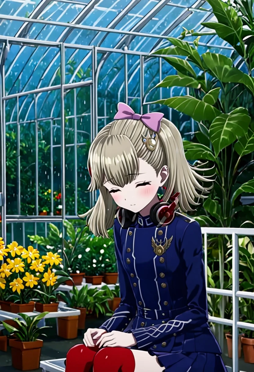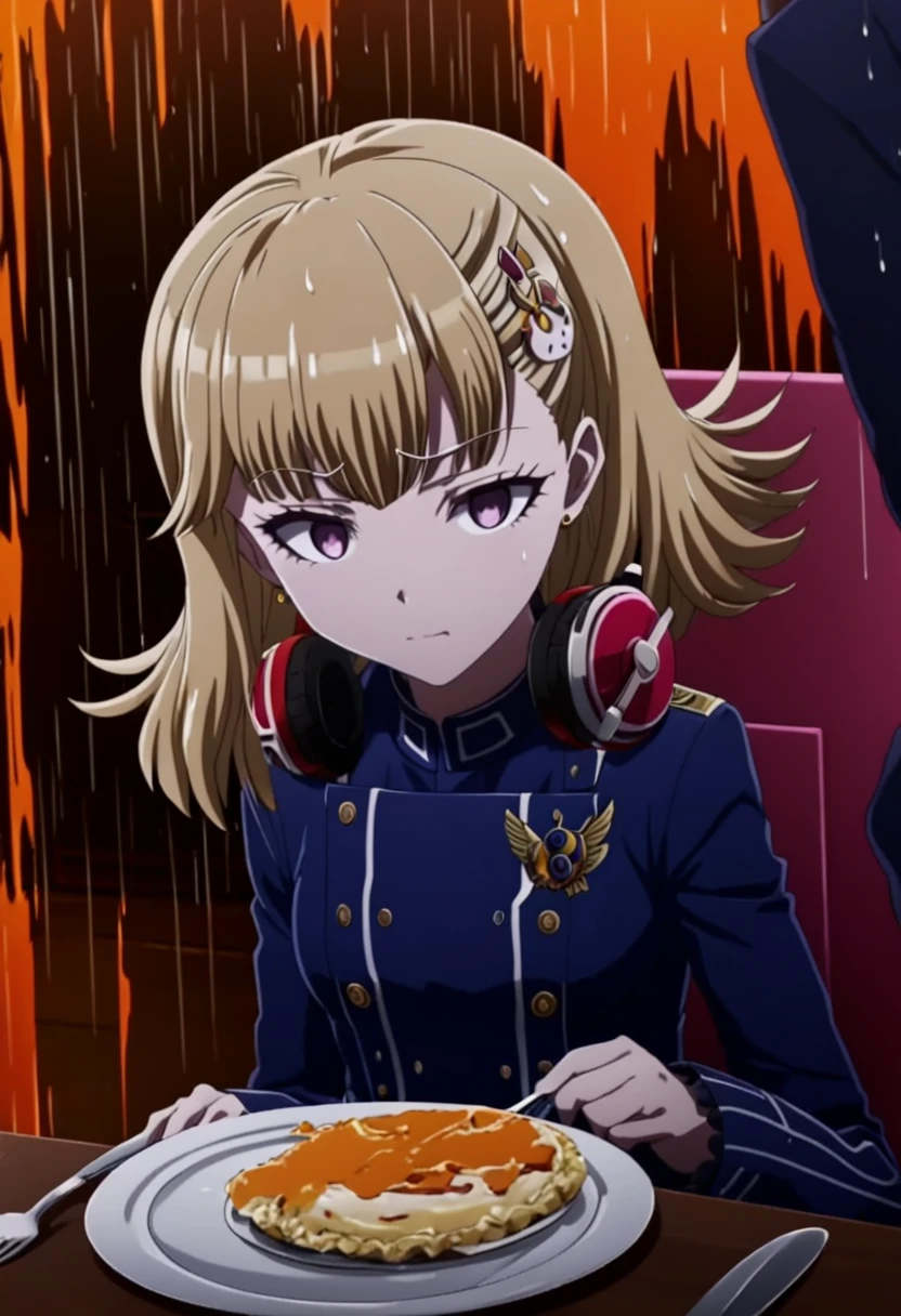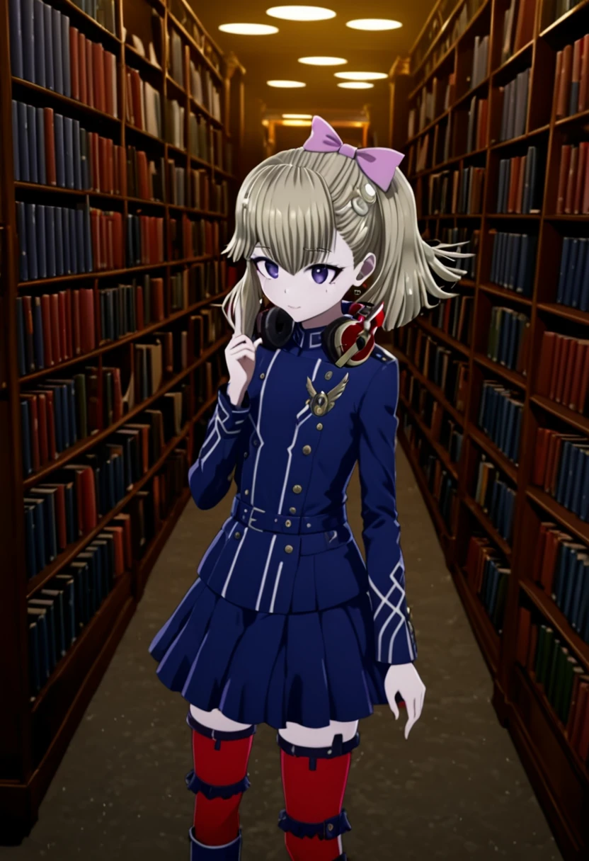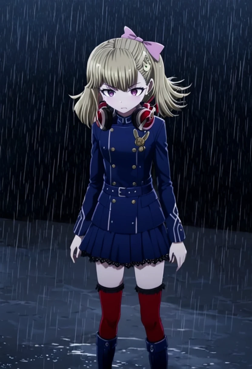 Standard outfit: "Pucci Lavmin is wearing her Rain Code light uniform. Pucci Lavmin wearing a navy blue double-breasted jacket with gold buttons and a matching skirt. She has a medal on the left side of her chest. Her skirt has black lace along the hem and she is also wearing black and purple boots with red thigh high socks that have black ruffle trimming. Her short blonde hair is parted to the side and styled with a pink bow on the back and a bunny hair clip on her left side. She has a pair of red headphones."