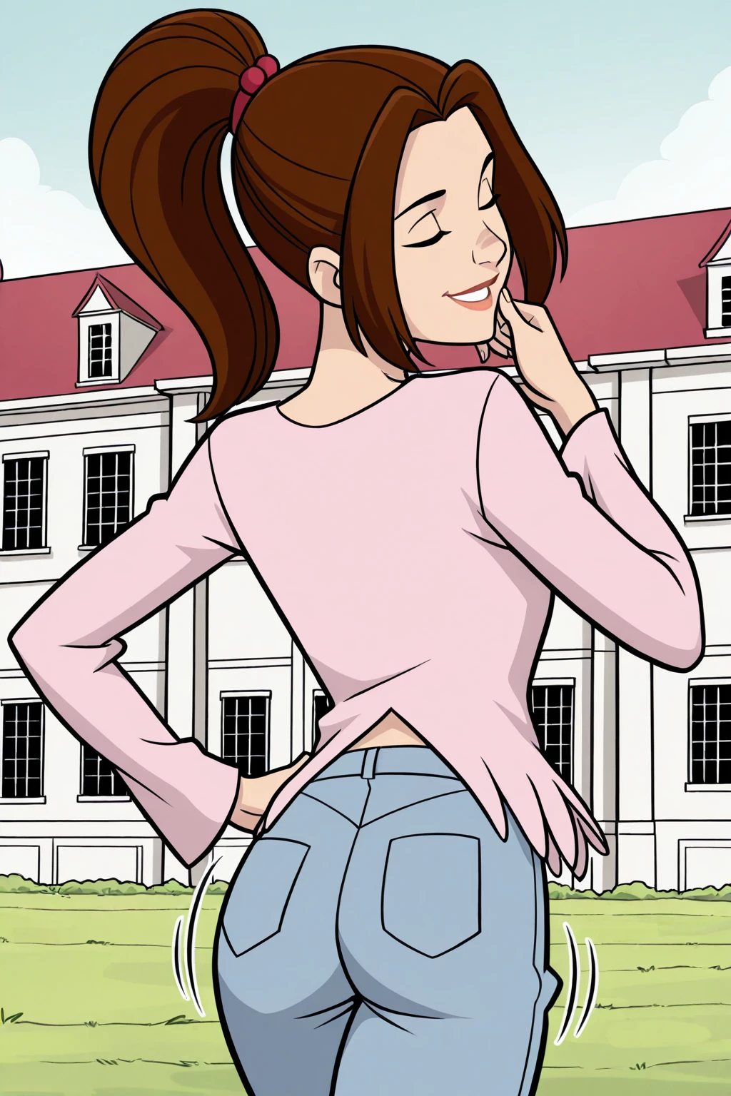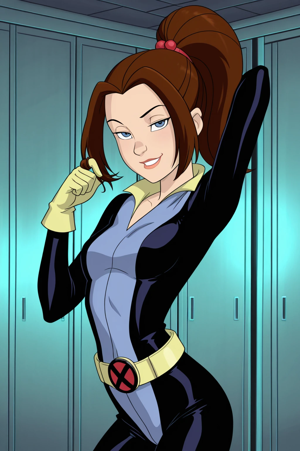 Base Prompt: kitty pryde, brown hair, high ponytail, blue eyes