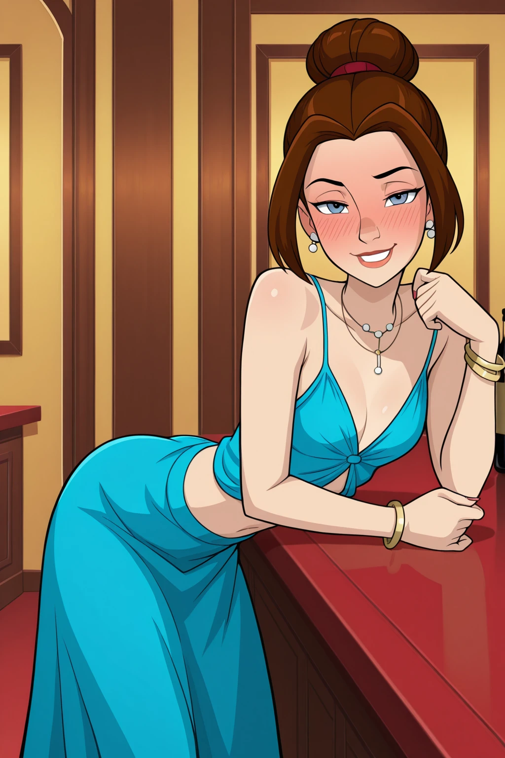 Date Night: hair bun, jewelry, earrings, necklace, formal, bare shoulders, blue dress, bracelet, midriff, blue skirt, long skirt, heels