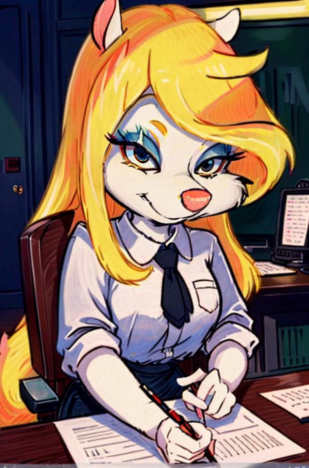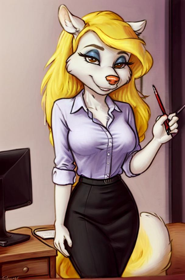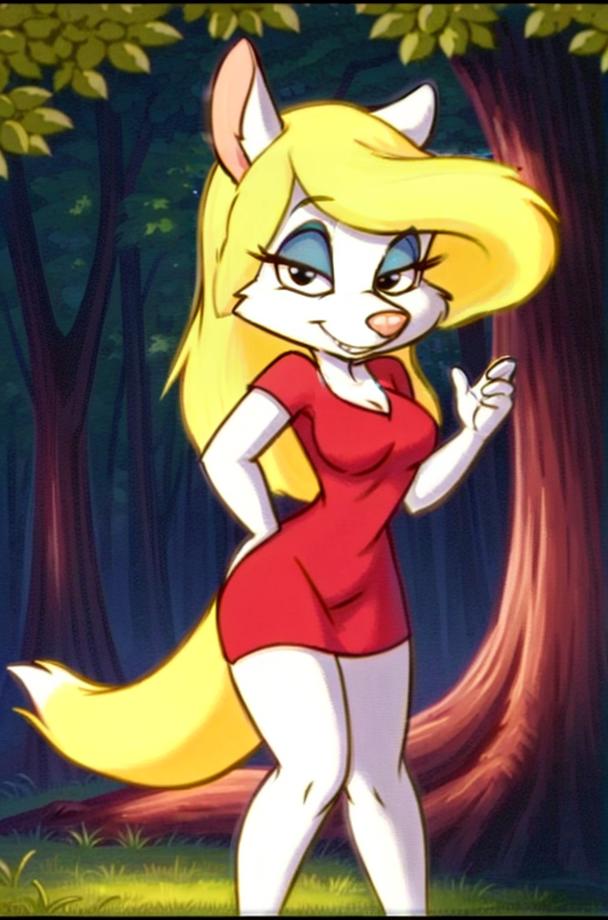 Sometimes it does not like to give her a tail, use a negative no tail and white tail, this will help her have her blonde tail. Also you can add non-white fur, some models wanna give her a different fur colour, usually blue because her eyeshadow I think.