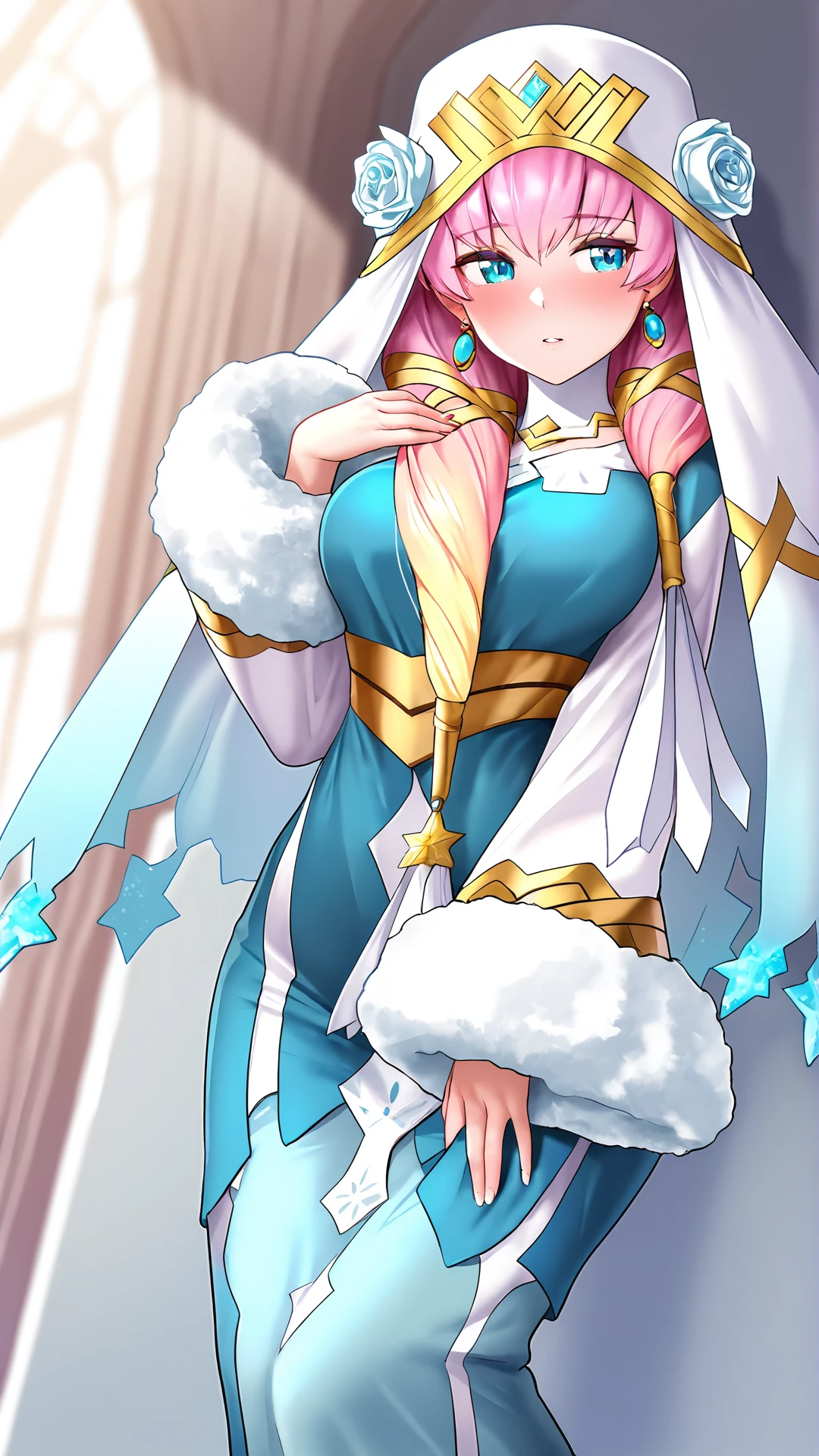 ,gunnthrá, 1girl, pink hair, long hair, blonde hair, multicolored hair, gradient hair, jewelry, earrings, dress, long dress, long sleeves, wide sleeves, fur trim, veil, blue eyes,
