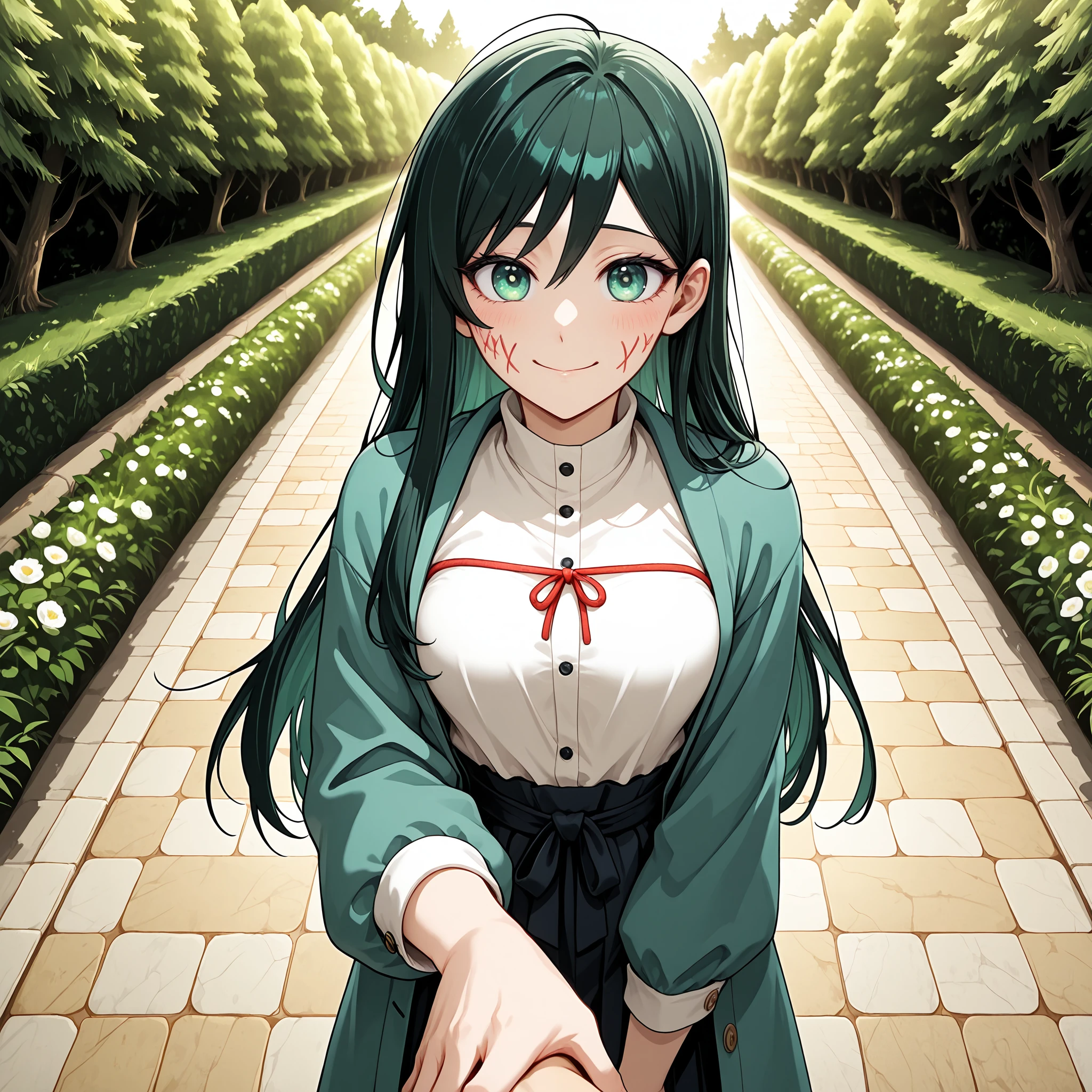 Useful words: 1girl ,miroku,black hair, green hair, green eyes, long hair, mouth stitching, stitches
