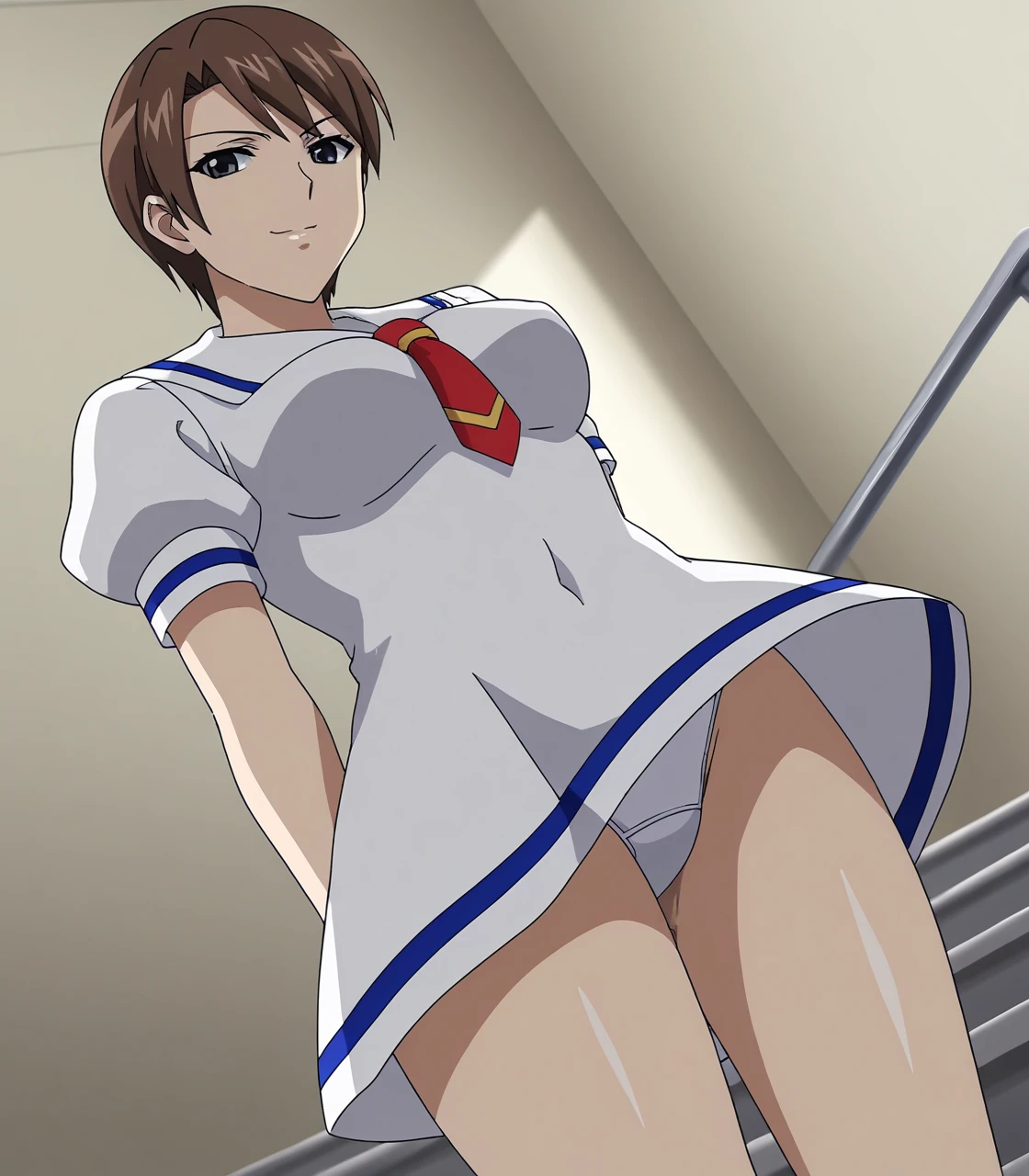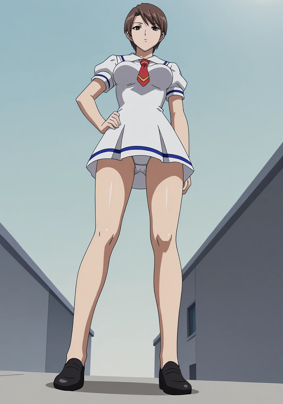 school uniform, white dress, sailor dress, short dress, sailor collar, short necktie, puffy sleeves, short sleeves, bare legs, black footwear, pumps