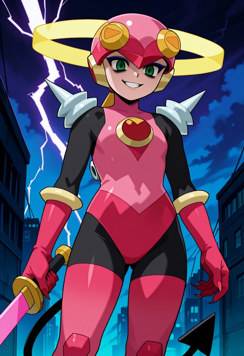 darkroll, 1girl, solo, green eyes, helmet, smile, gloves, grin, empty eyes, long fingernails, sharp fingernails, holding sword, no hair, mechanical back spikes, lightning conductor shoulders, electrical spikes, shoulder spikes, corrupted form, tail