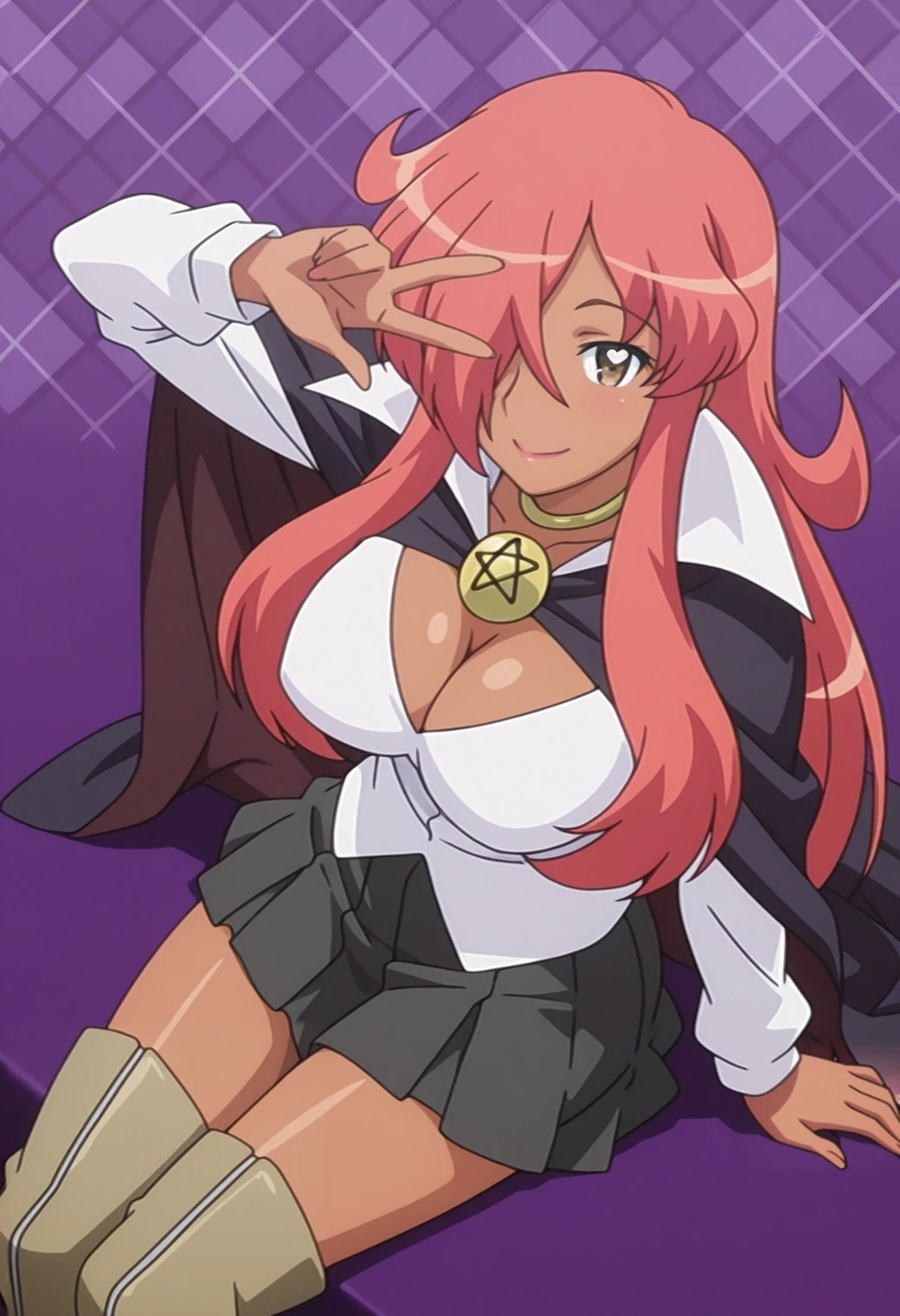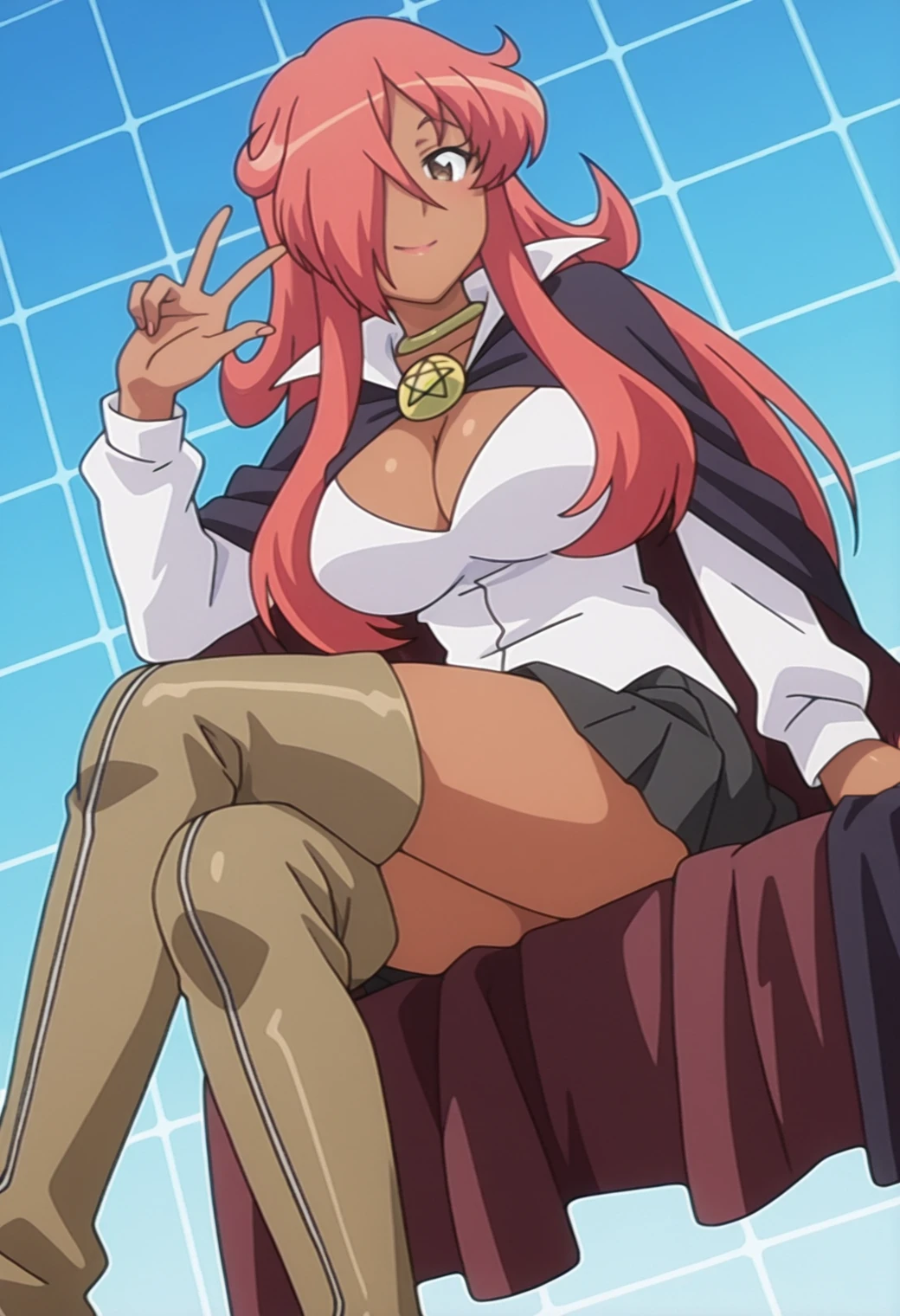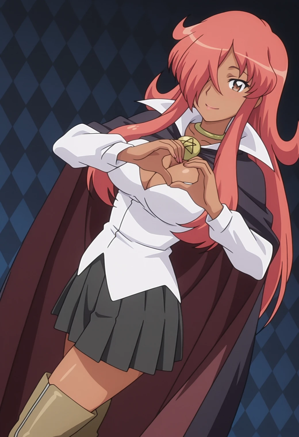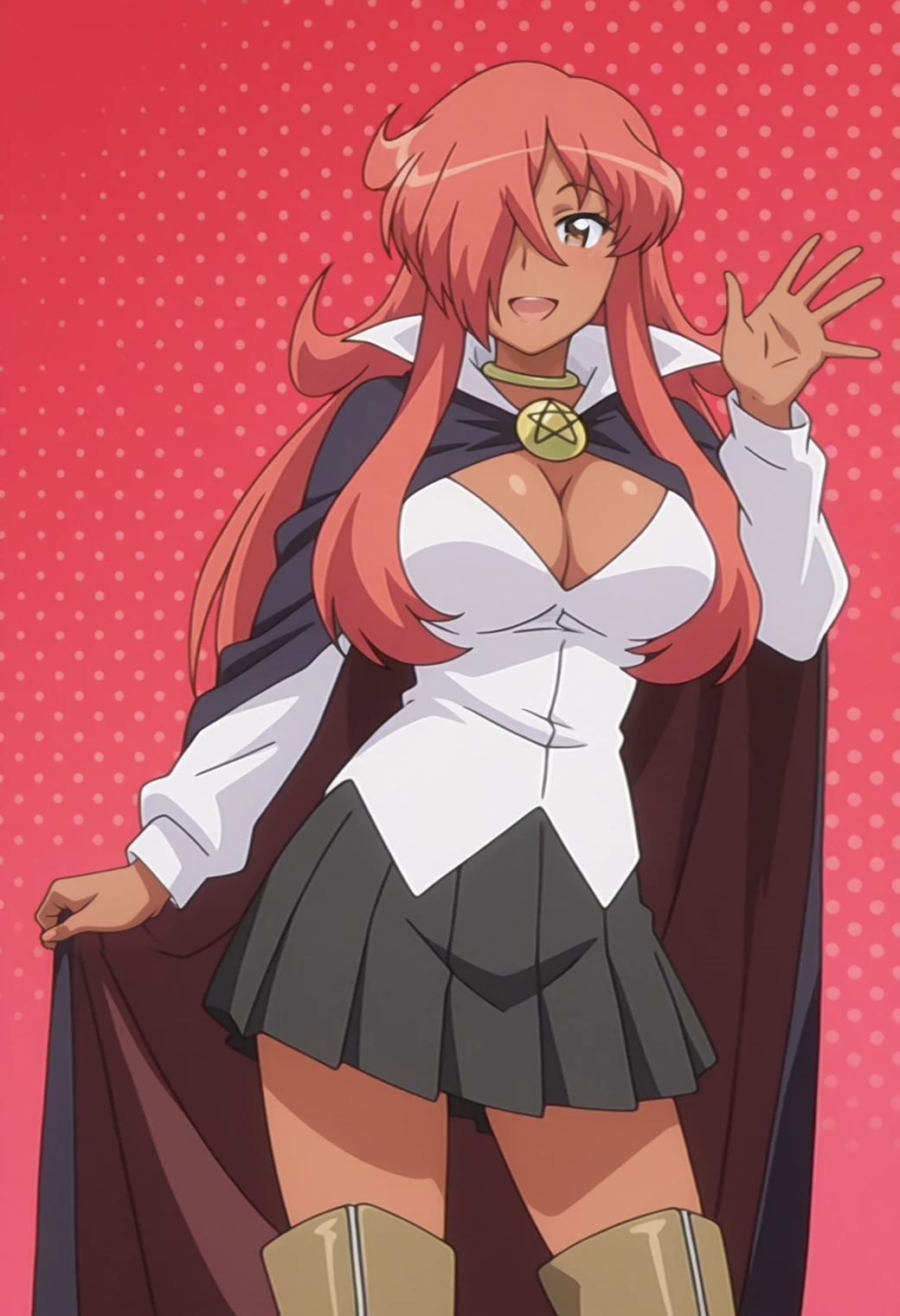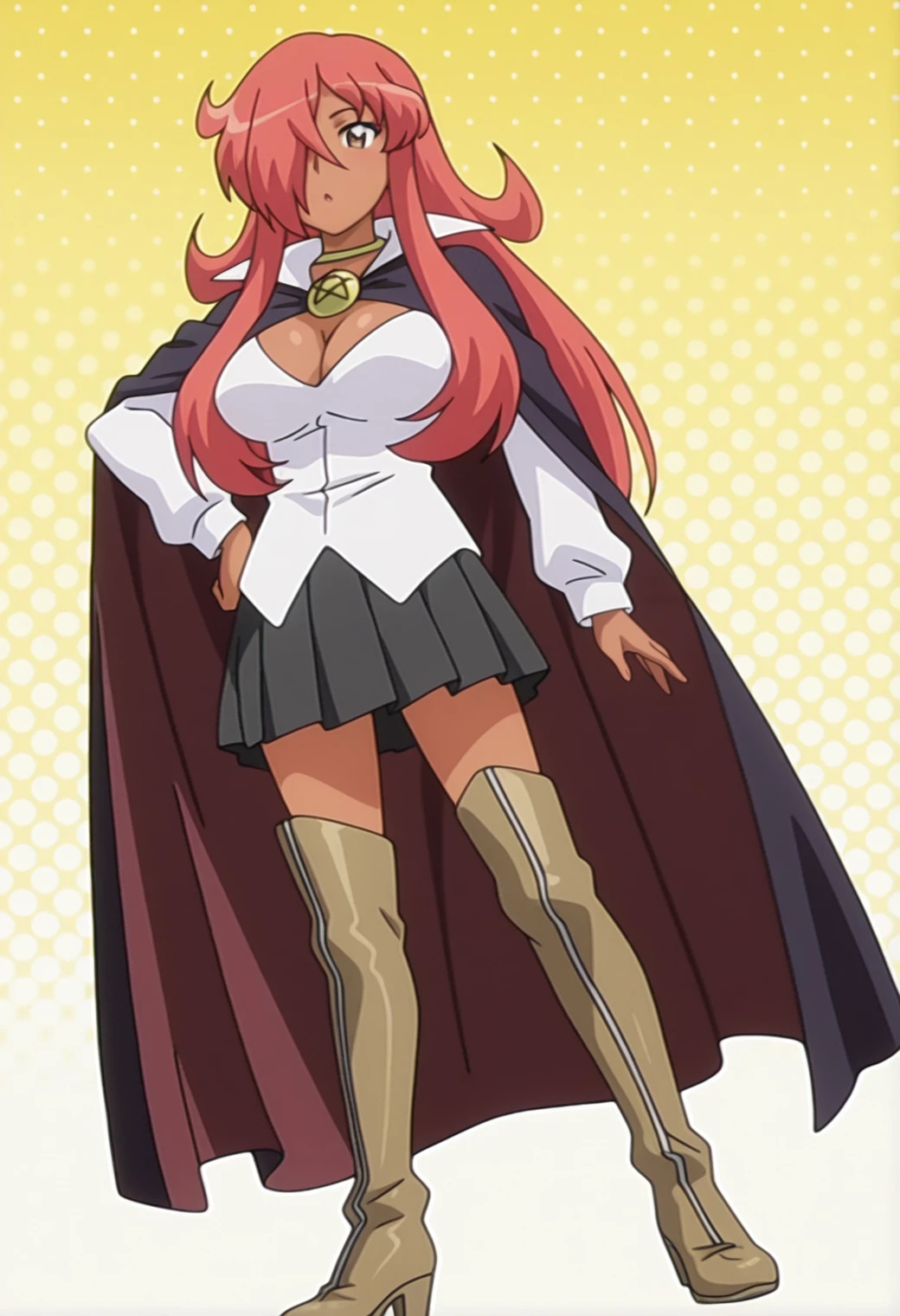 choker, cape, pentacle brooch, white shirt, long sleeves, cleavage, skirt, thigh boots