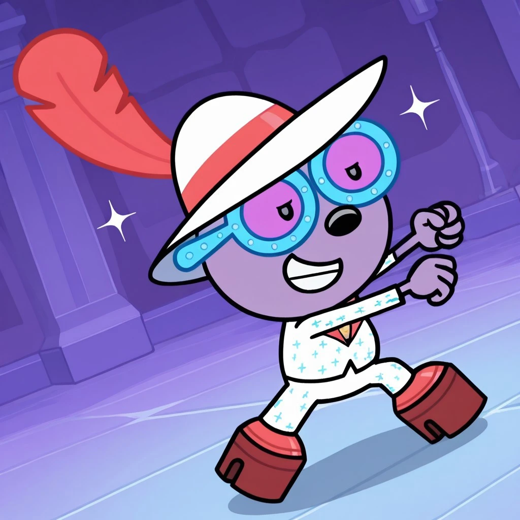 Tags (Mr.Cool): mrcool, furry male, bear, purple fur, long sleeves, white hat, red feather, hat feather, red shoes, white suit, blue glasses, necklace, tinted eyewear