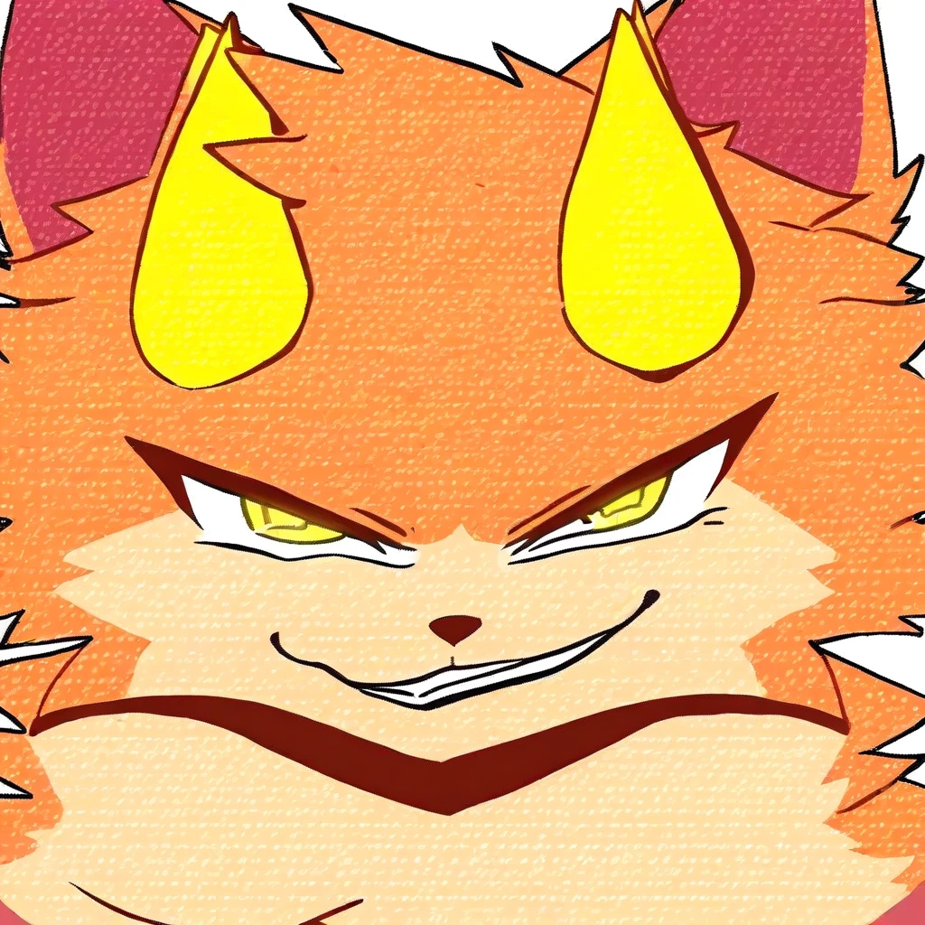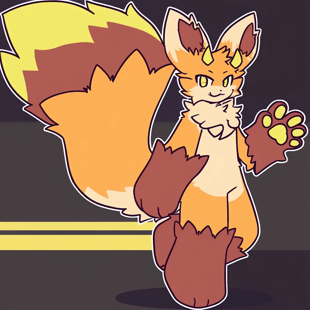 squirrel, furry, anthro, orange fur, brown details, animal ears, animal ears, yellow eyes, horns, yellow horns, yellow pawpads, tail, large tail, fluffy tail, yellow tail tip, fluffy