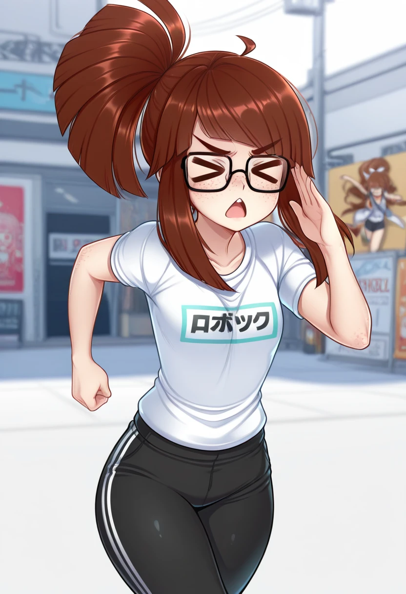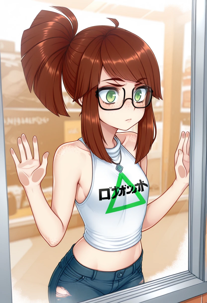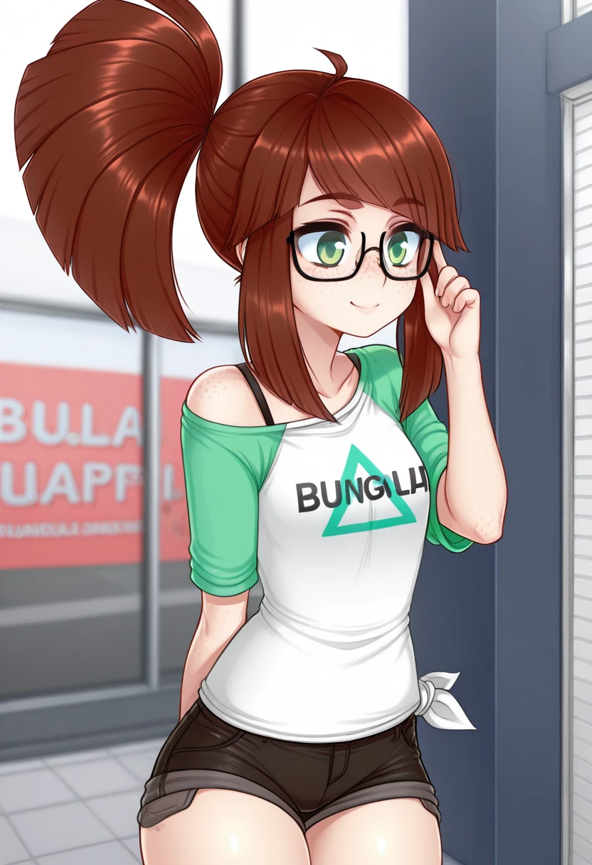 green eyes, brown hair, ponytail, high ponytail, long hair, freckles, glasses, black-framed eyewear, bangs, sidelocks, small breasts,I attempted to tag her outfits in the game as follows: