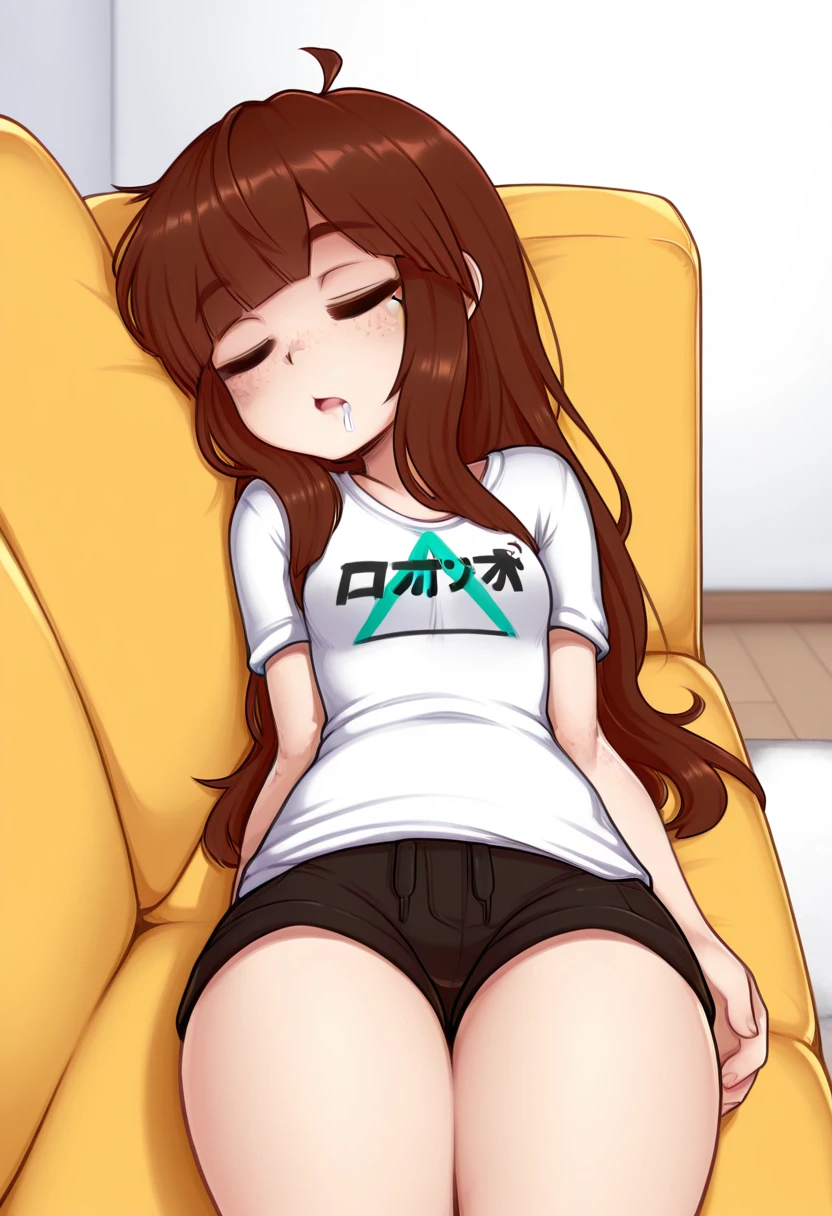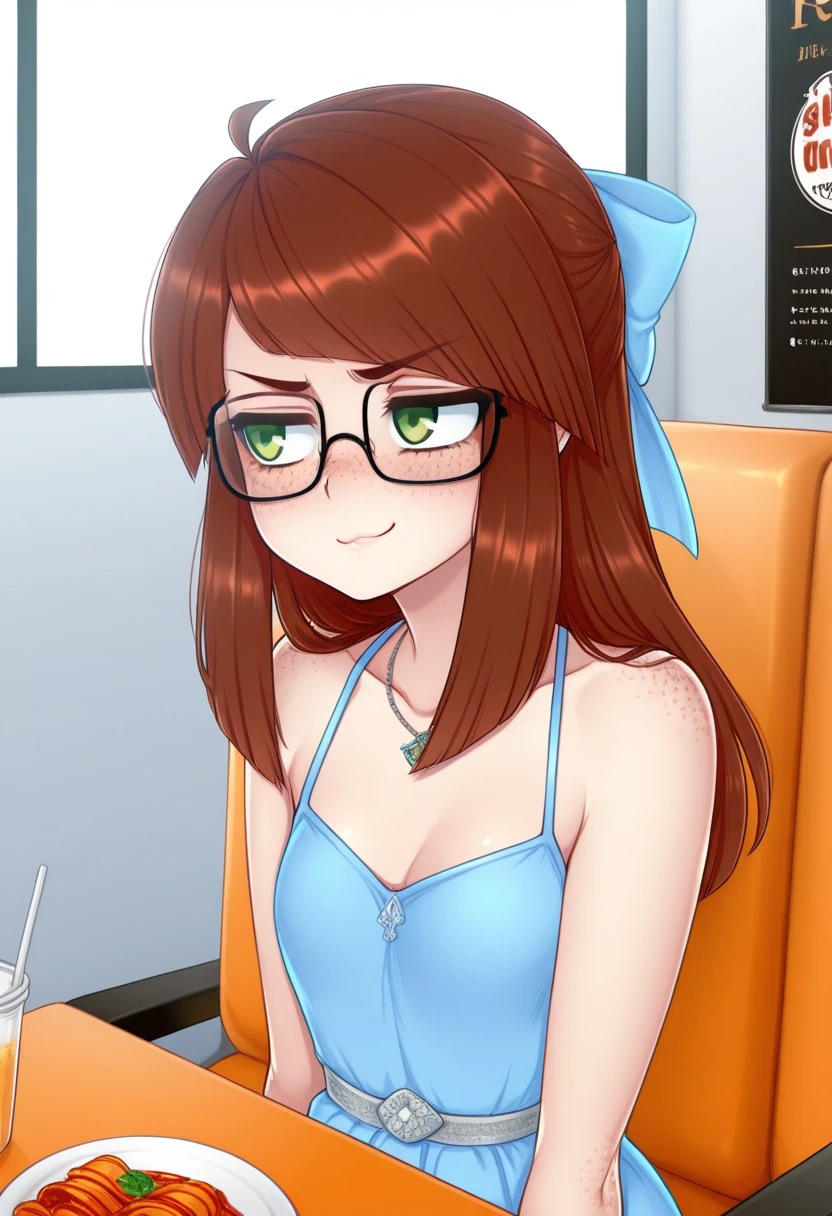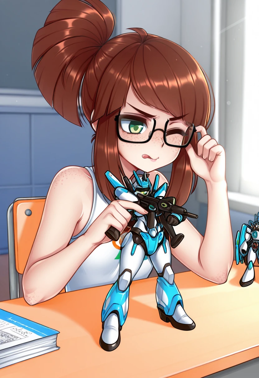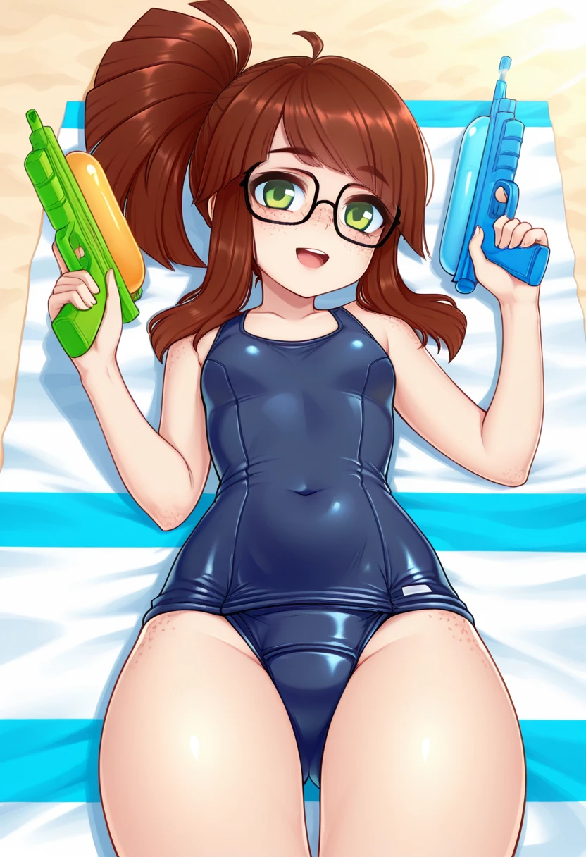 green eyes, brown hair, ponytail, high ponytail, long hair, freckles, glasses, black-framed eyewear, bangs, sidelocks, small breasts,I attempted to tag her outfits in the game as follows: