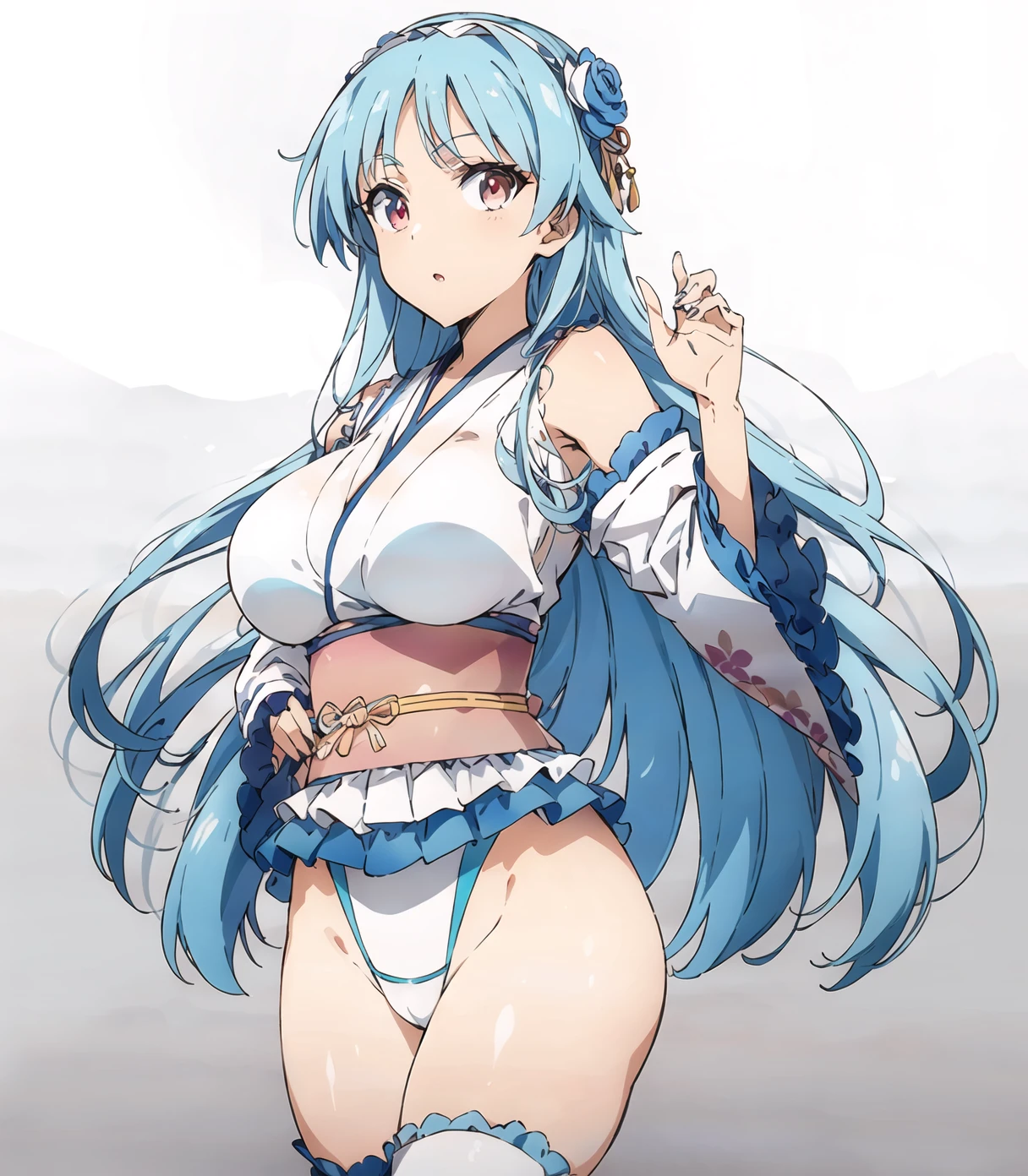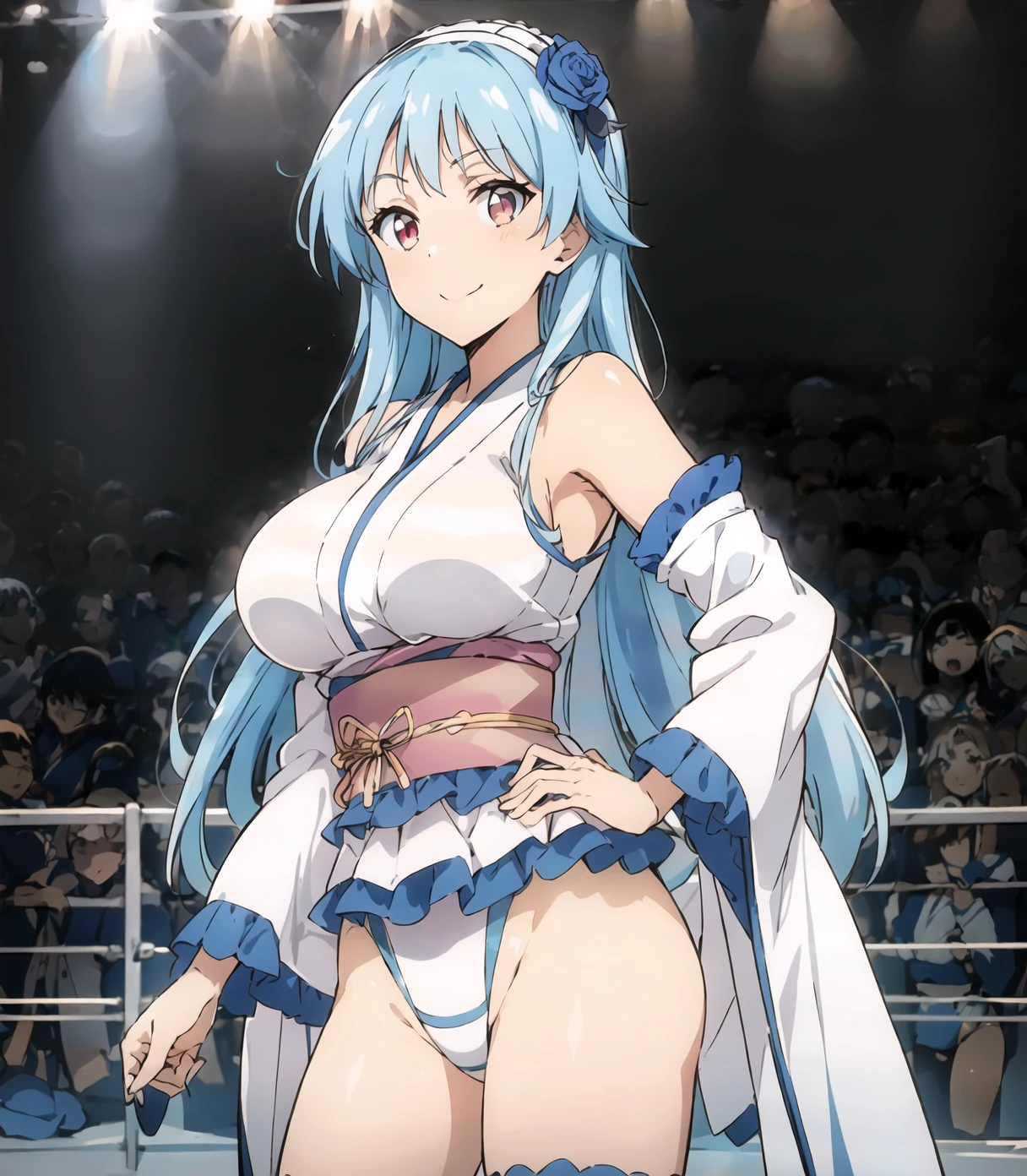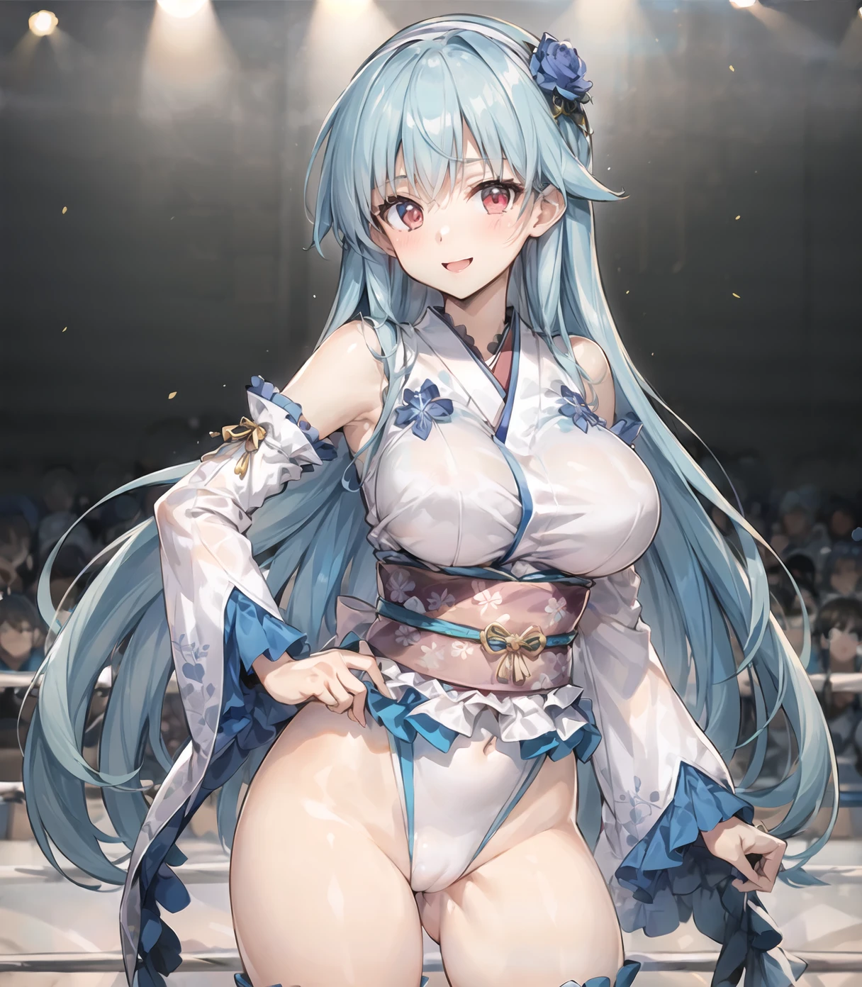 default outfit:long hair,japanese clothes,red eyes,hair flower,hair ornament,highleg leotard,breasts,blue hair,sash,obi,white thighs,detouched sleeves,wide sleeves,frills,wrestling outfit,large breast,bare shoulder,hairband,upturned eyes,white leotard,blue trim