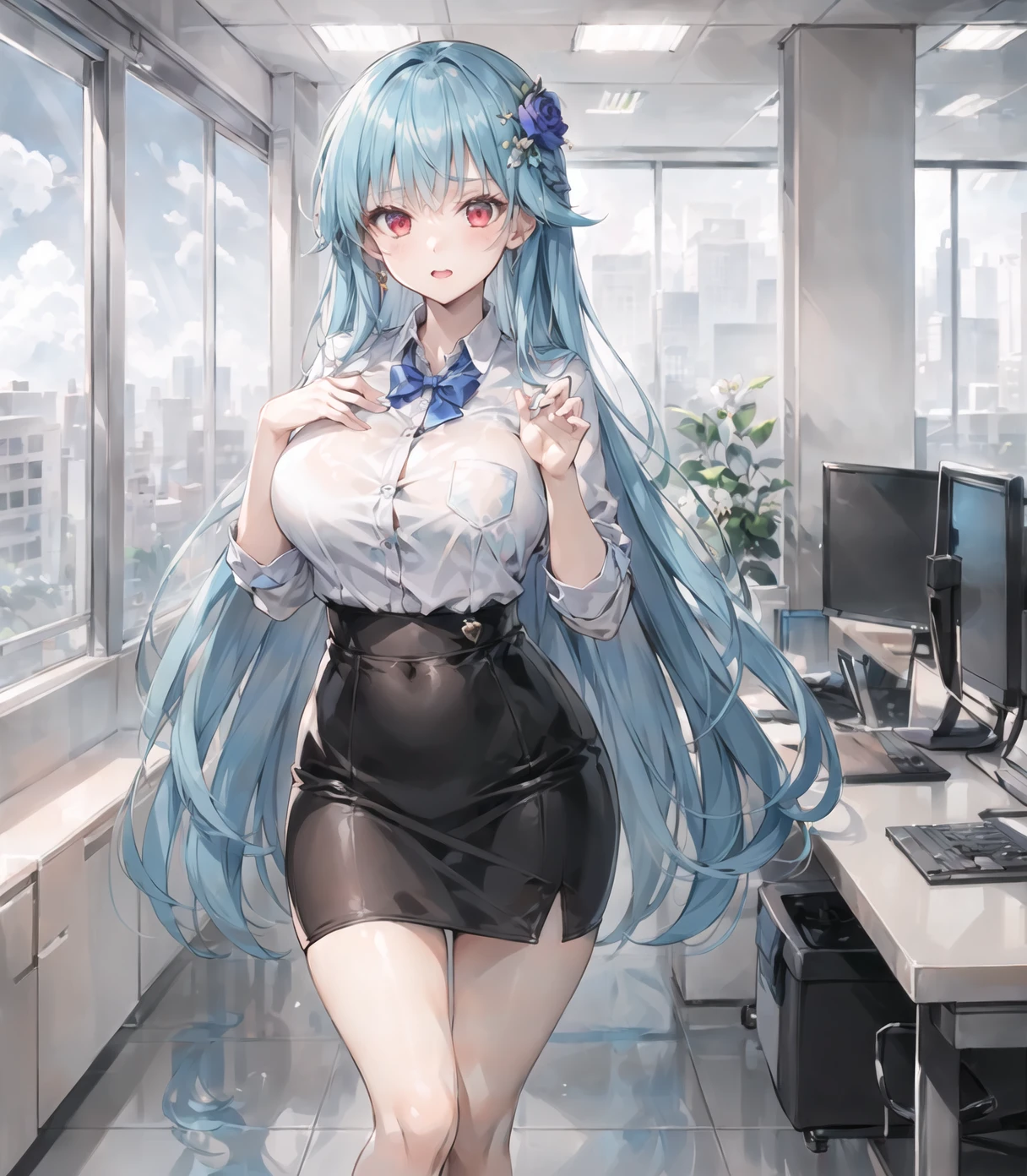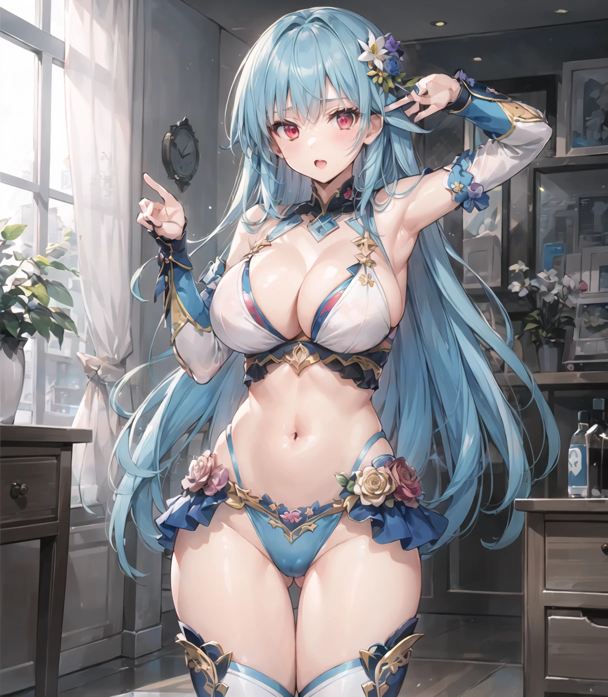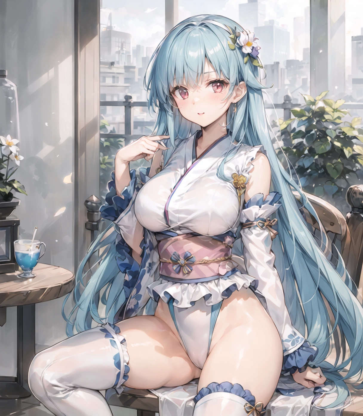 default outfit:long hair,japanese clothes,red eyes,hair flower,hair ornament,highleg leotard,breasts,blue hair,sash,obi,white thighs,detouched sleeves,wide sleeves,frills,wrestling outfit,large breast,bare shoulder,hairband,upturned eyes,white leotard,blue trim